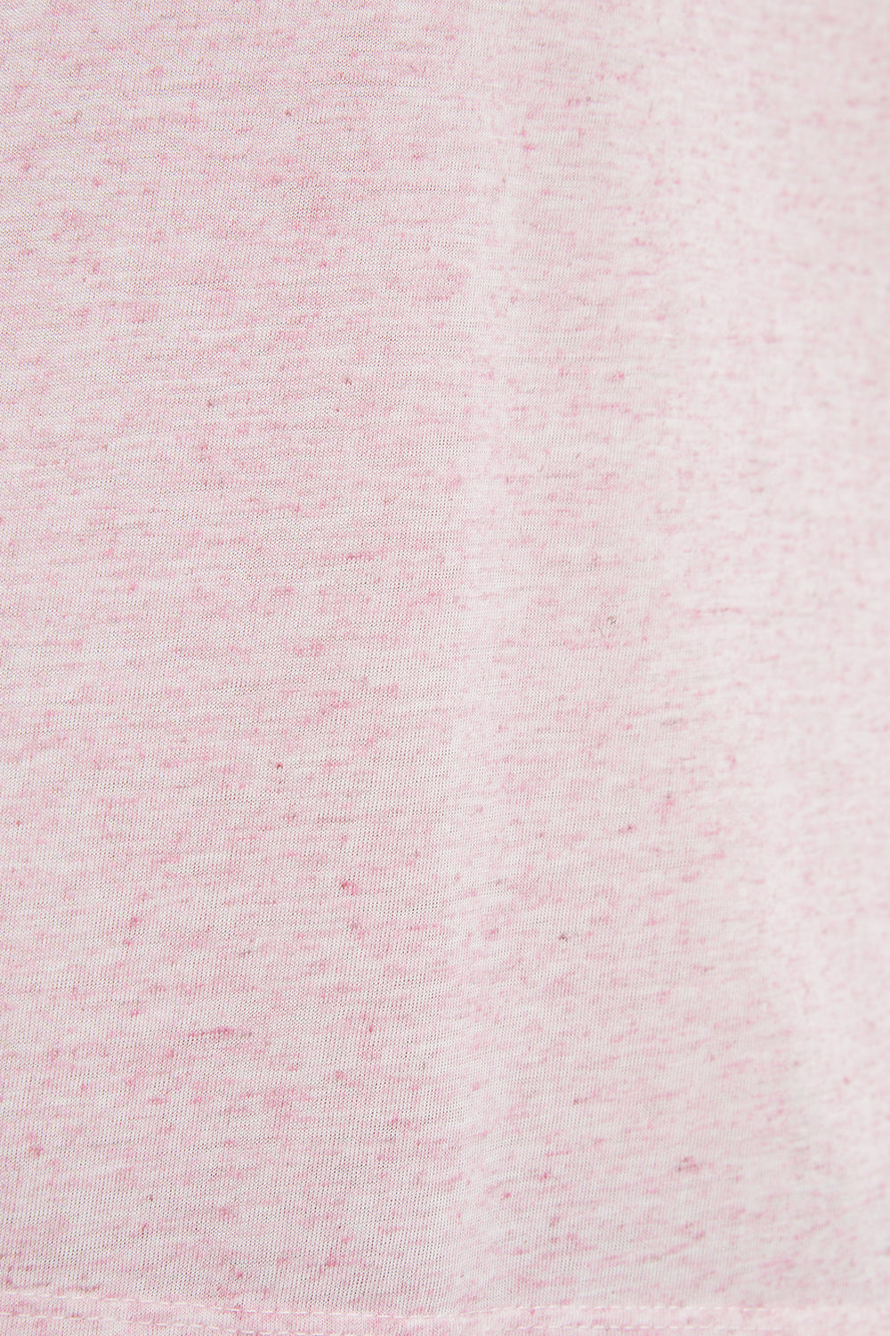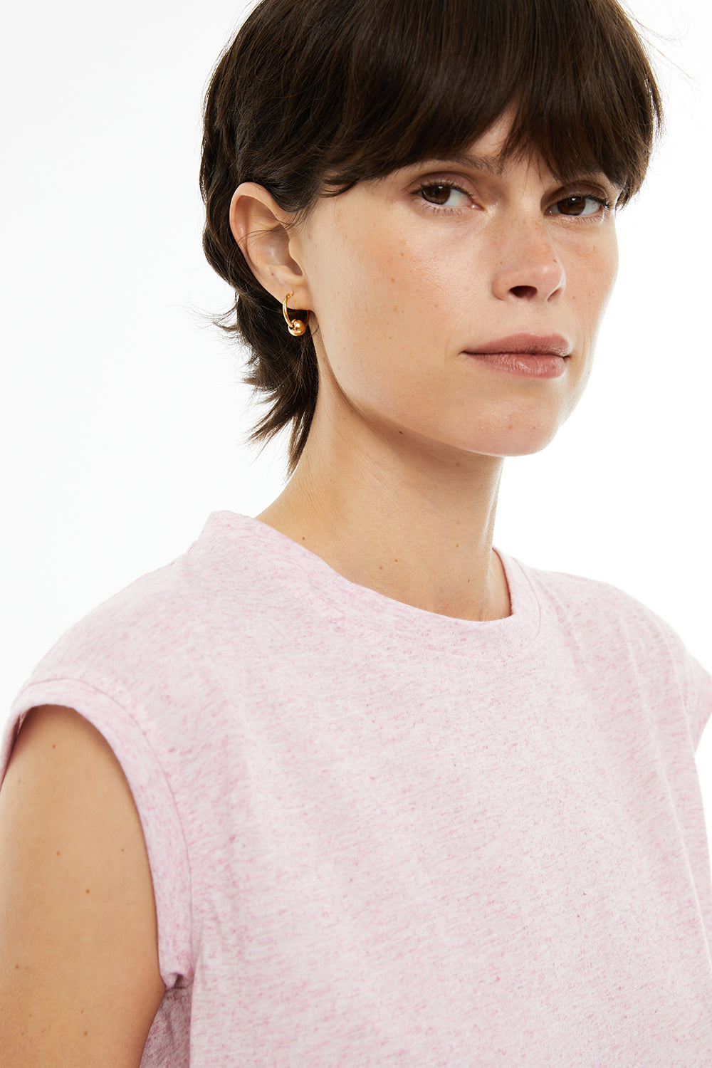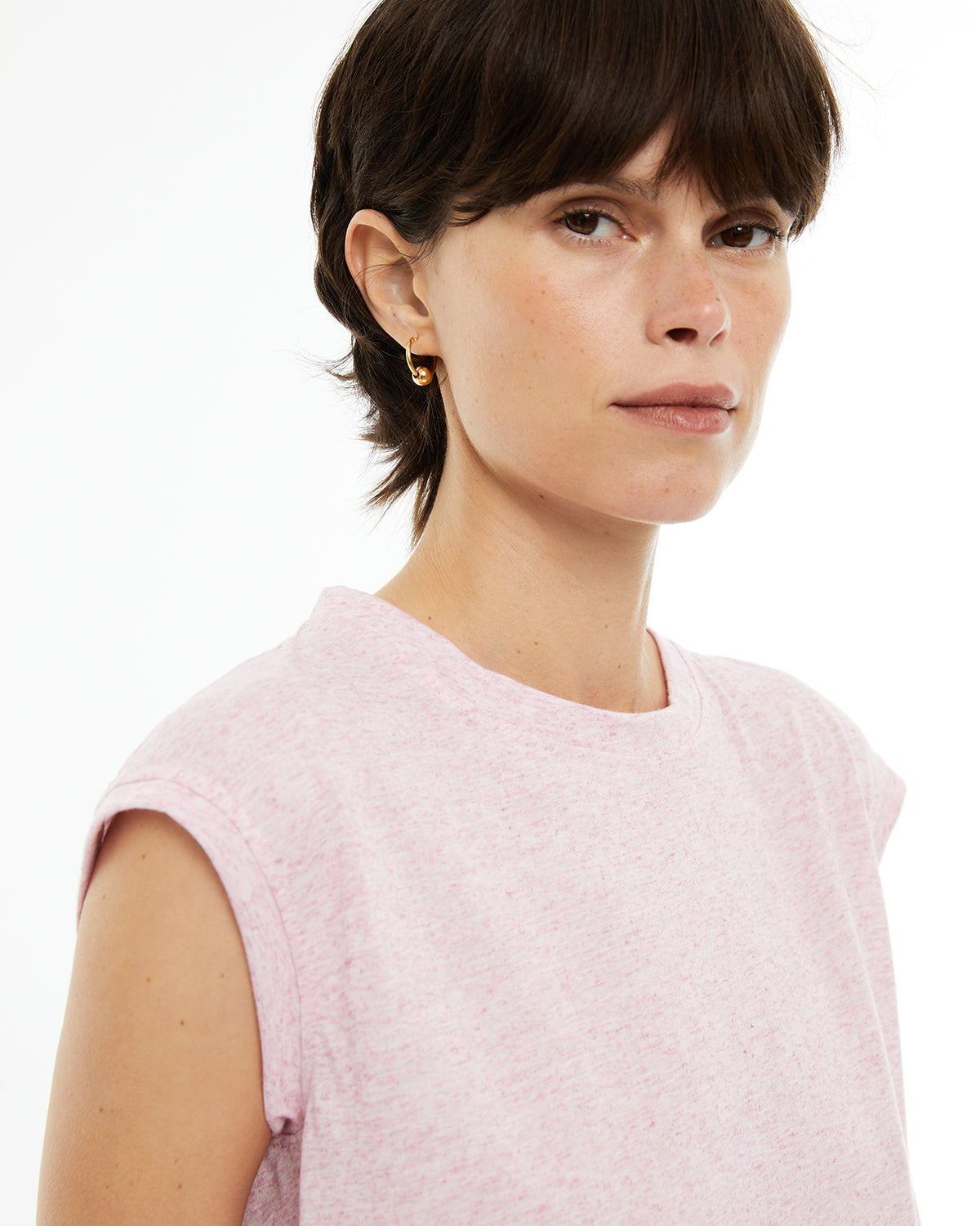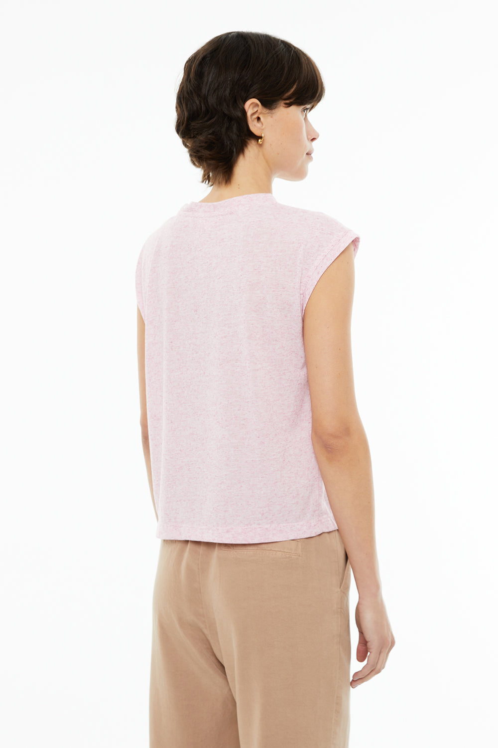Camiseta de mujer, cuello redondo, sin mangas, con tejido de flamé.