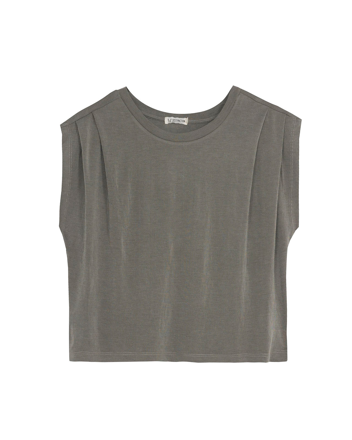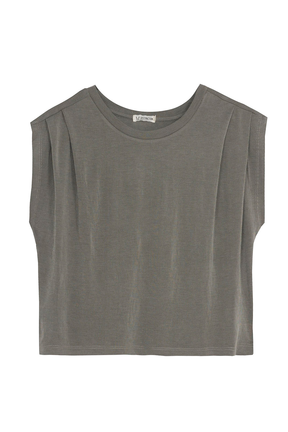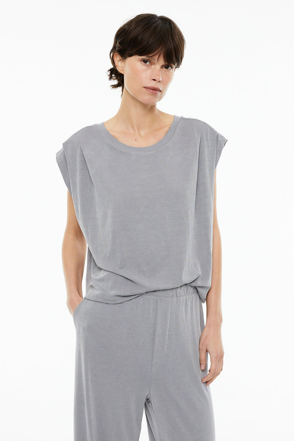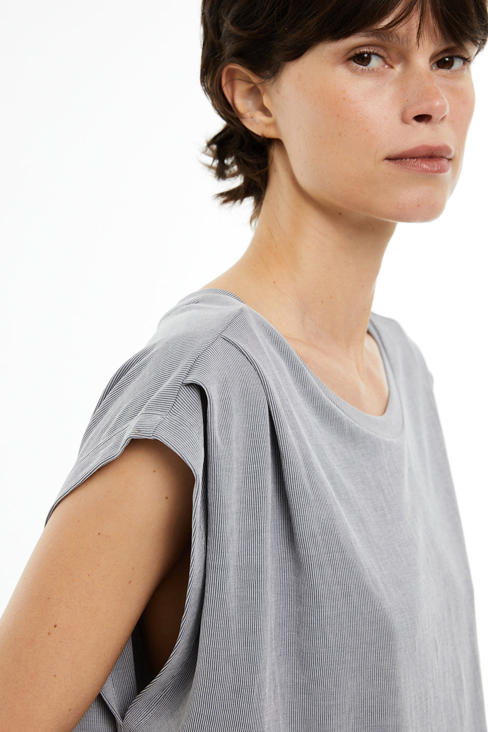 Camiseta de mujer oversize con cuello redondo, costura hombros adelantada, con pliegues y sin mangas.