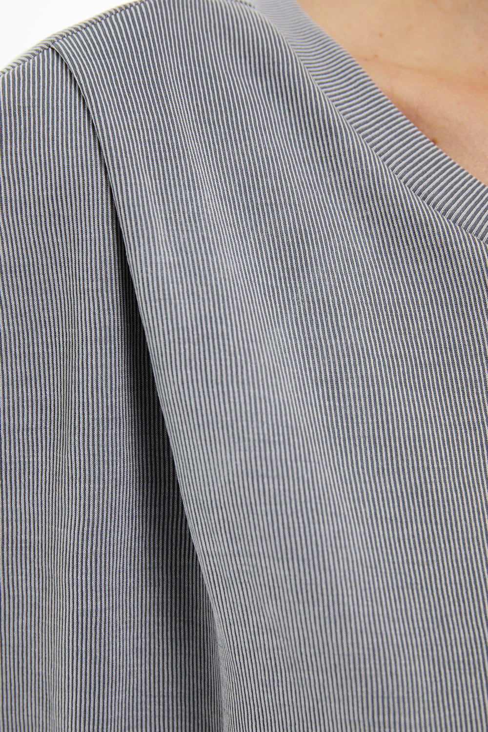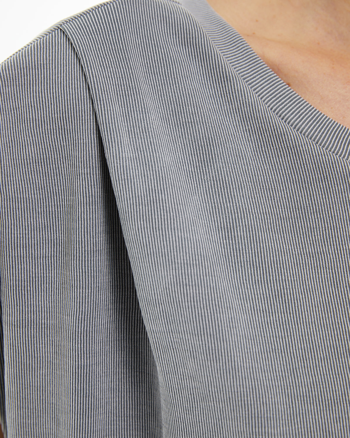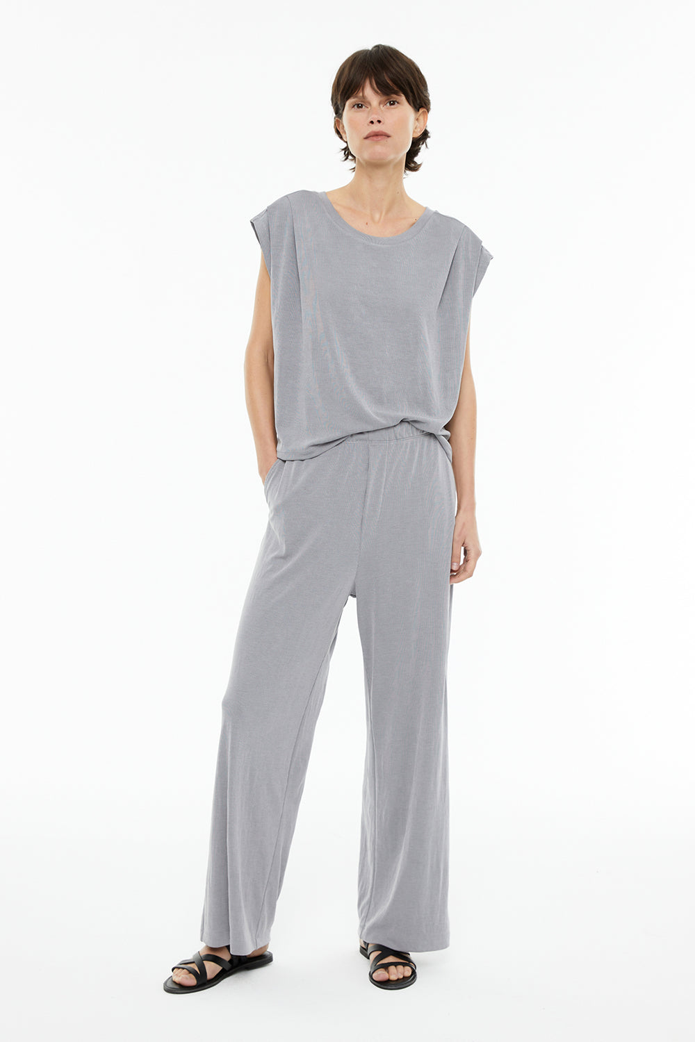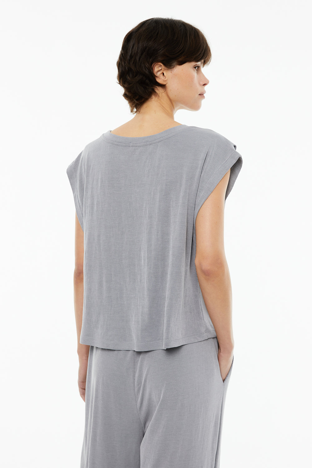 Camiseta de mujer oversize con cuello redondo, costura hombros adelantada, con pliegues y sin mangas.