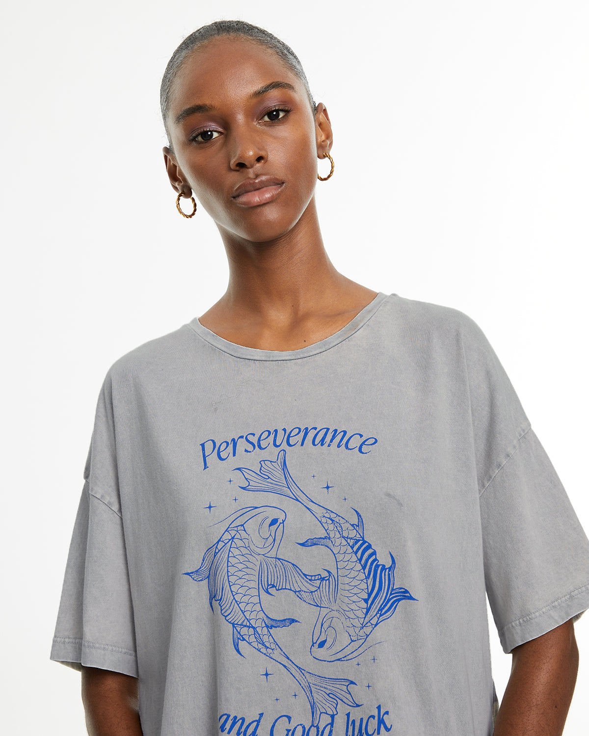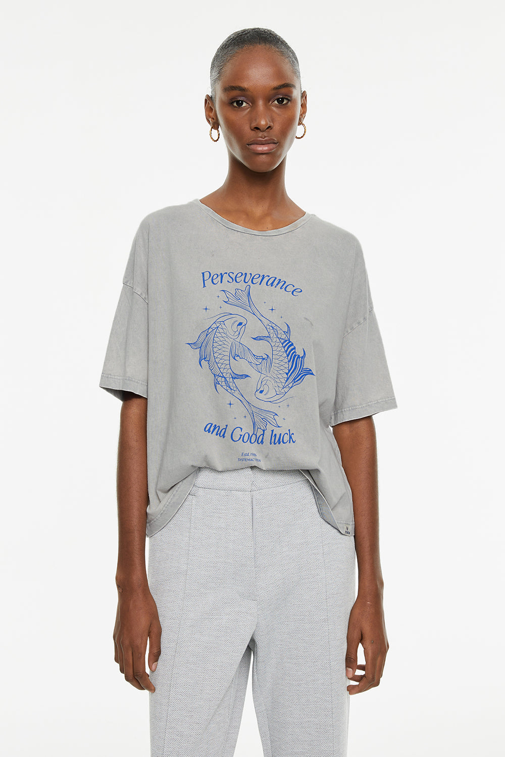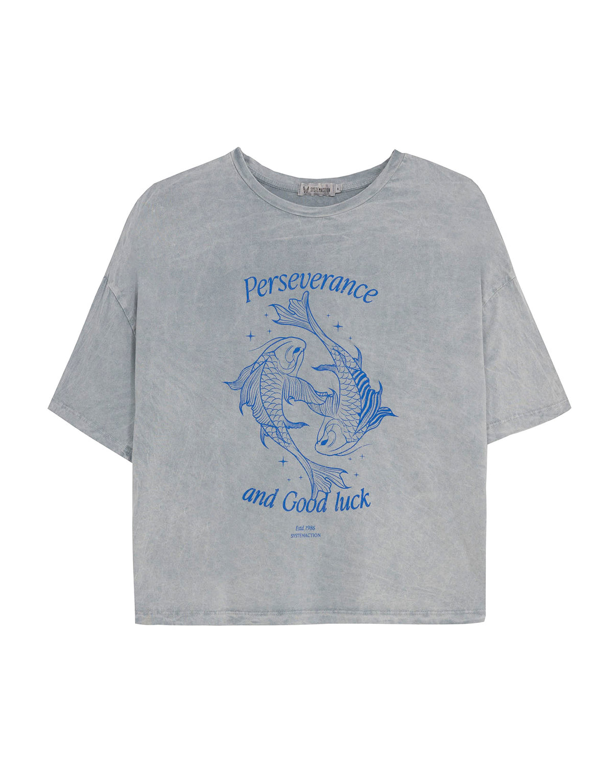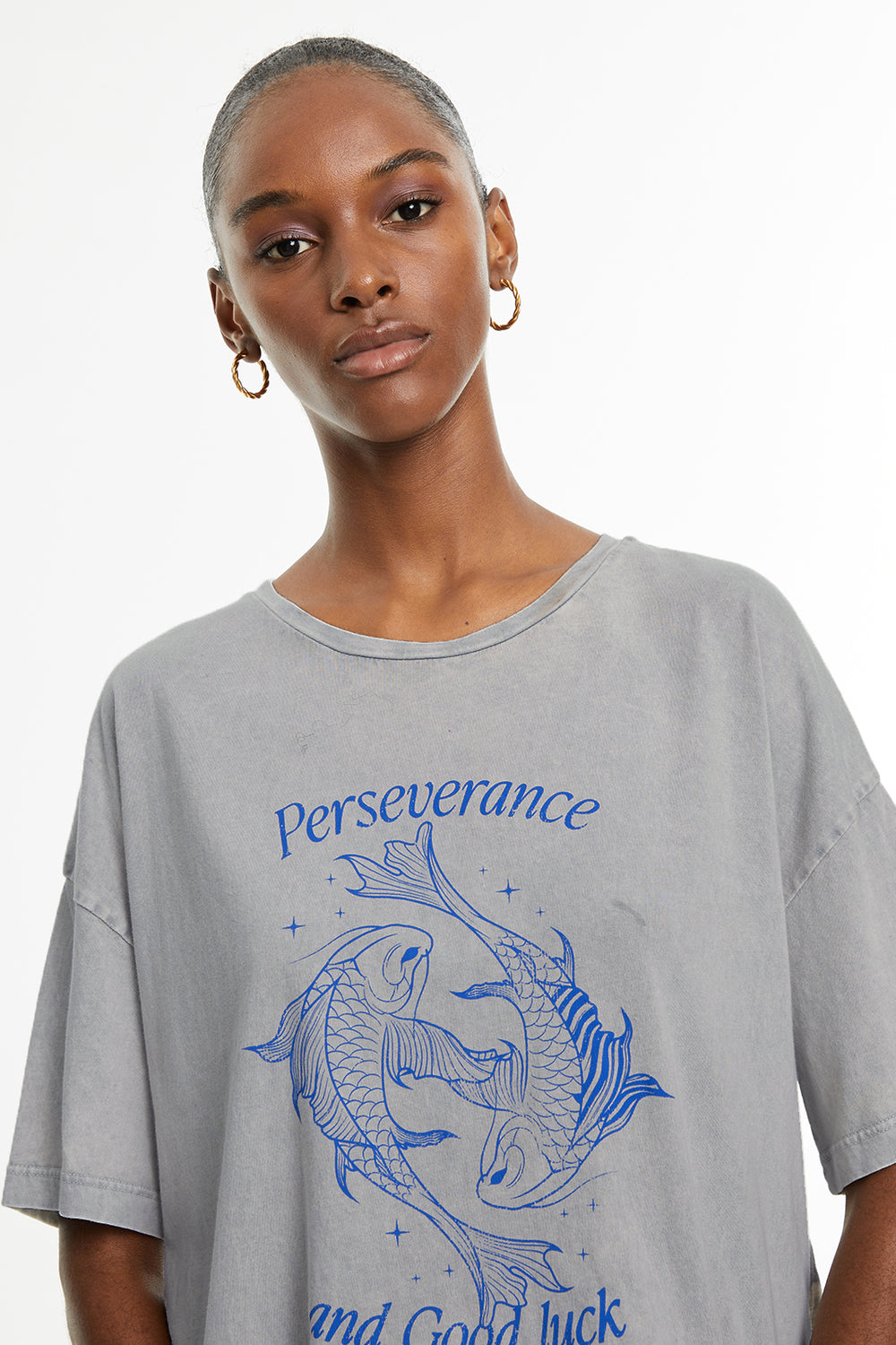 Camiseta de mujer de algodón orgánico, fit oversize, de manga corta y cuello redondo con estampado de peces y texto. Tinte especial efecto desgastado. Prenda sostenible.
