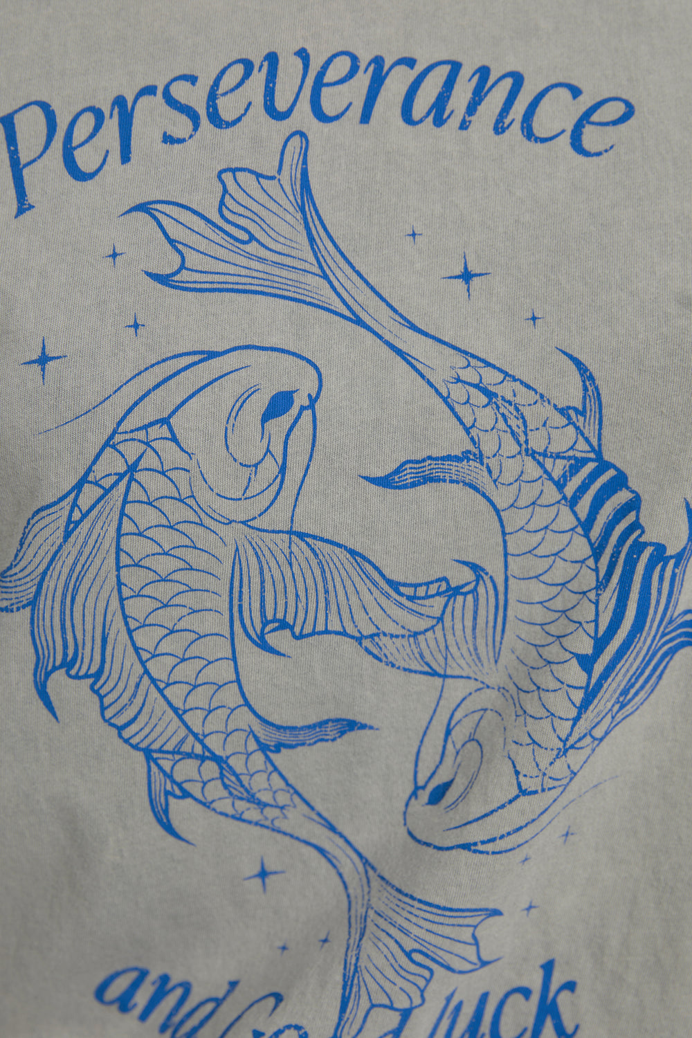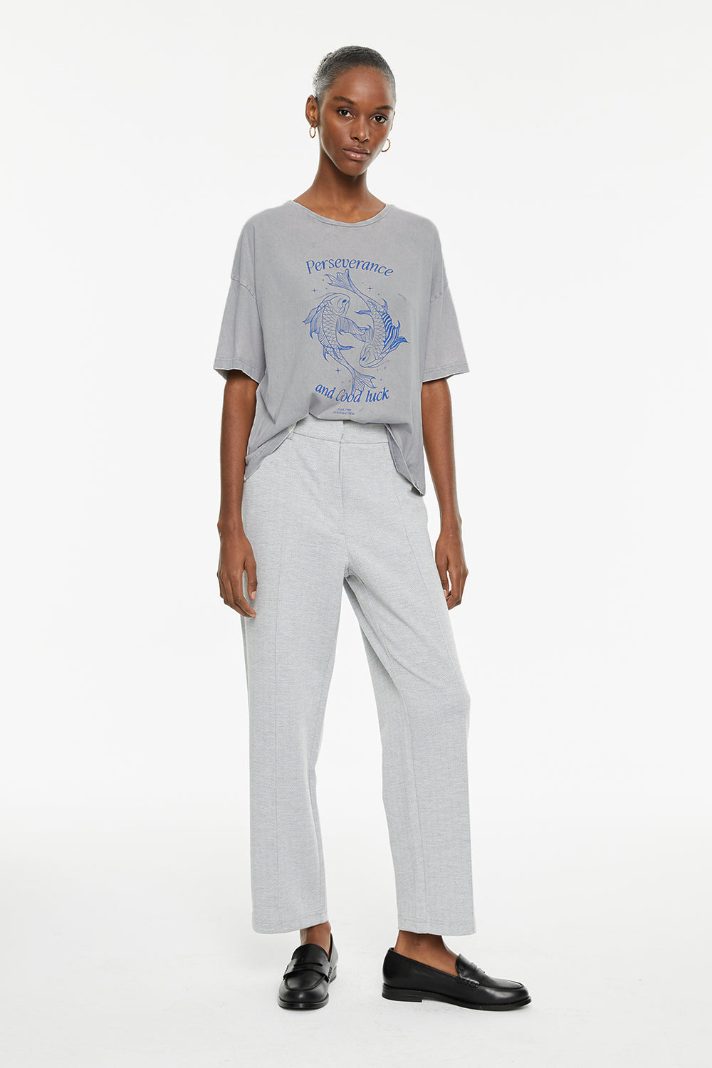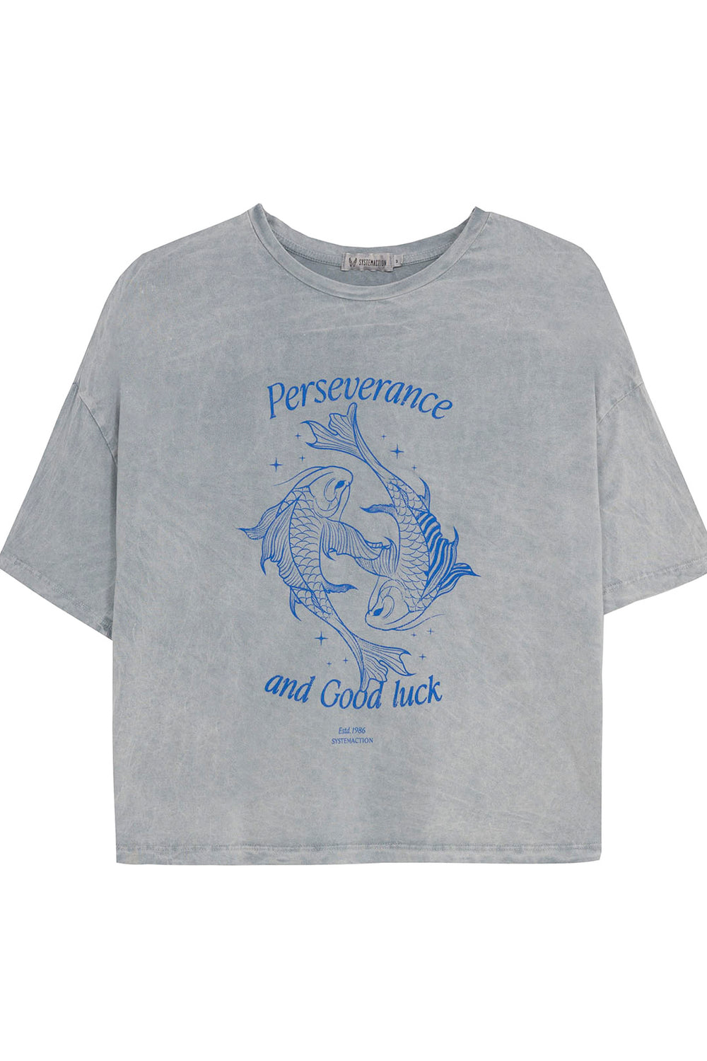 Camiseta de mujer de algodón orgánico, fit oversize, de manga corta y cuello redondo con estampado de peces y texto. Tinte especial efecto desgastado. Prenda sostenible.