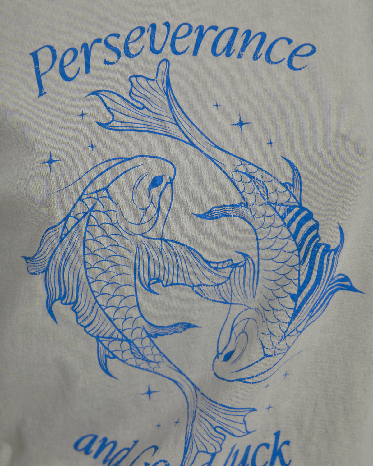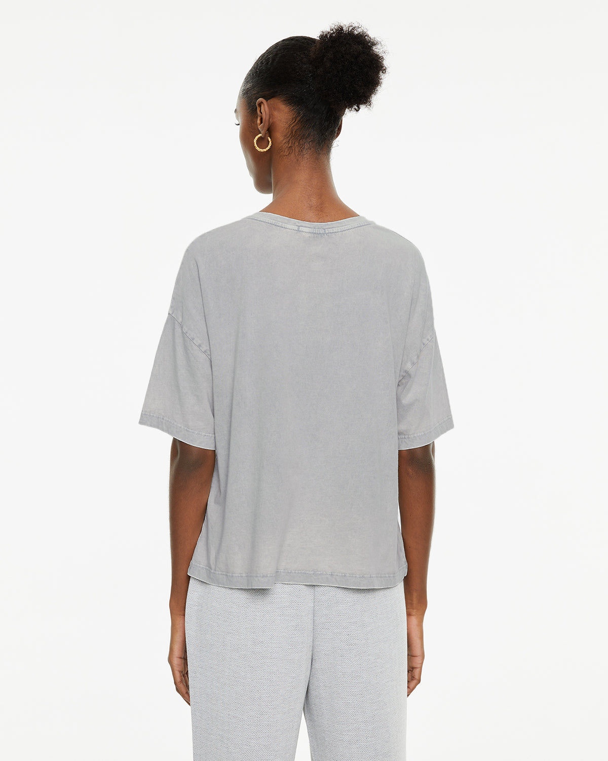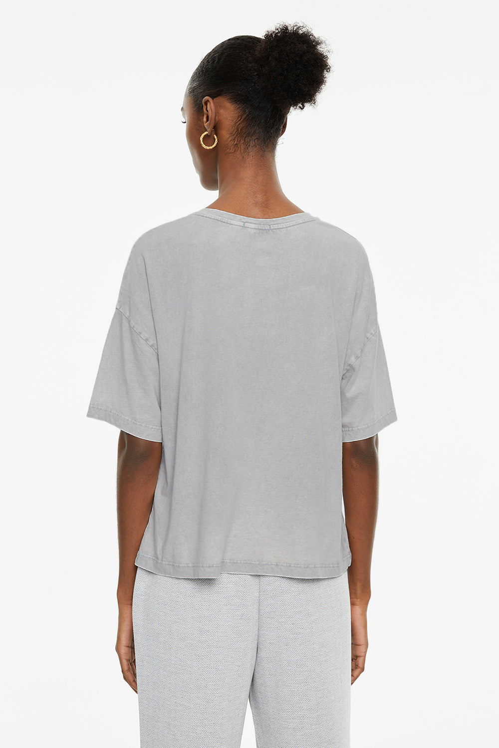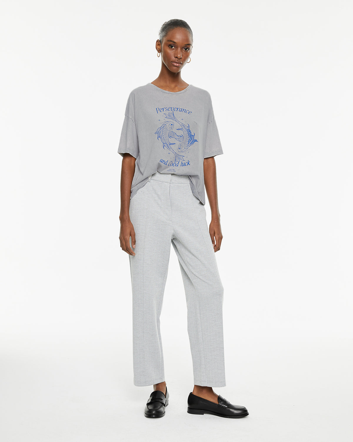 Camiseta de mujer de algodón orgánico, fit oversize, de manga corta y cuello redondo con estampado de peces y texto. Tinte especial efecto desgastado. Prenda sostenible.