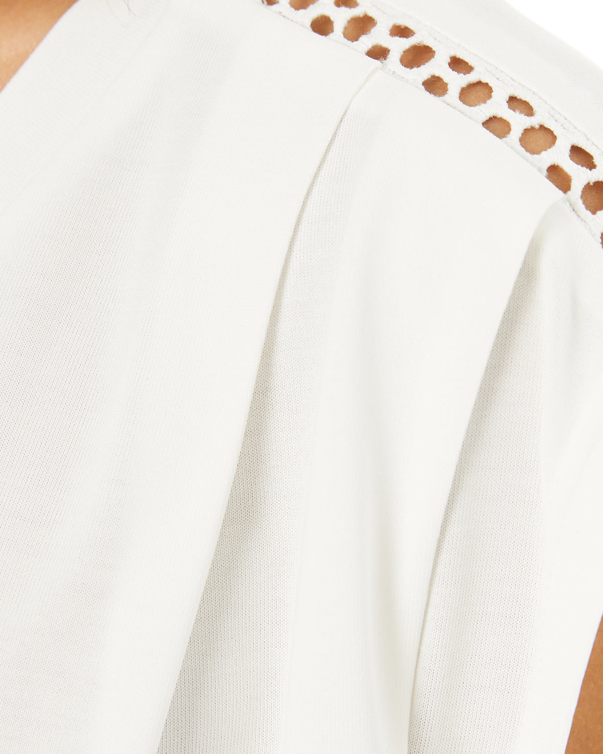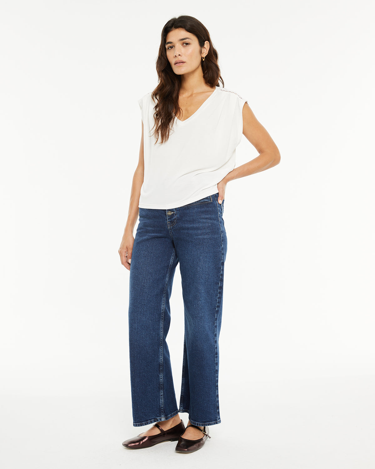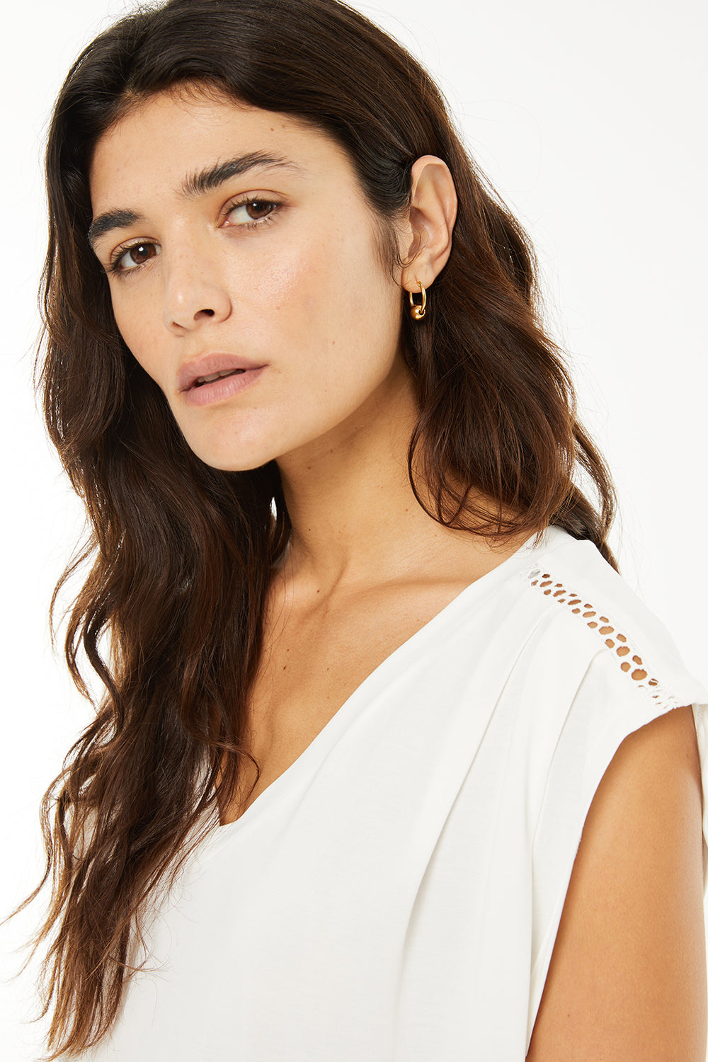 Camiseta fluida de mujer, con cuello pico y detalle de entredós en los hombros. Prenda sostenible.