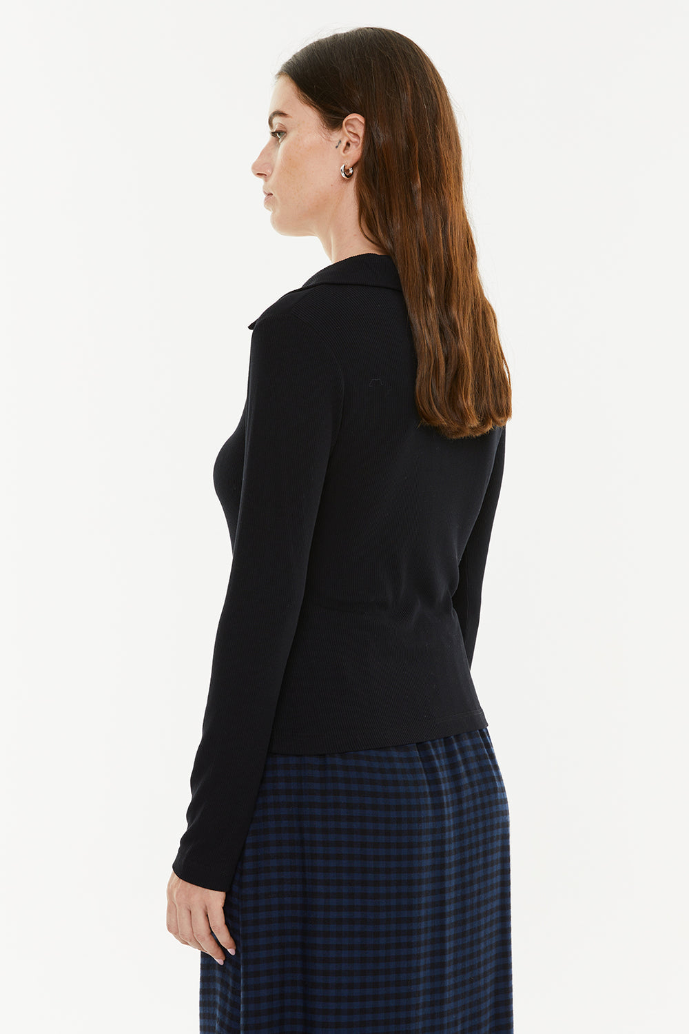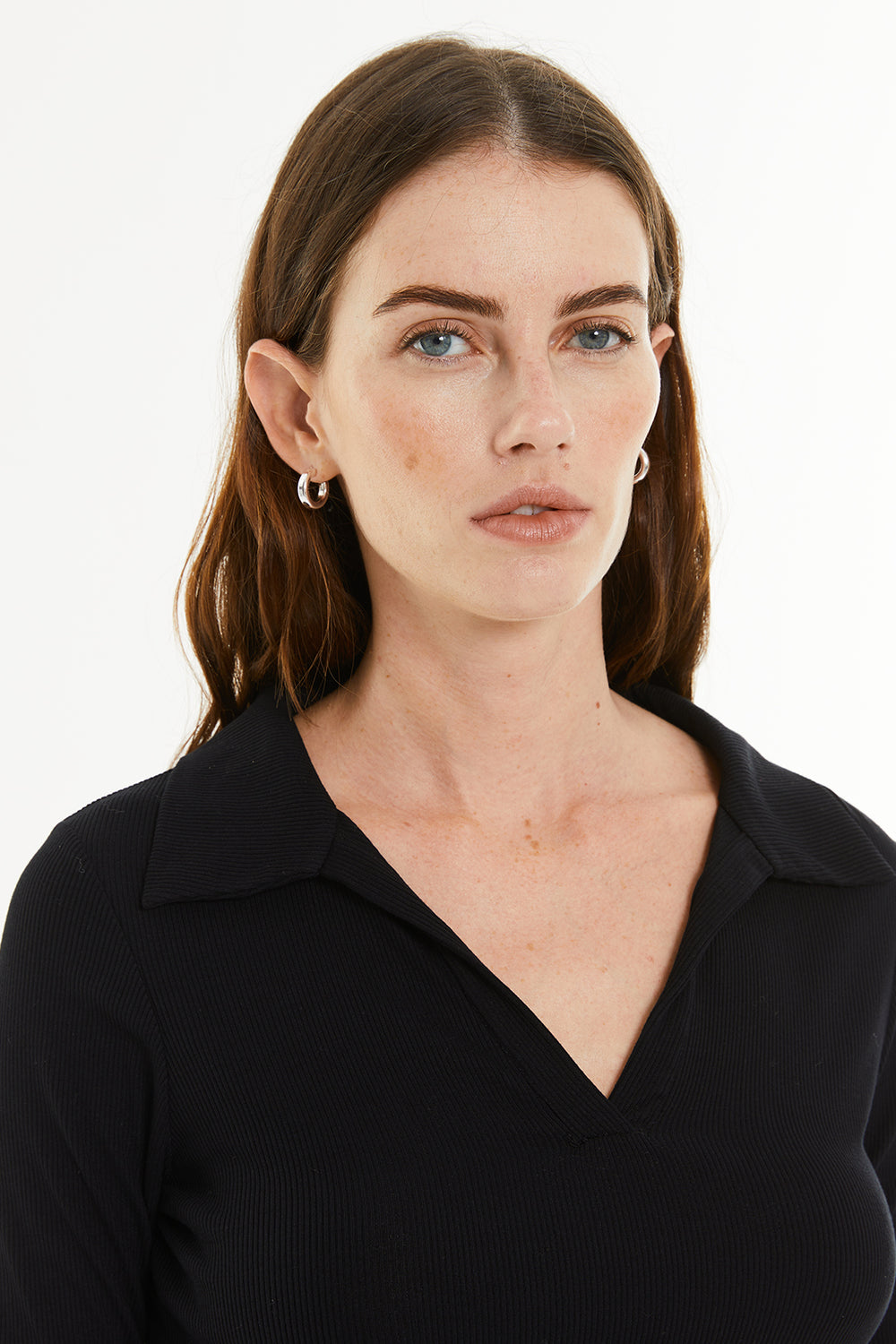 Camiseta de mujer con escote polo y tejido de canalé. Prenda sostenible.