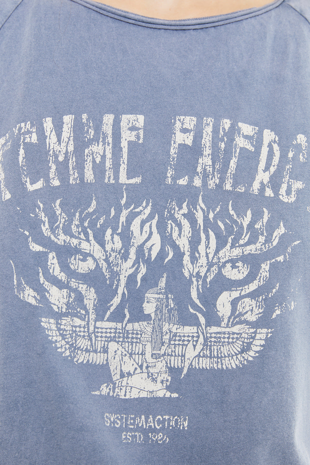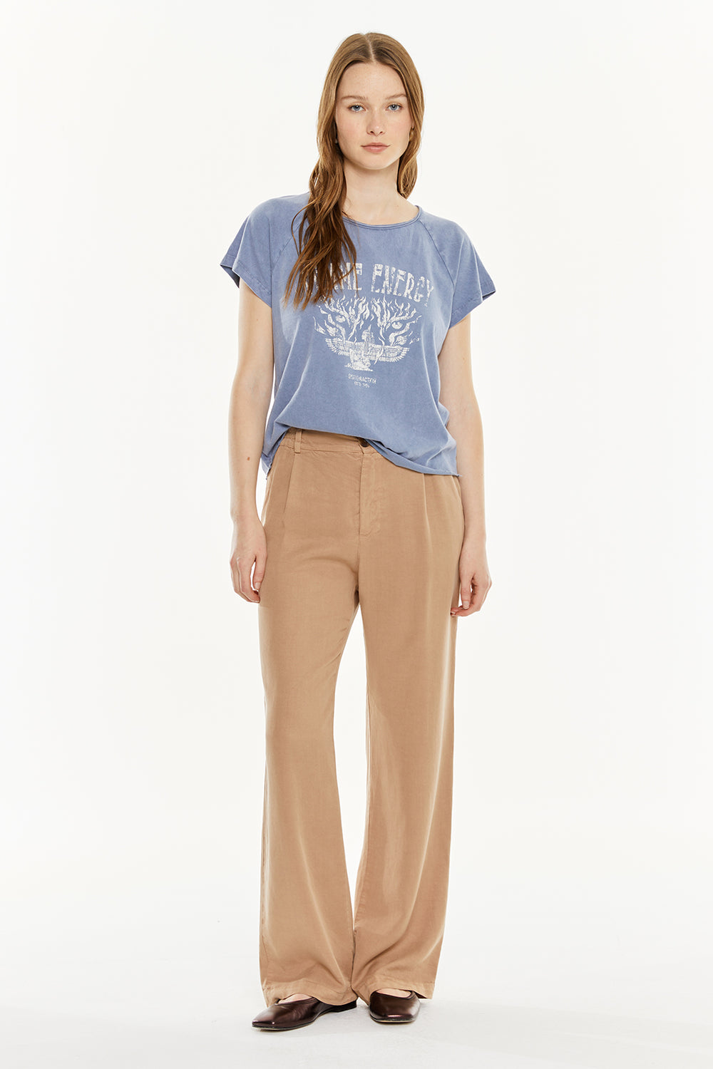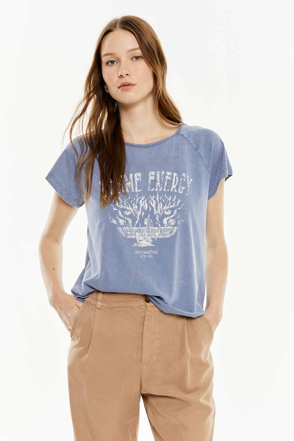 Camiseta de mujer de manga corta, con tintura efecto desgastado y estampado de una mujer. Prenda sostenible.