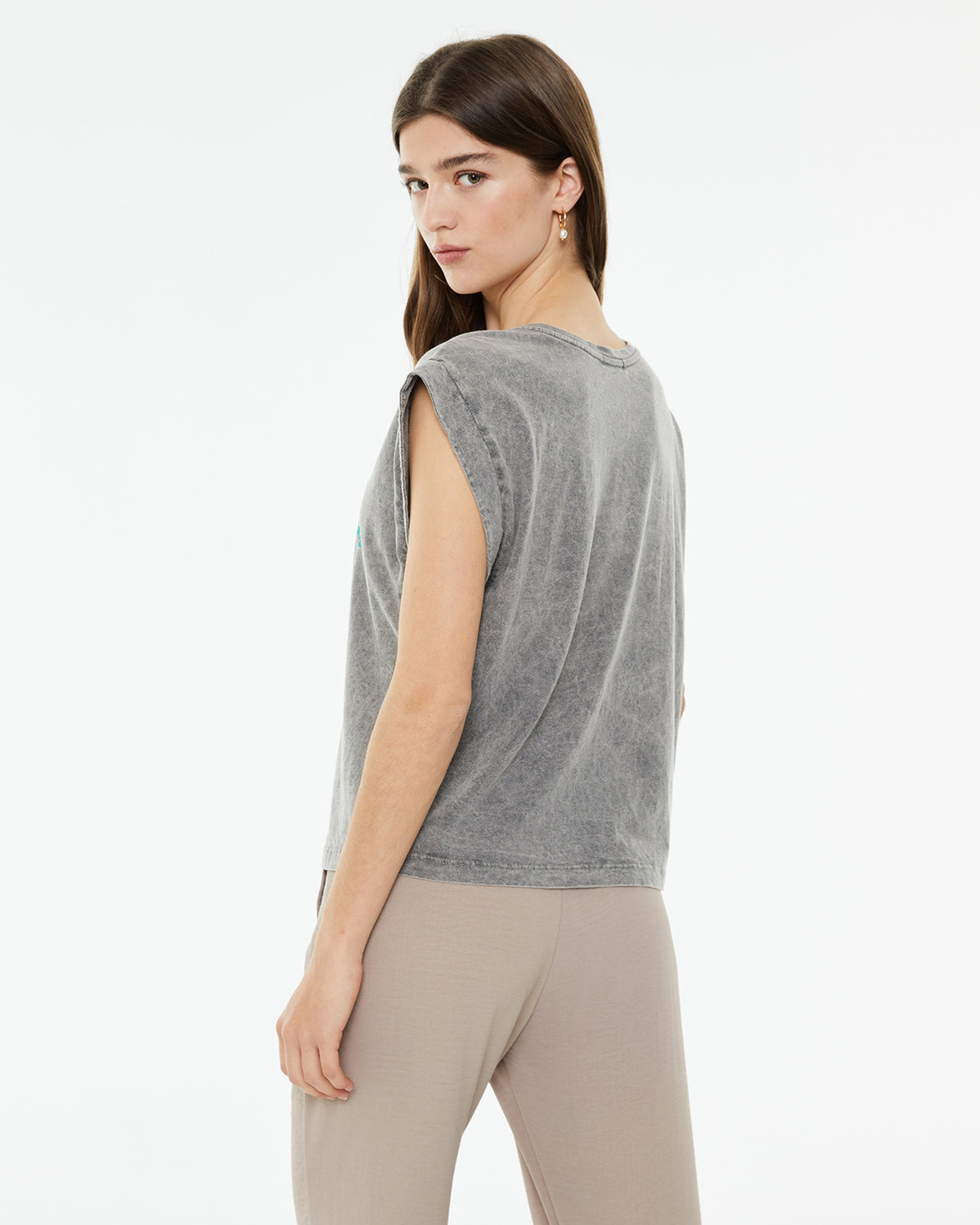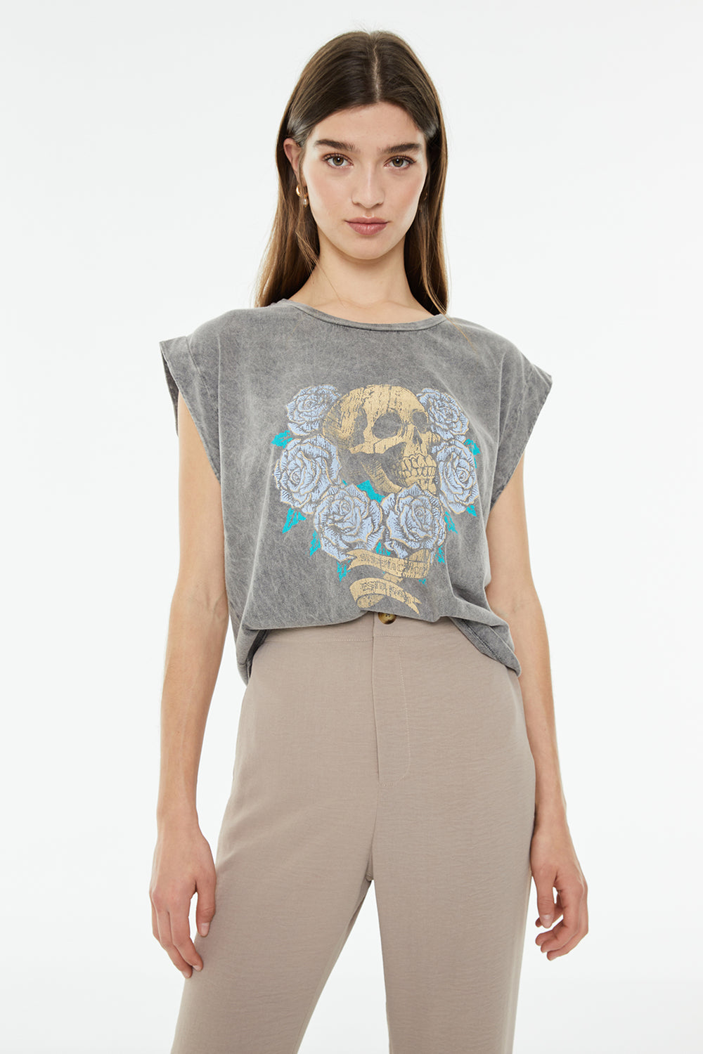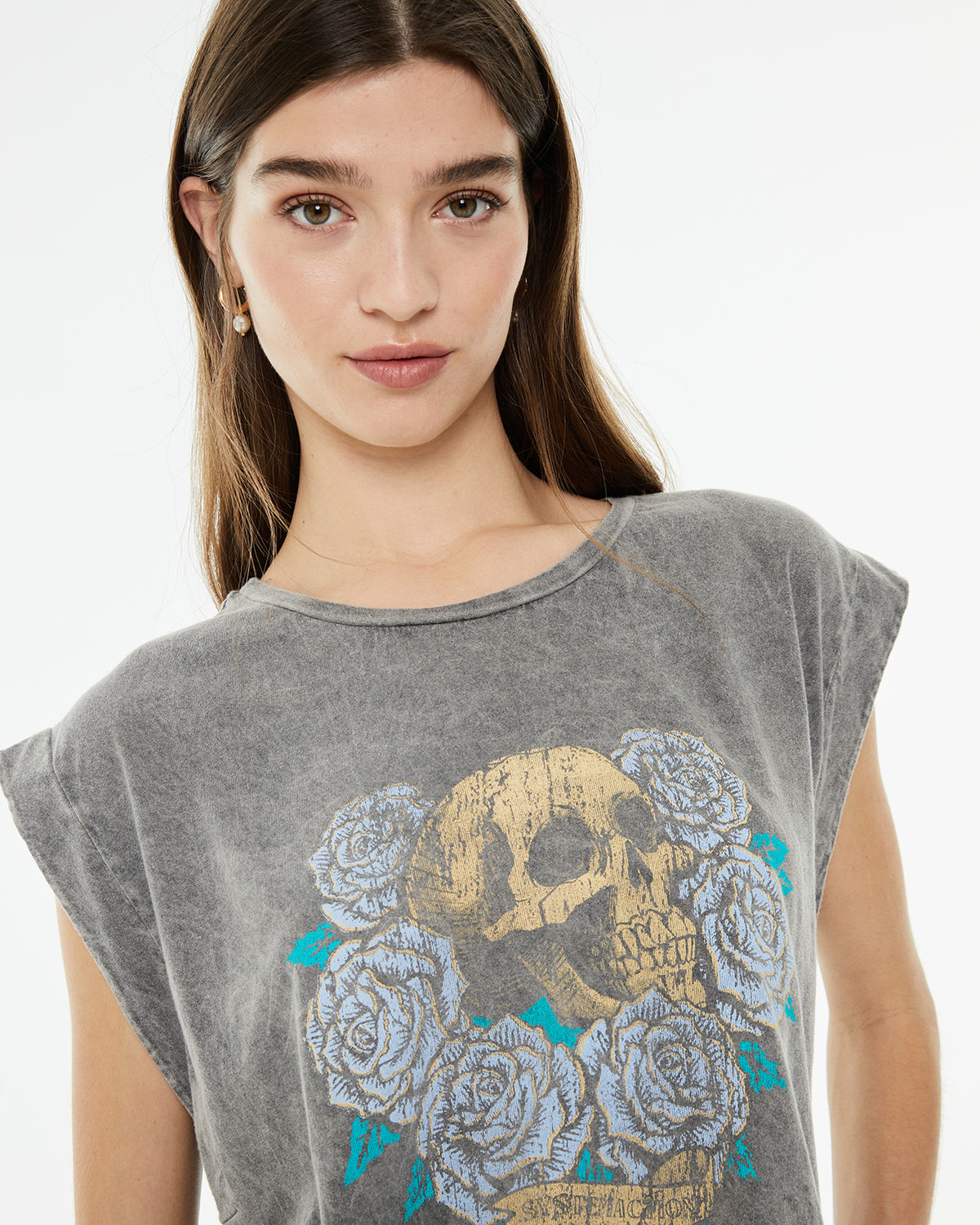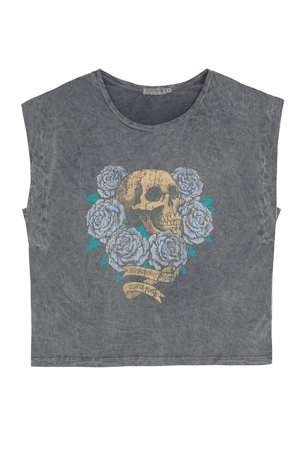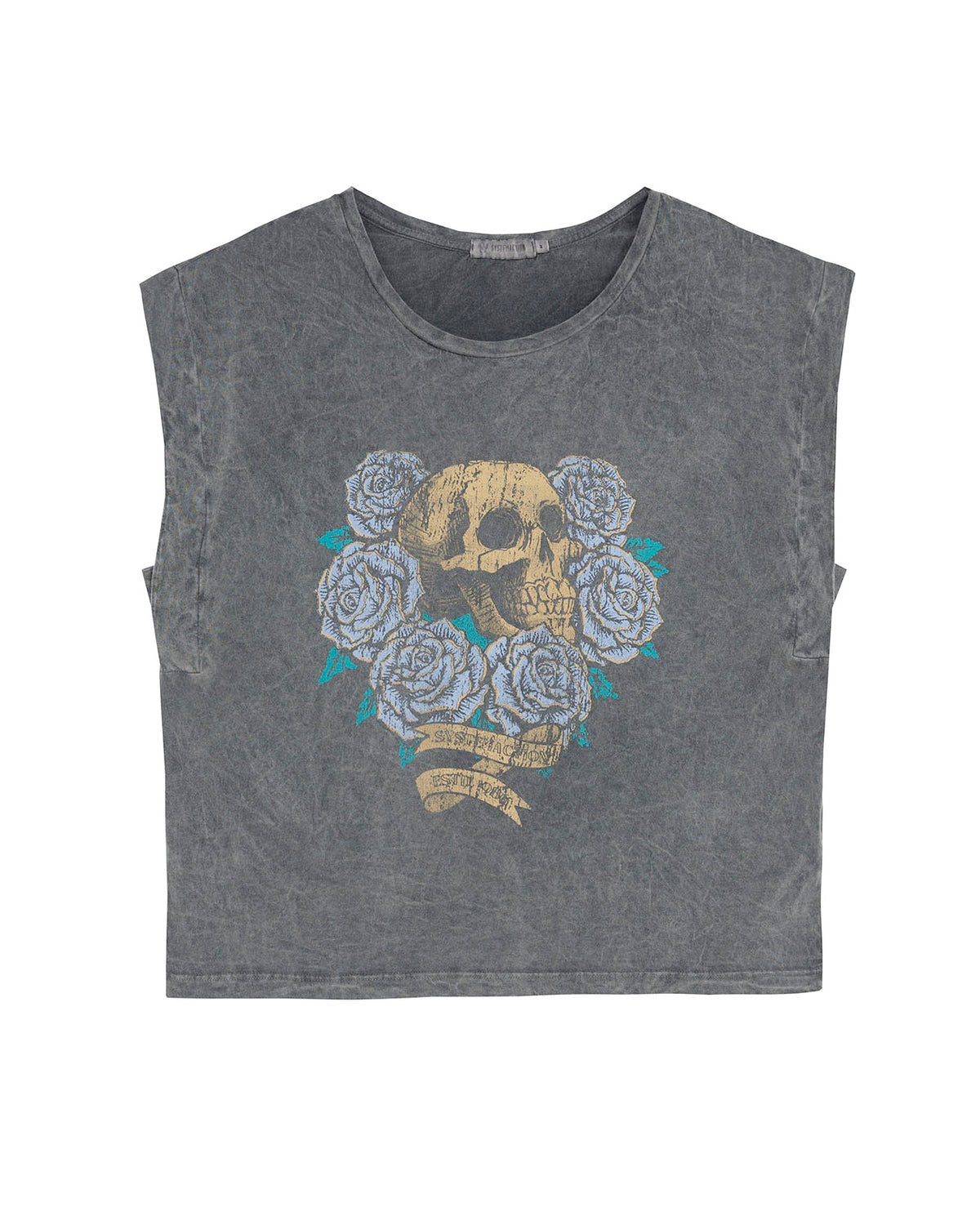 Camiseta de mujer de algodón orgánico sin mangas y cuello redondo con estampado de calavera. Tinte especial efecto desgastado. Prenda sostenible.