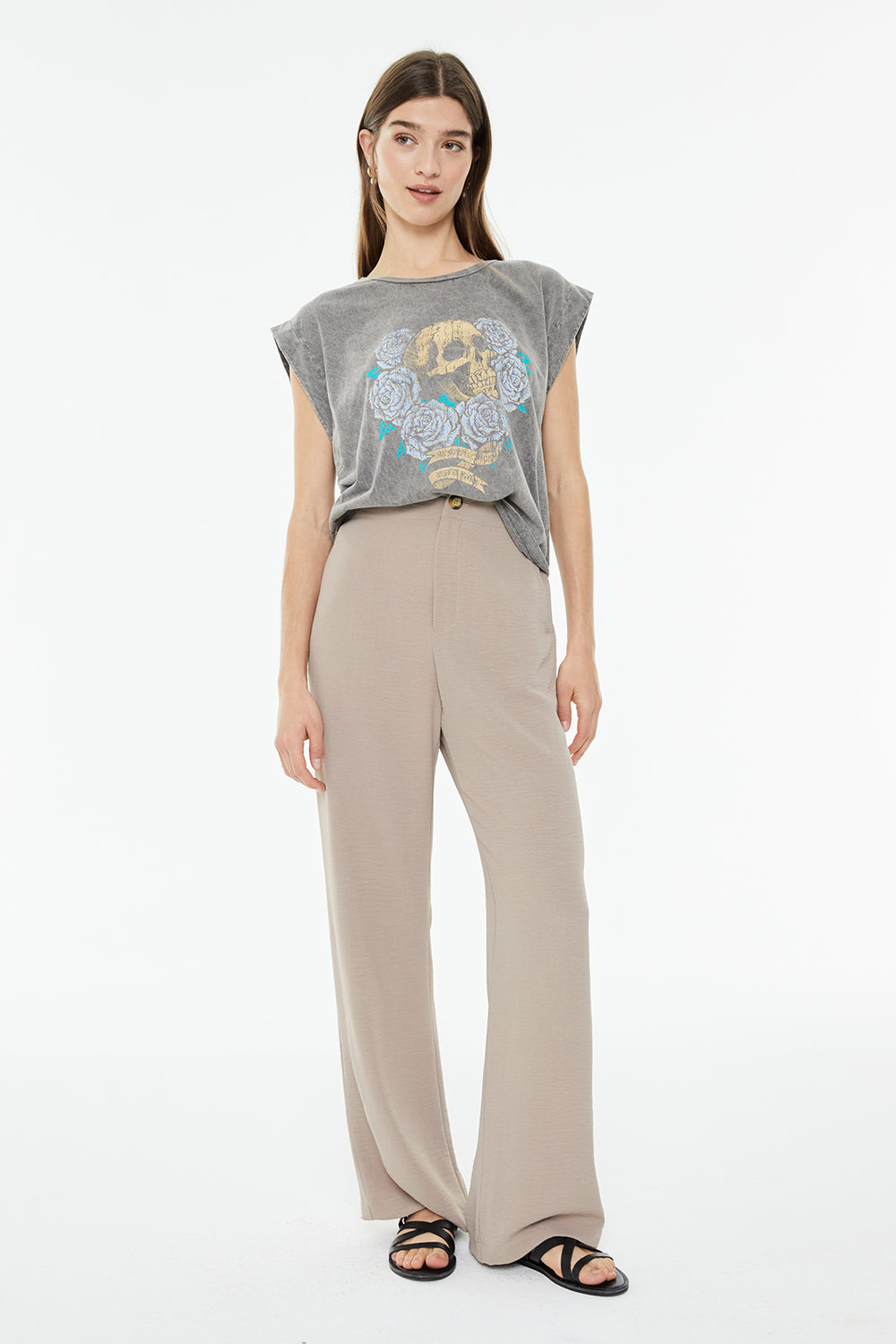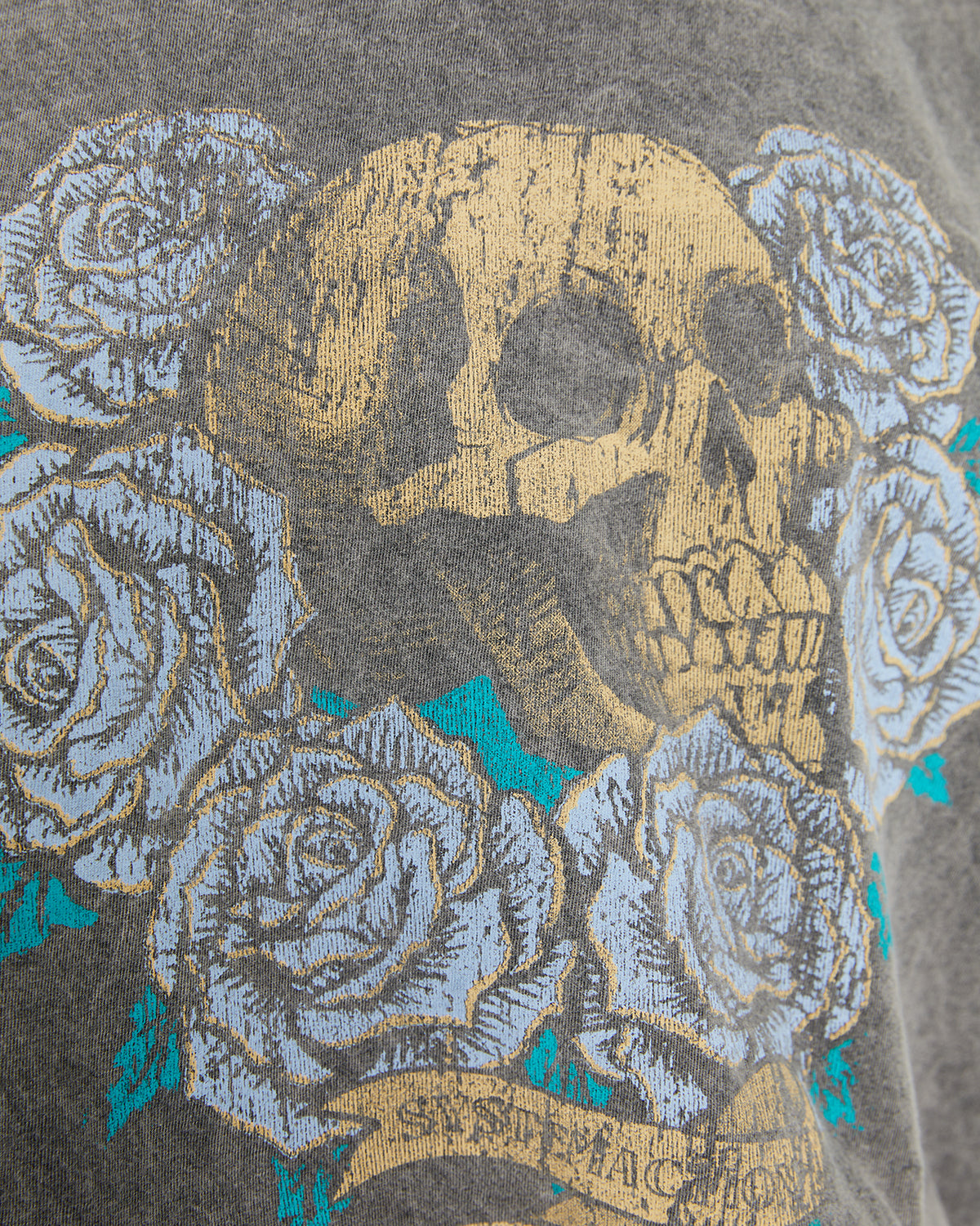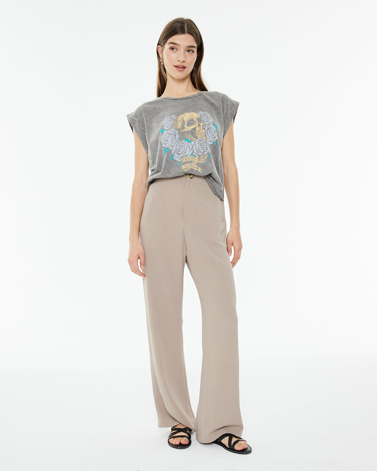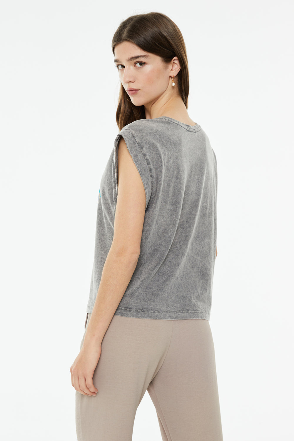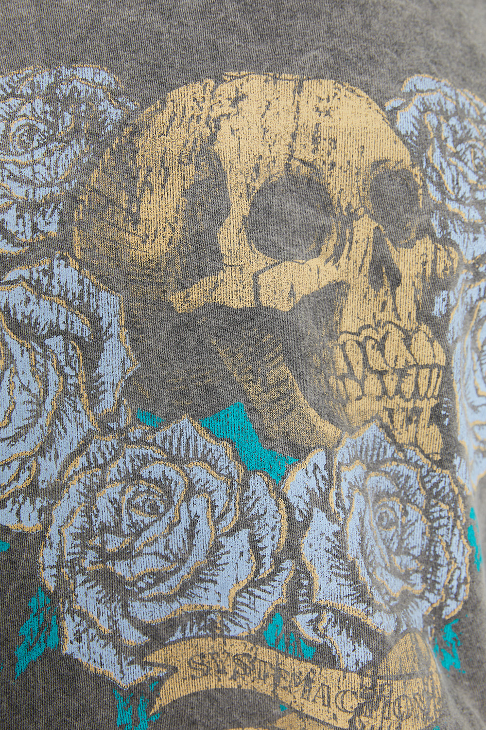 Camiseta de mujer de algodón orgánico sin mangas y cuello redondo con estampado de calavera. Tinte especial efecto desgastado. Prenda sostenible.