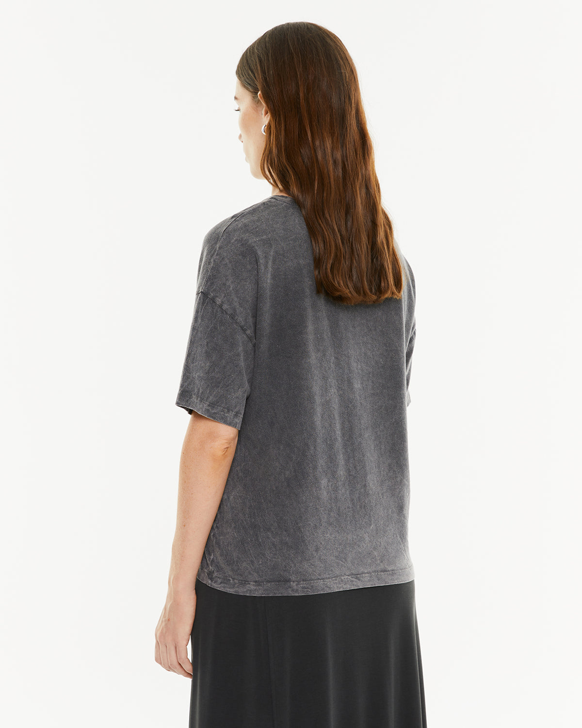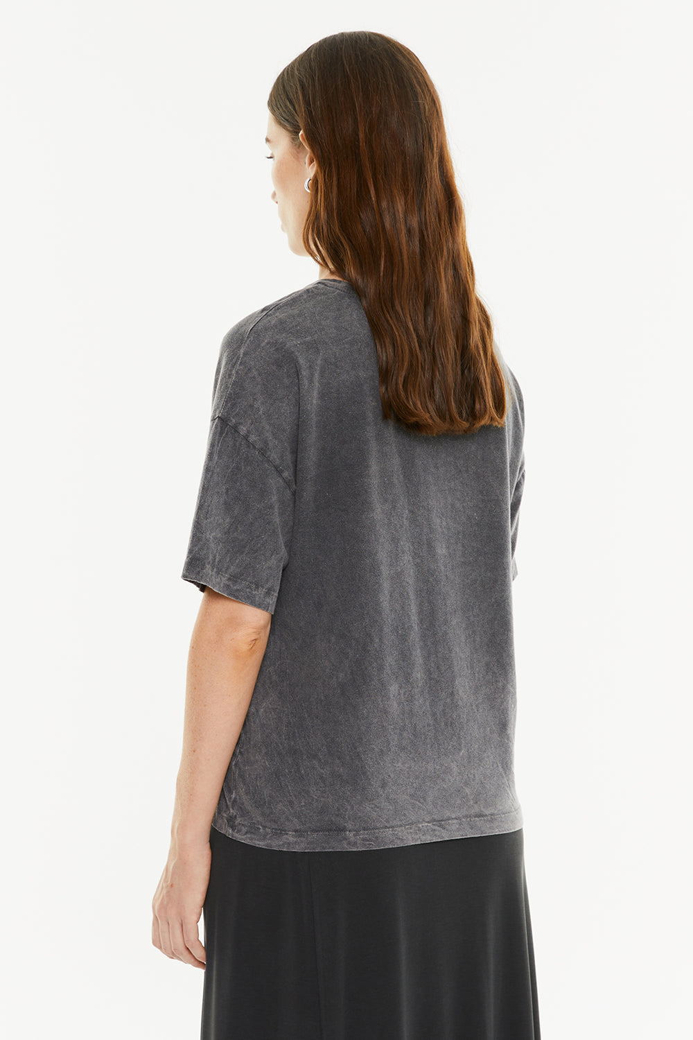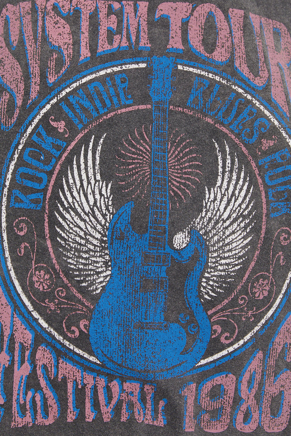 Camiseta oversize de mujer, de manga corta, con tintura efecto desgastado y estampado de una guitarra. Prenda sostenible.