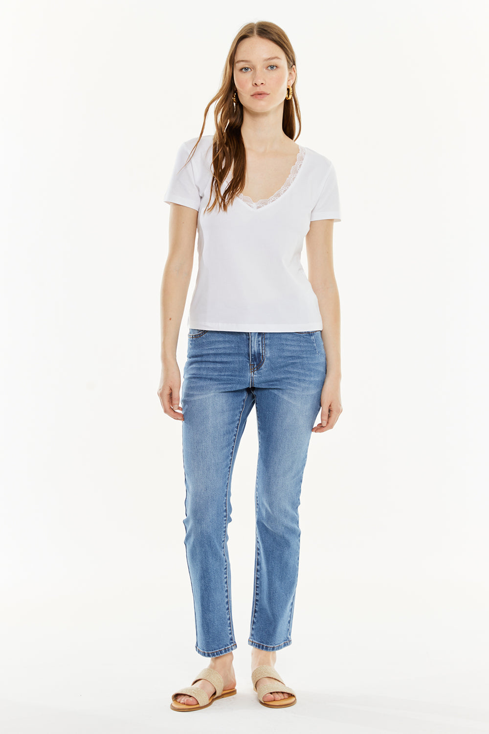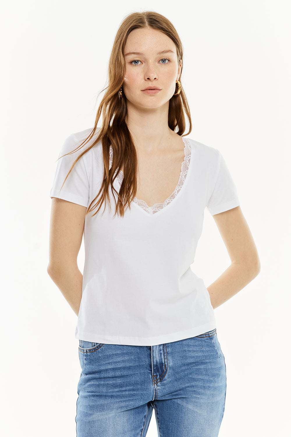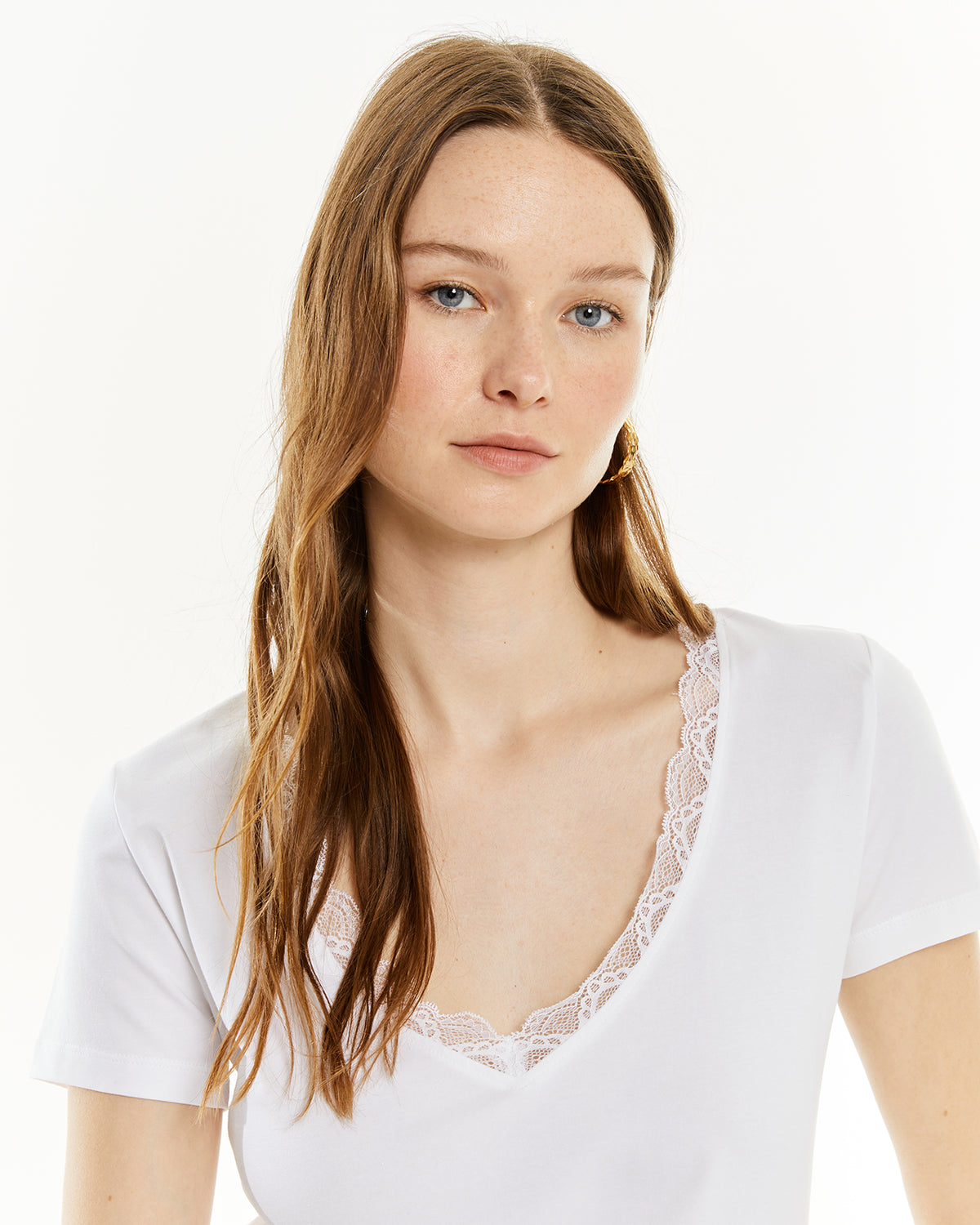 Camiseta de mujer de manga corta, escote en pico y detalle de puntilla. Prenda sostenible.