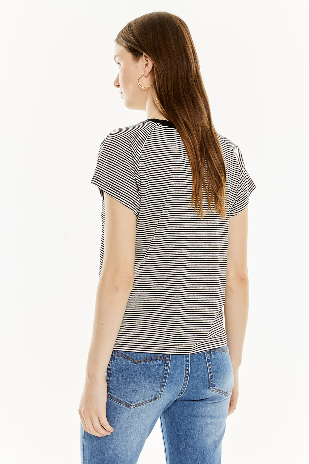 Camiseta de mujer de rayas, escote en pico y manga ranglán. Prenda sostenible.