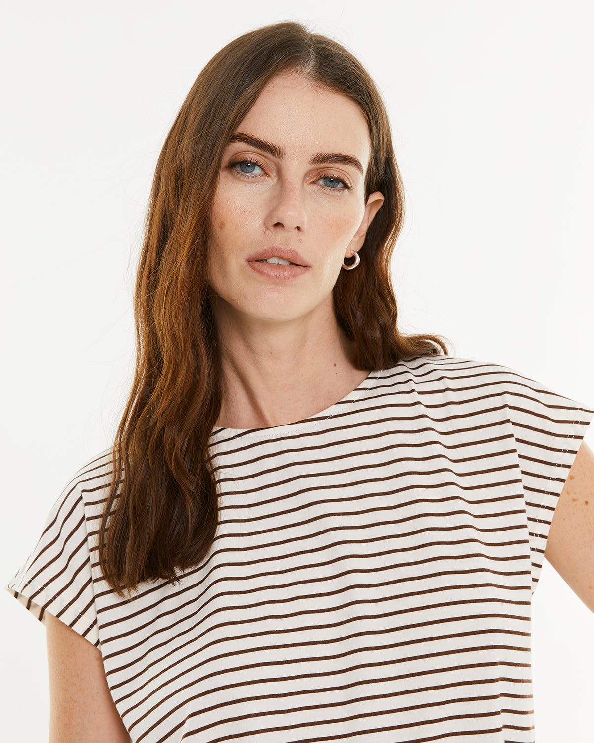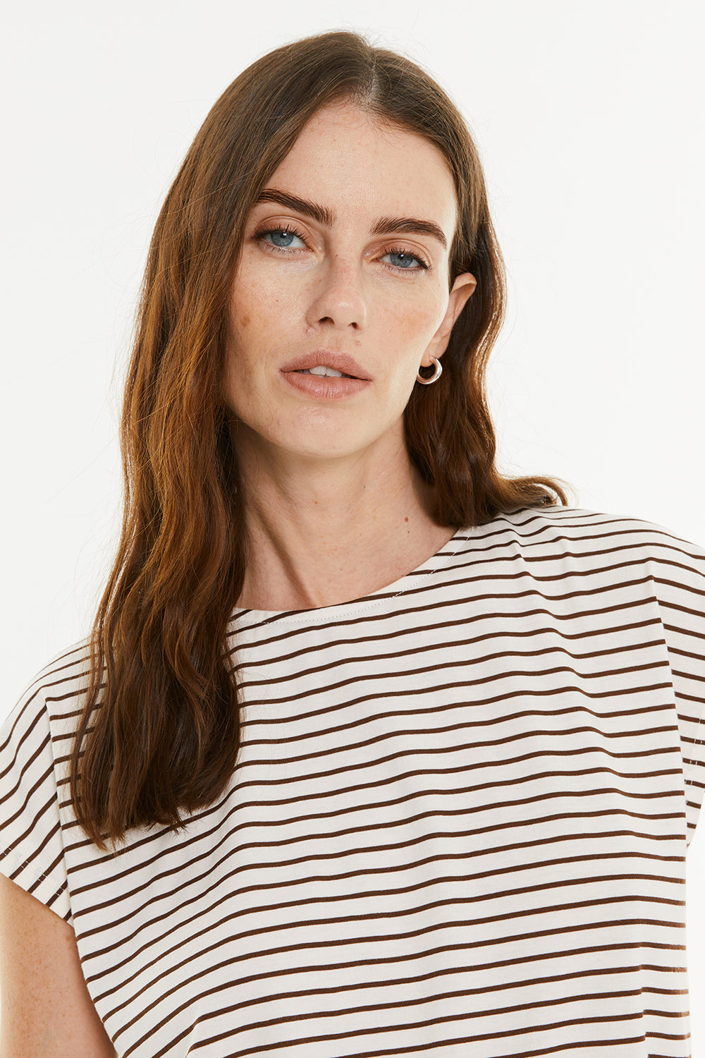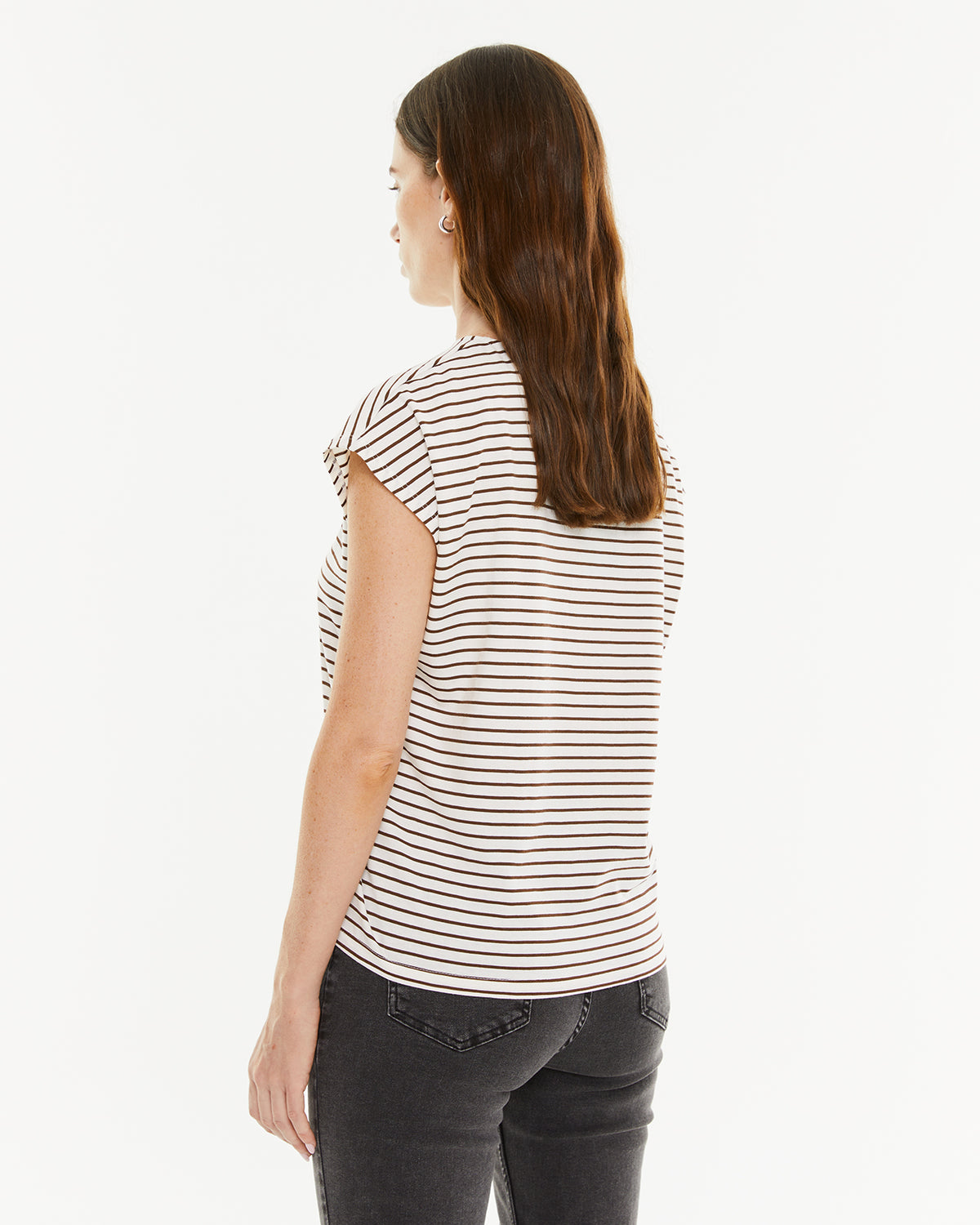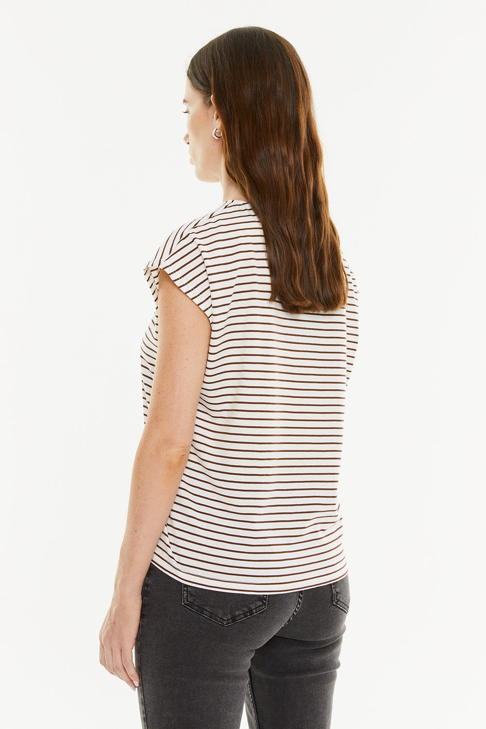 Camiseta mujer rayas marrones. Manga corta y escote redondo. Prenda sostenible.