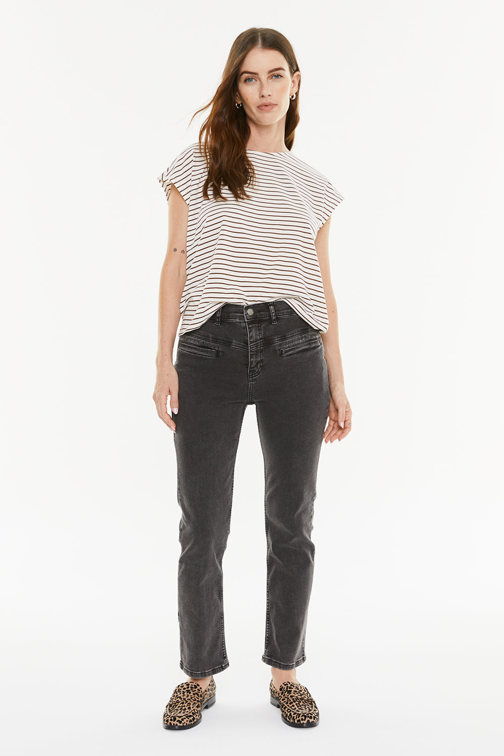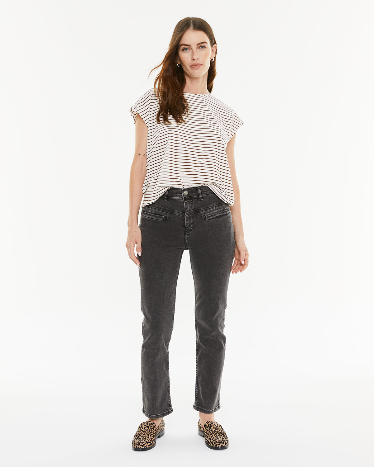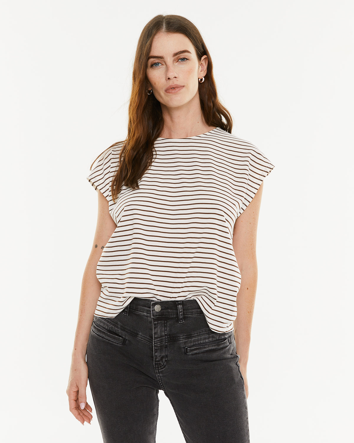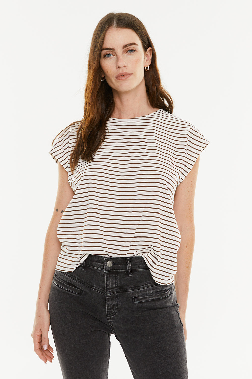 Camiseta mujer rayas marrones. Manga corta y escote redondo. Prenda sostenible.