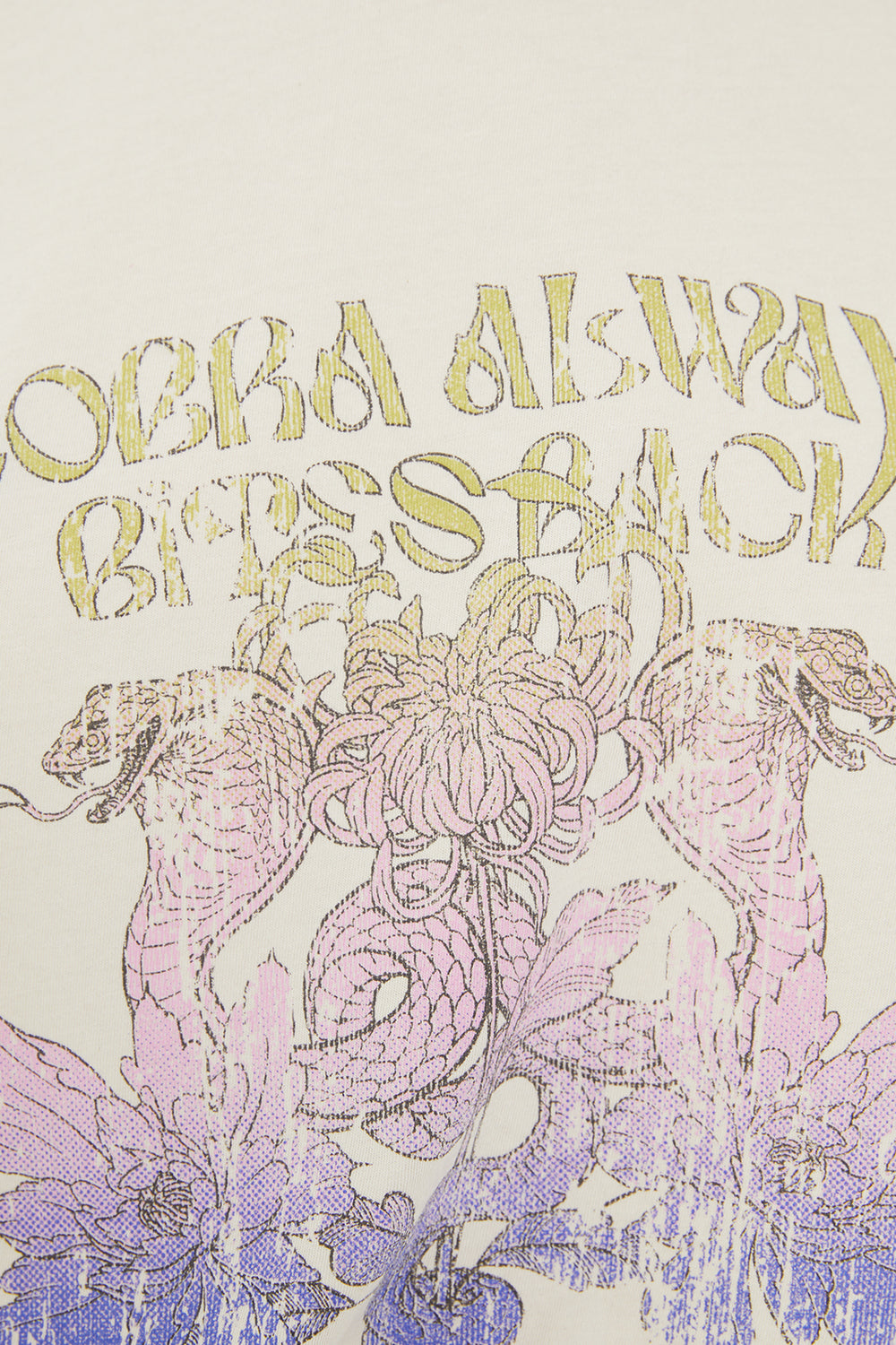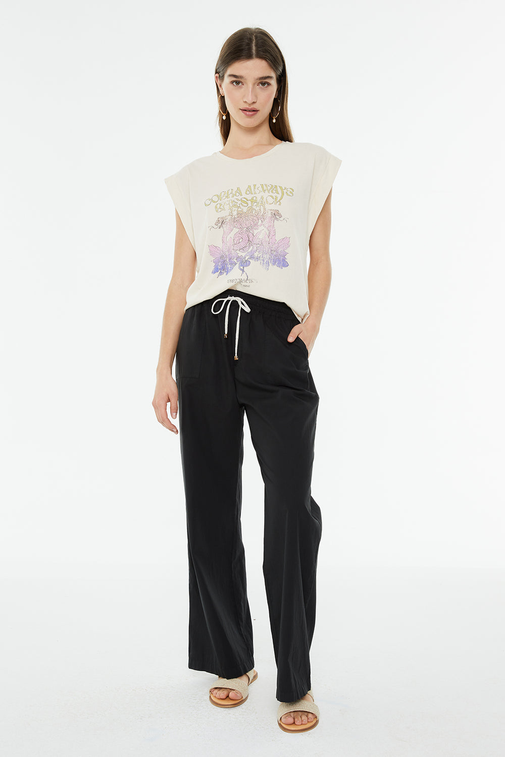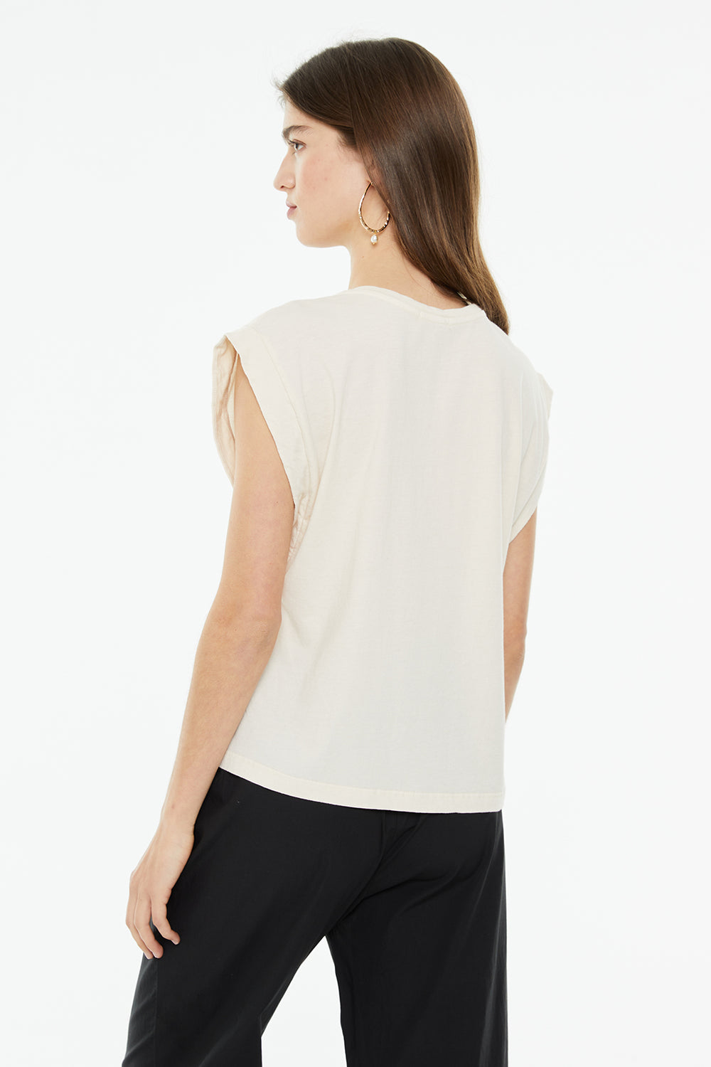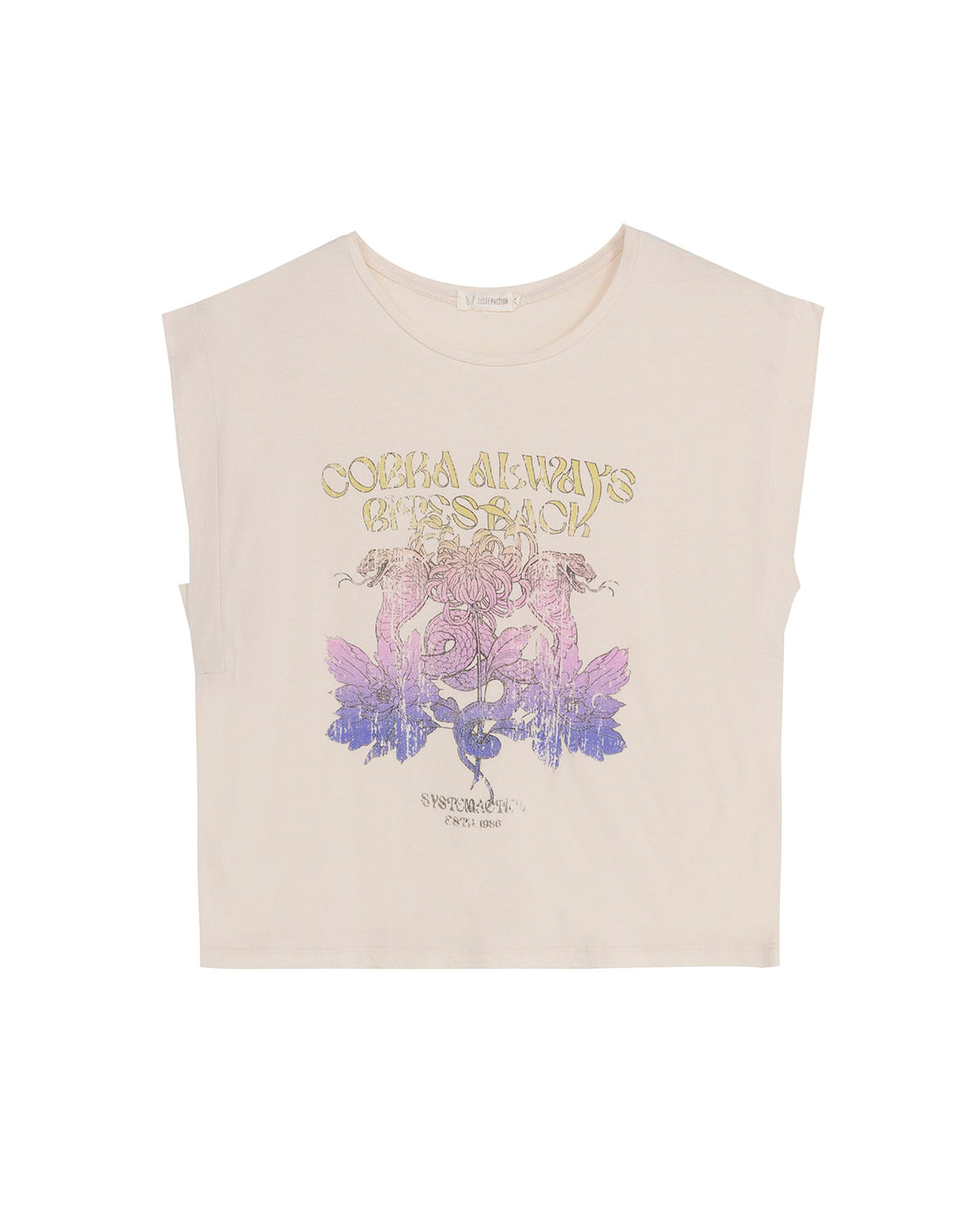 Camiseta de mujer de algodón orgánico, sin mangas y cuello redondo con estampado y texto. Tinte especial efecto desgastado. Prenda sostenible