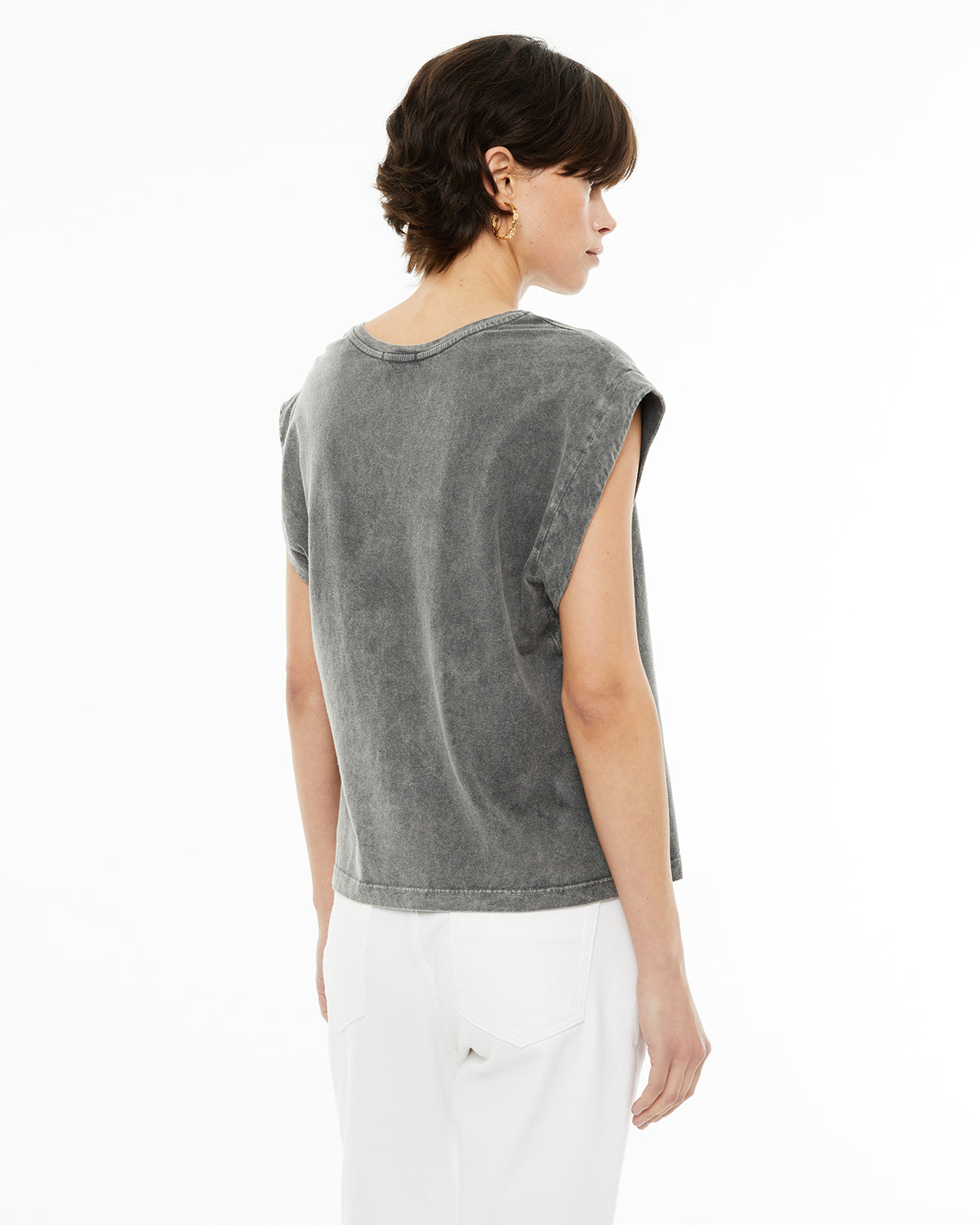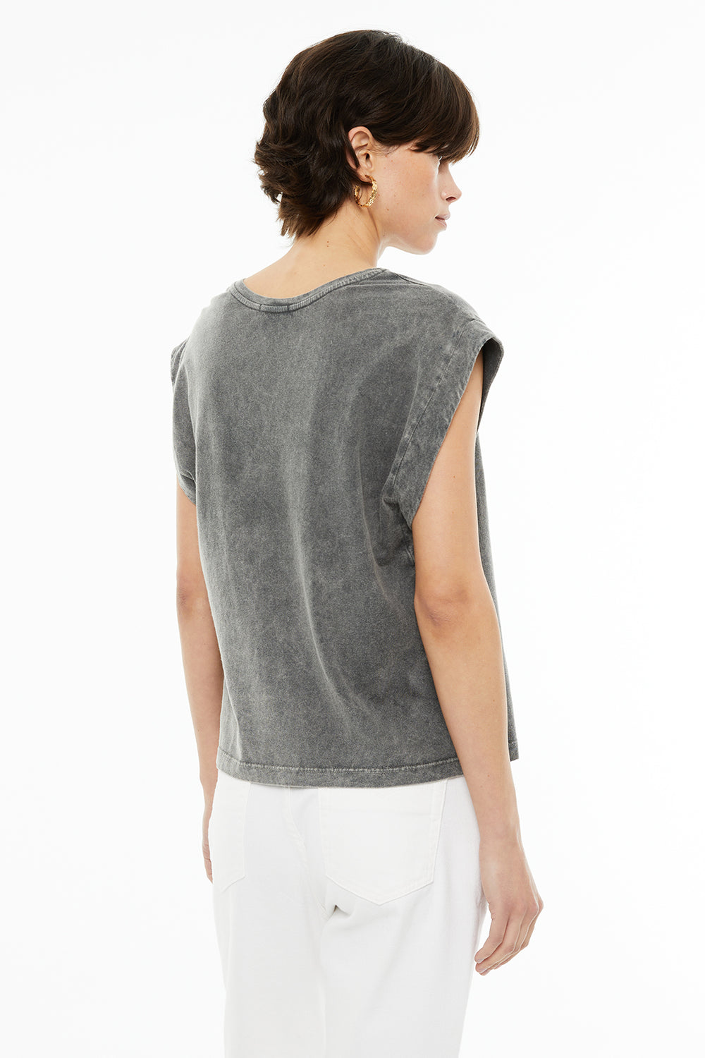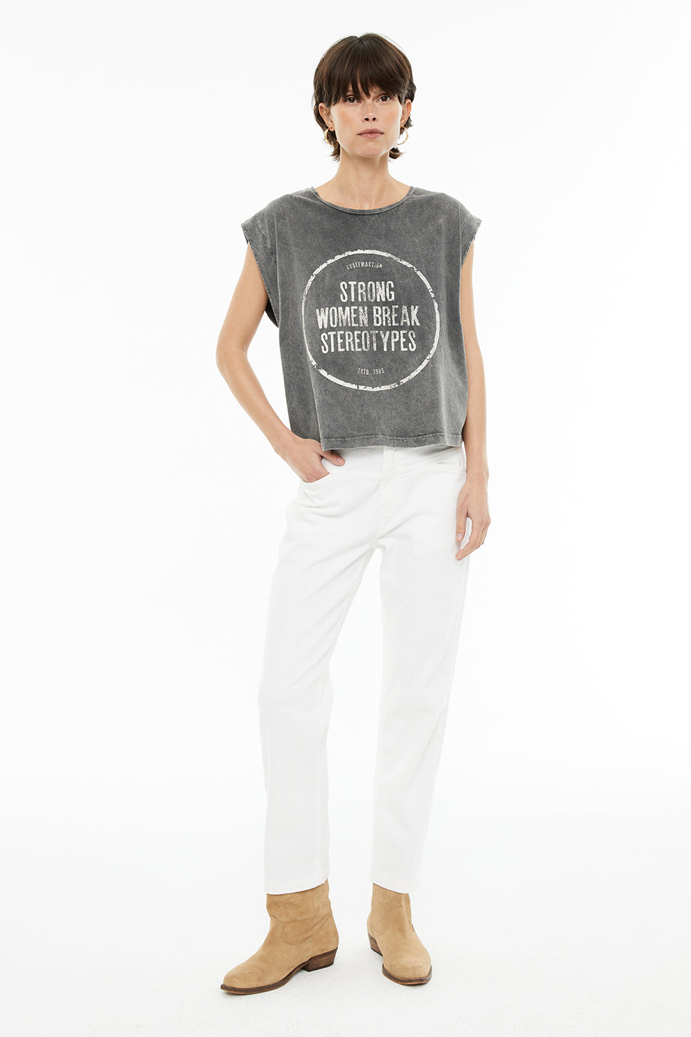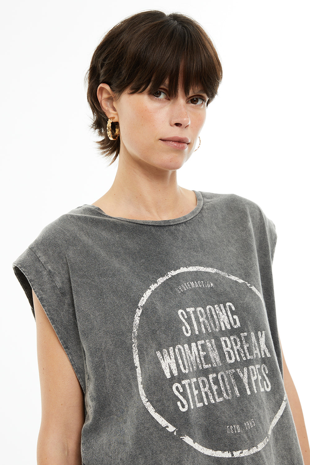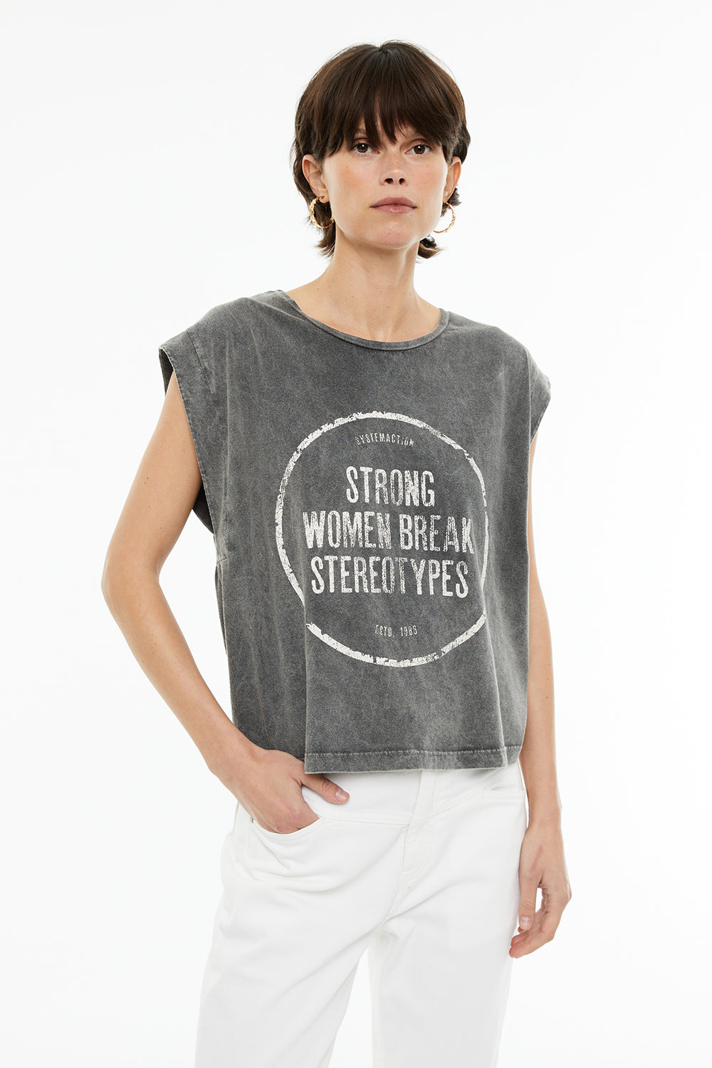 Camiseta sin mangas tintada con un estampado posicional del día de la mujer. Prenda sostenible.