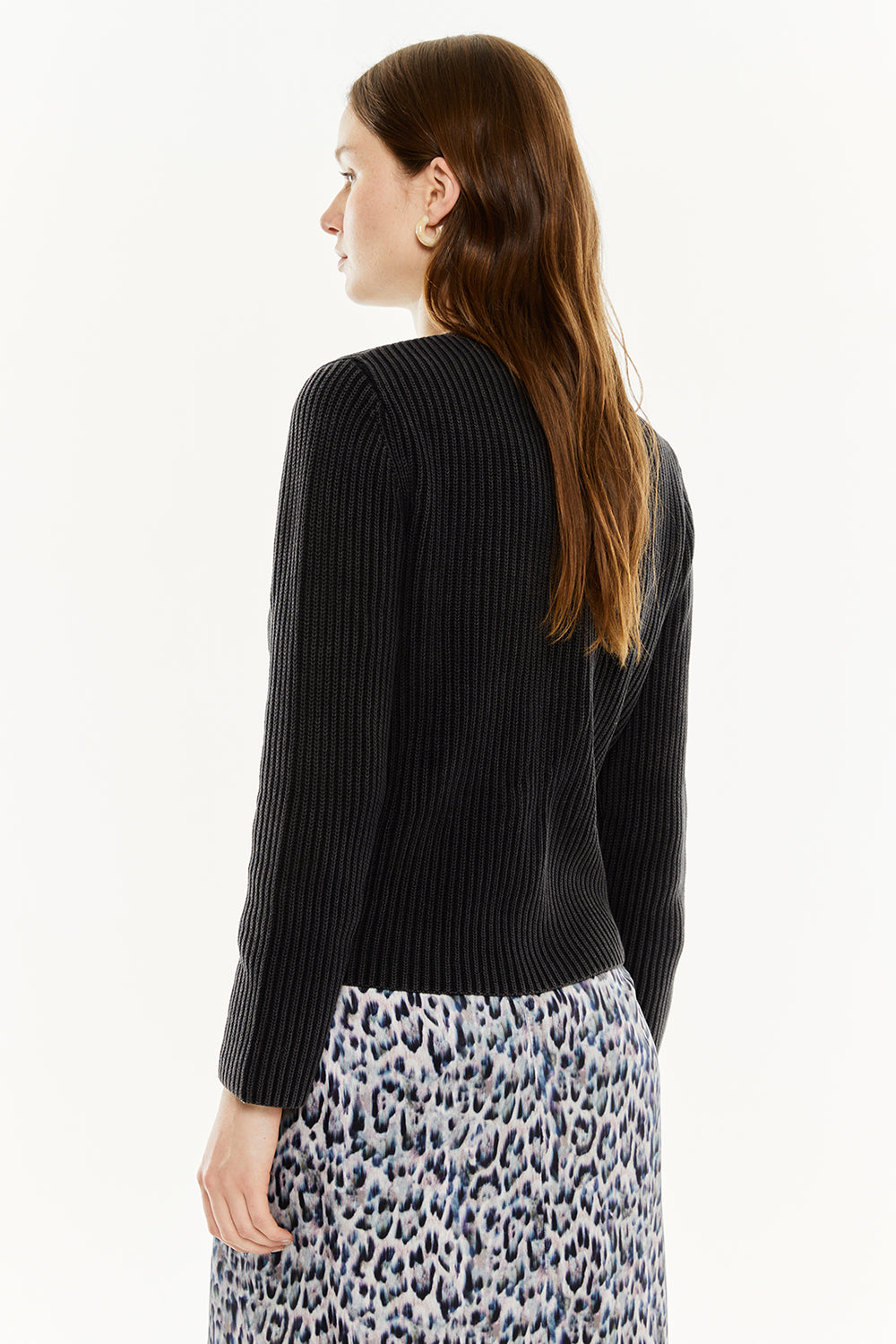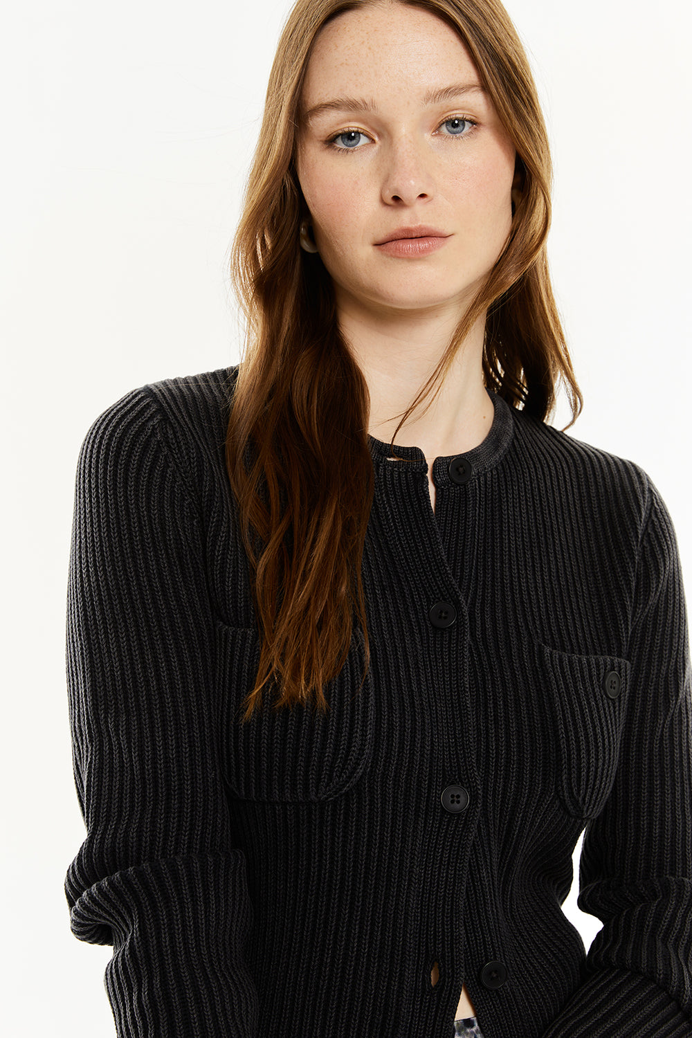 Rebeca de punto con cuello redondo, cierre frontal con botones y detalle de bolsillos plastrón con botón.