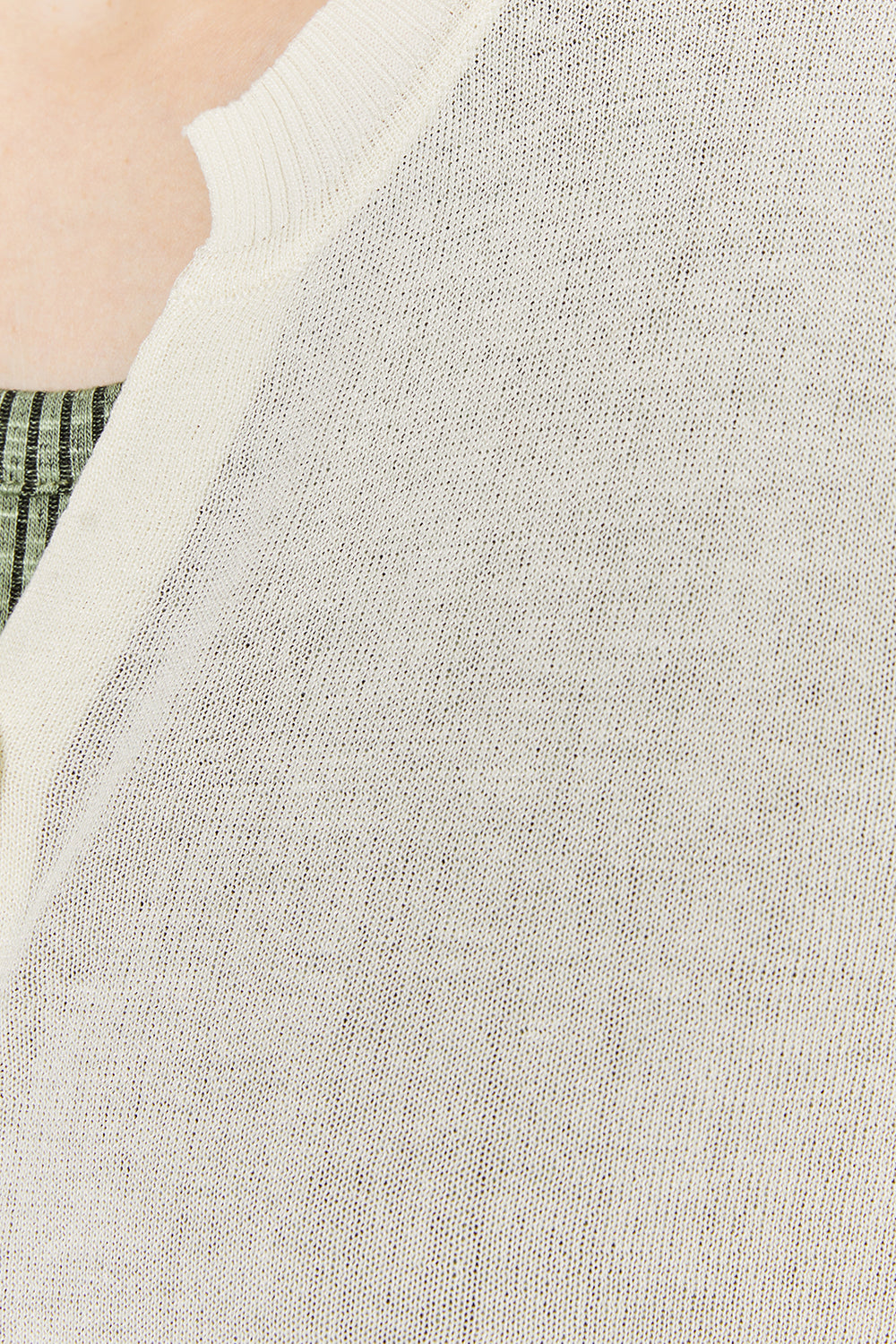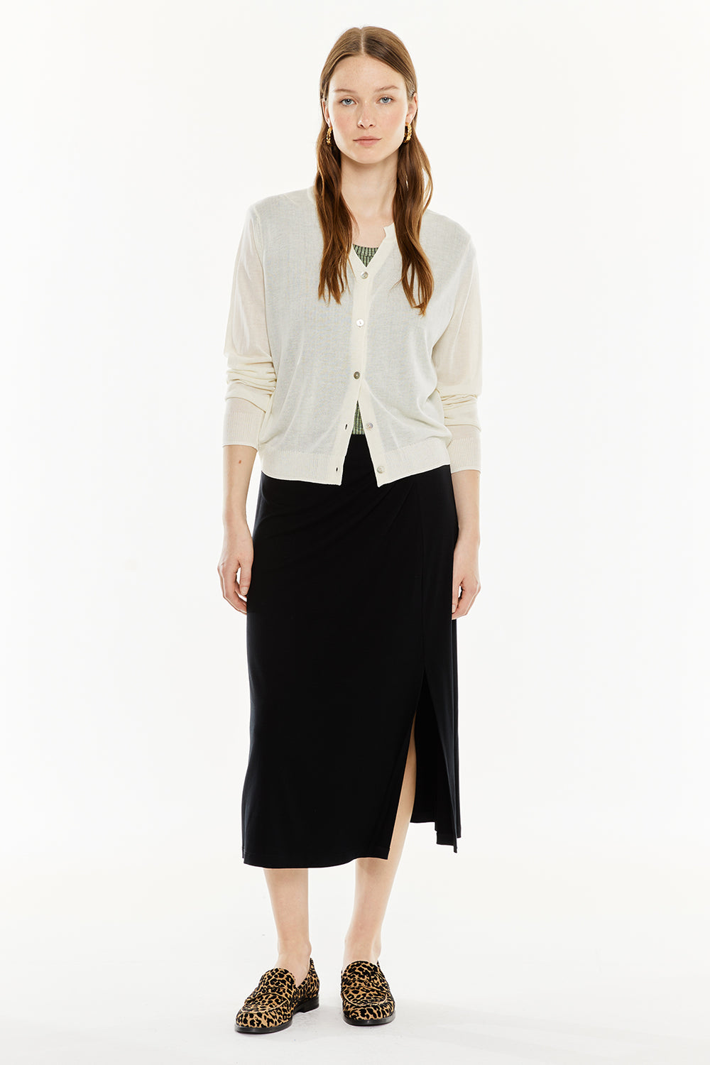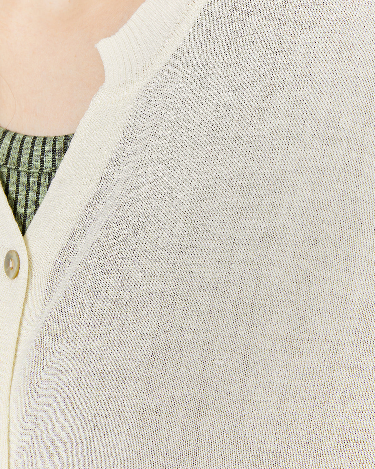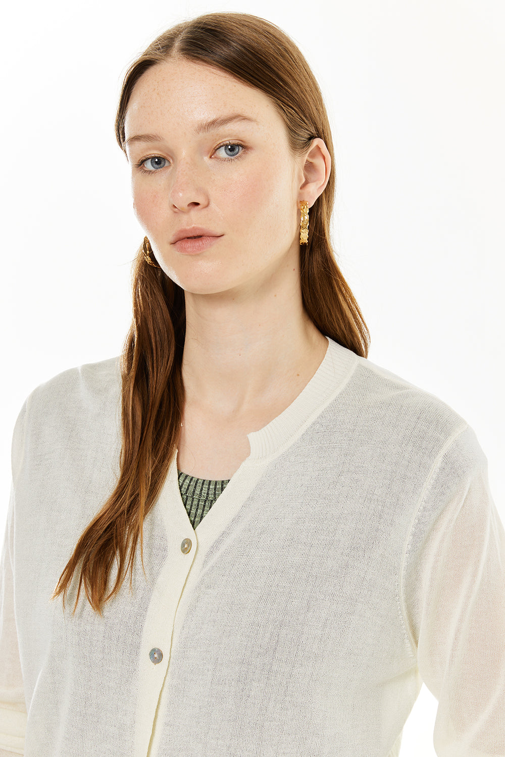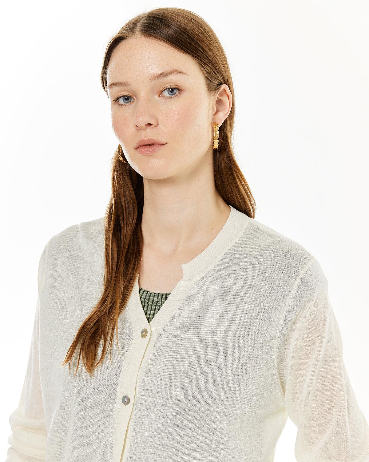 Jersey de mujer de manga larga, escote redondo y cierre abotonado en la parte delantera. Acabados en rib.