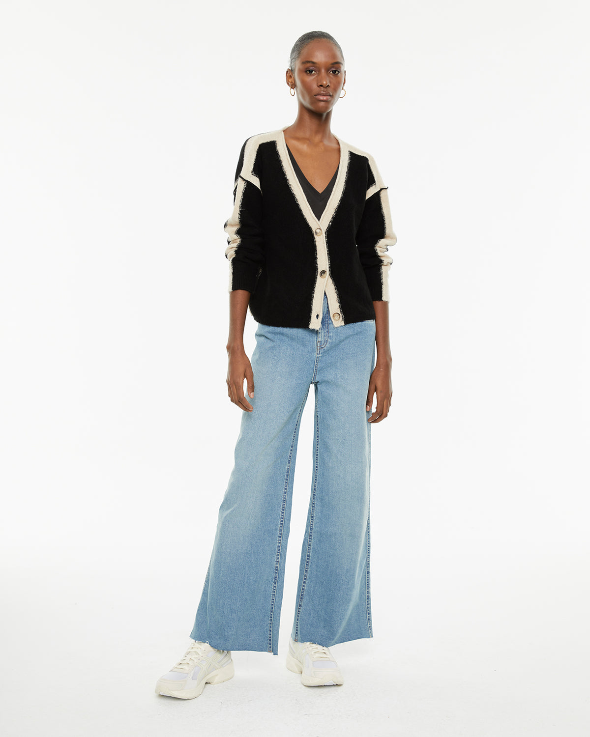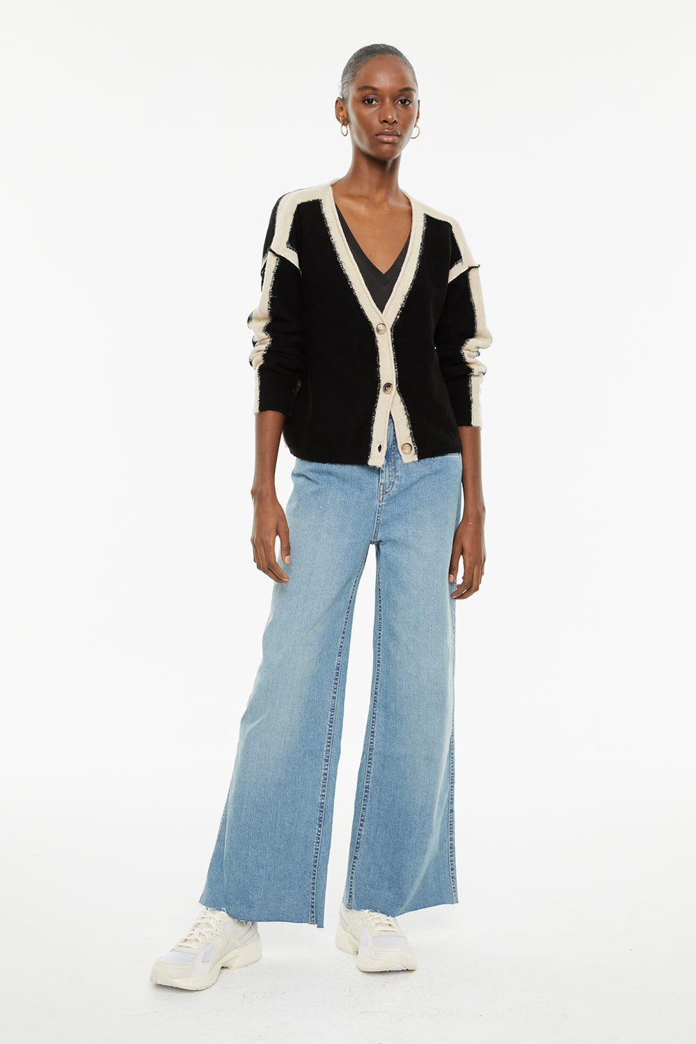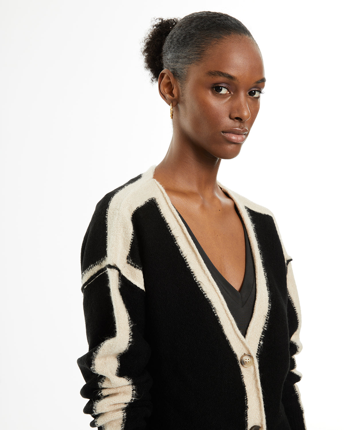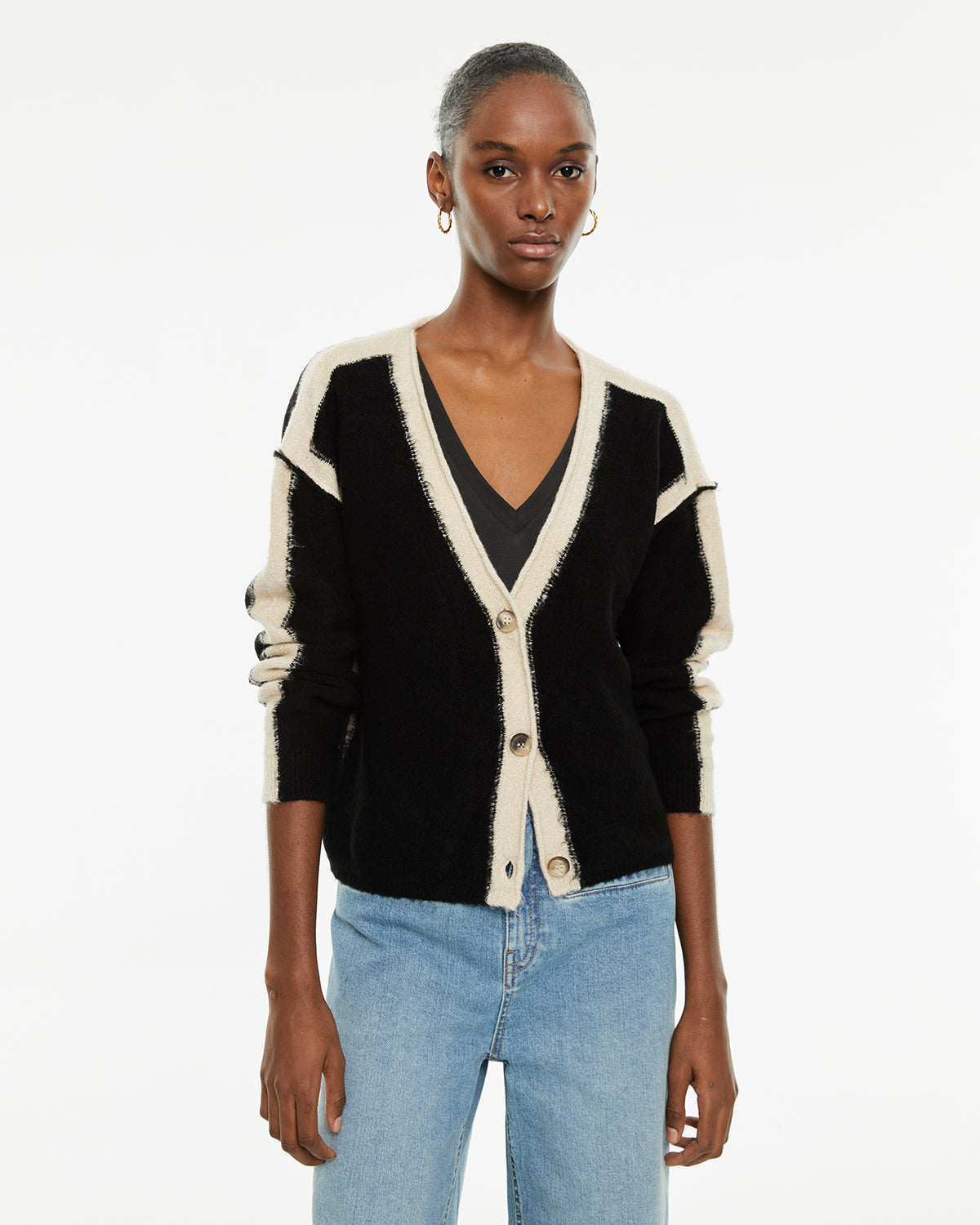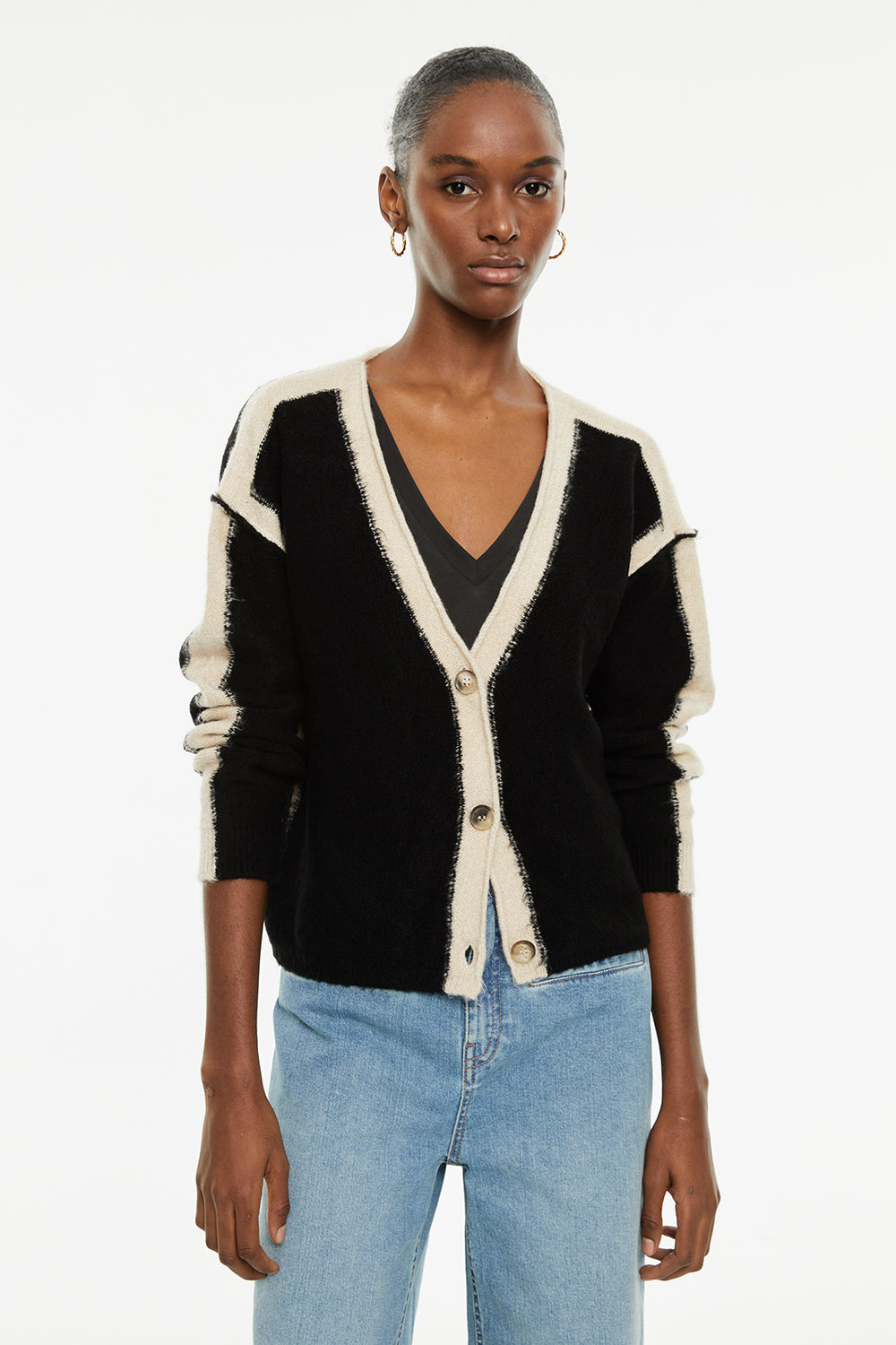 Cárdigan de mujer con cuello pico, manga larga, detalles a contraste y cierre frontal con botones.