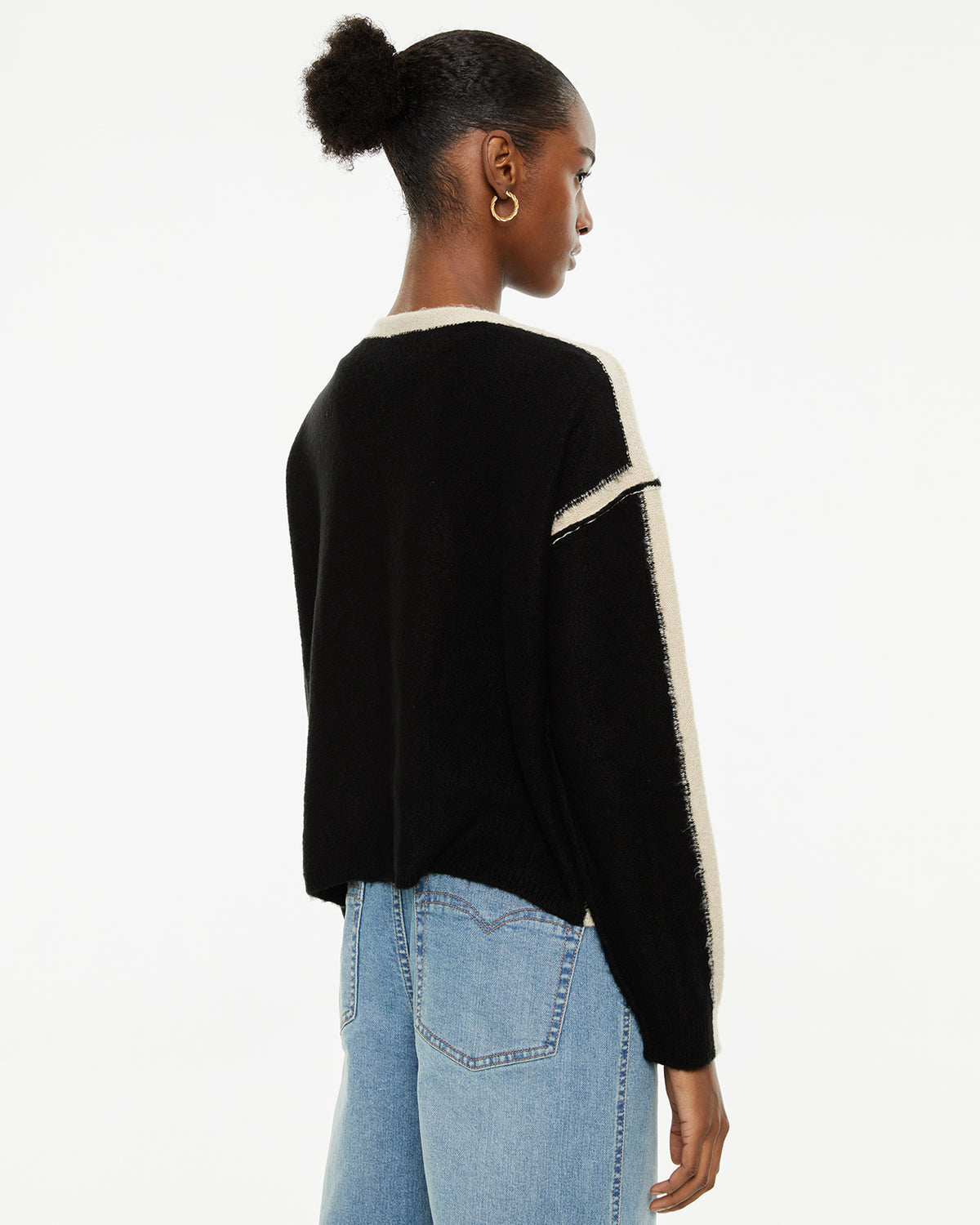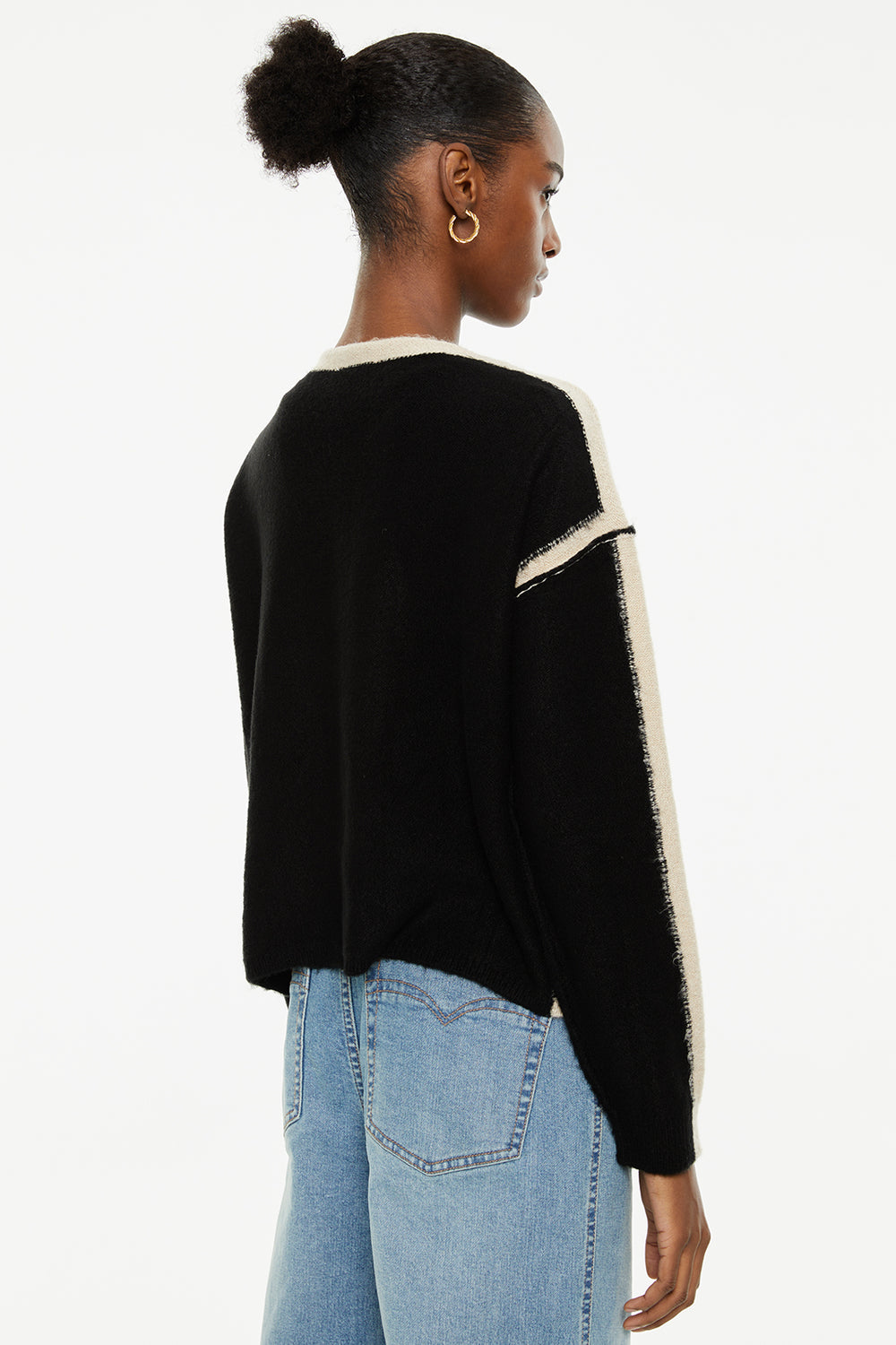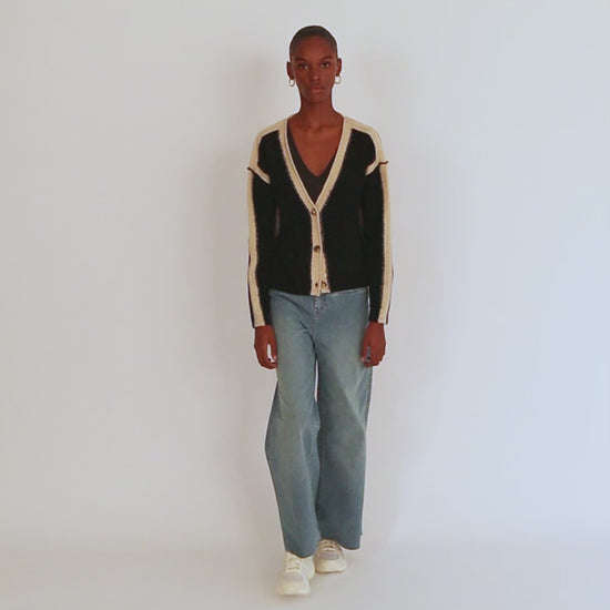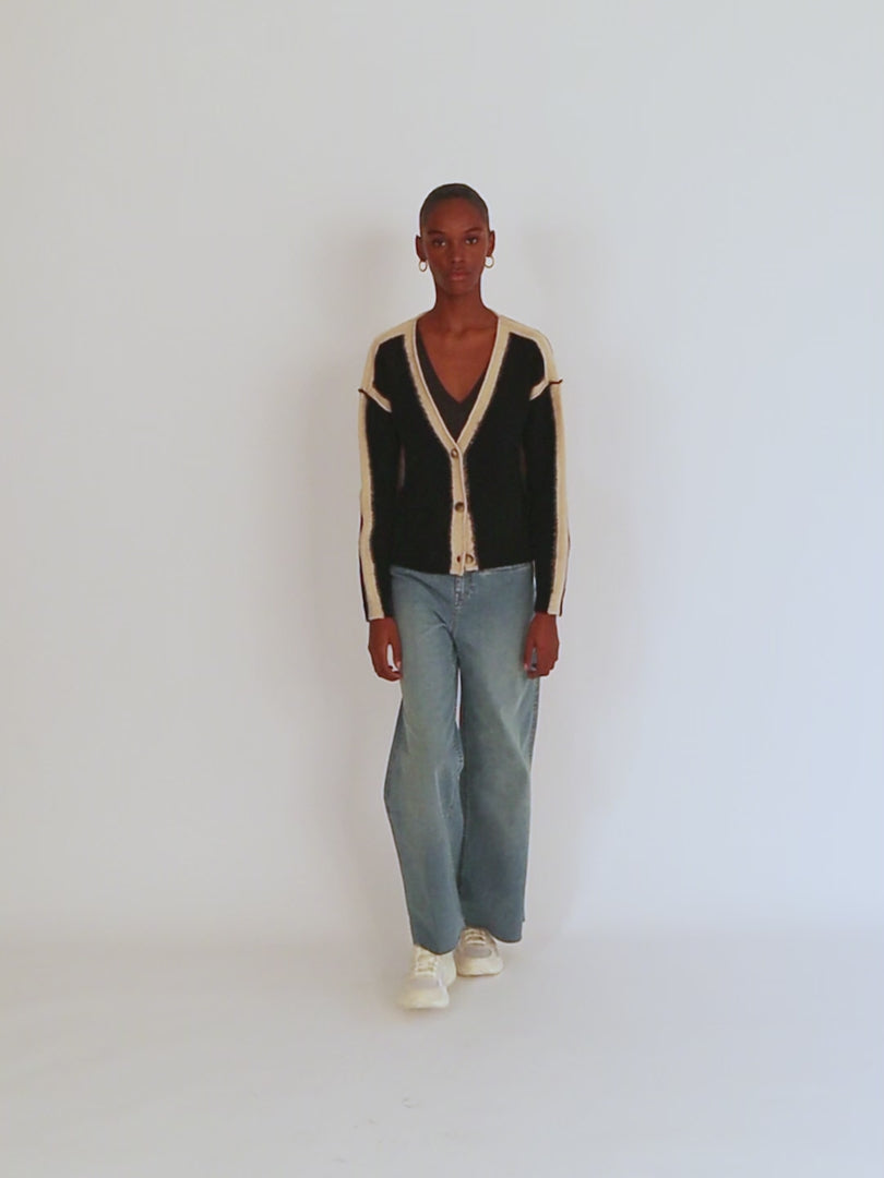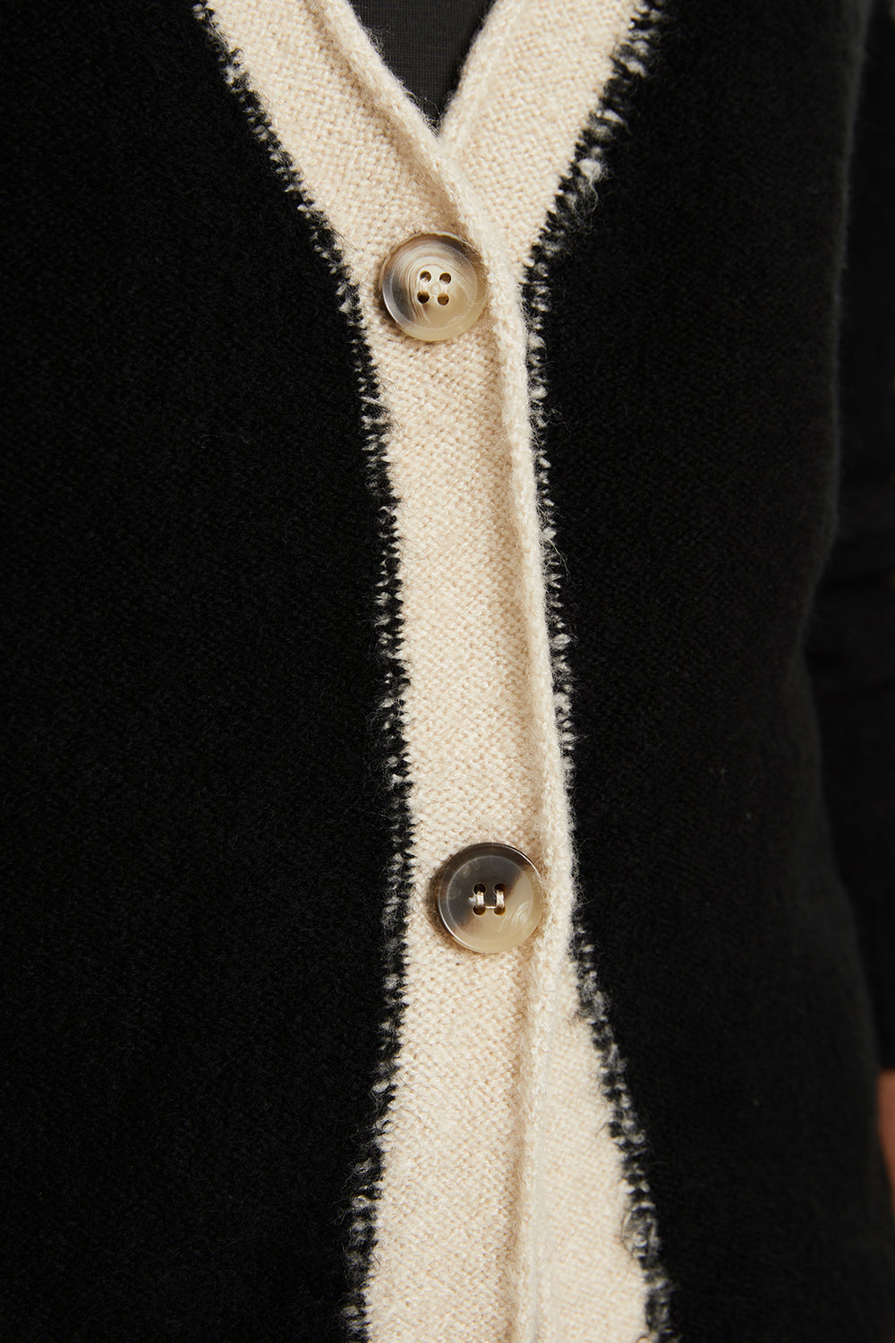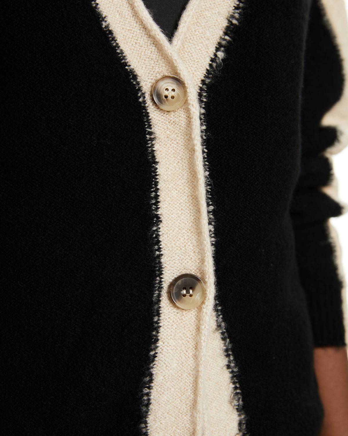 Cárdigan de mujer con cuello pico, manga larga, detalles a contraste y cierre frontal con botones.