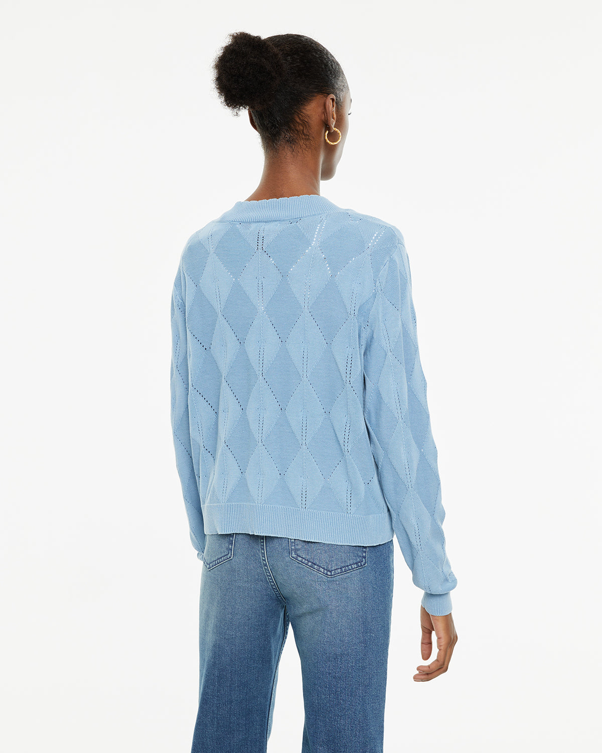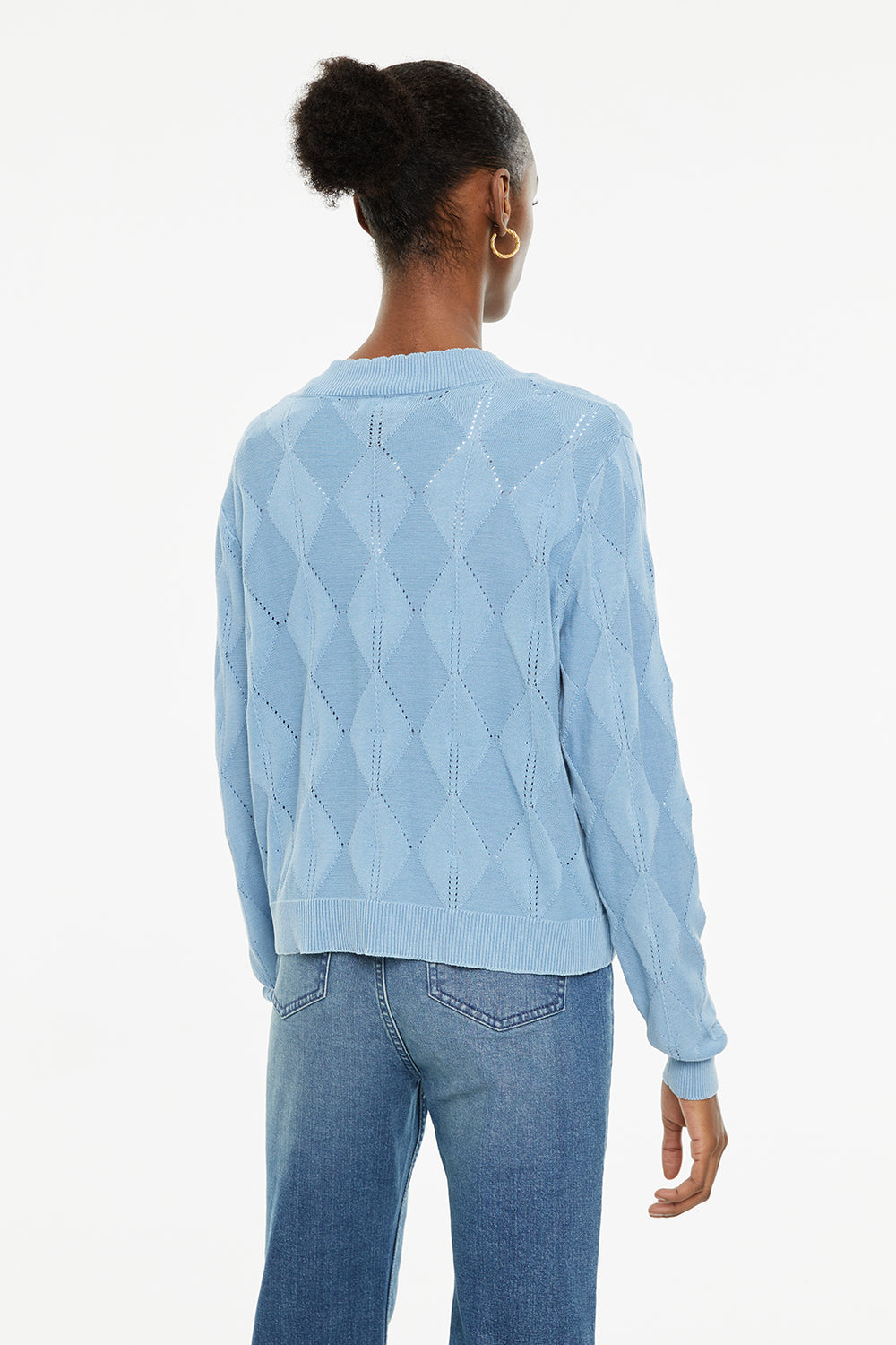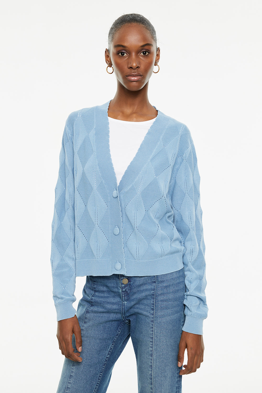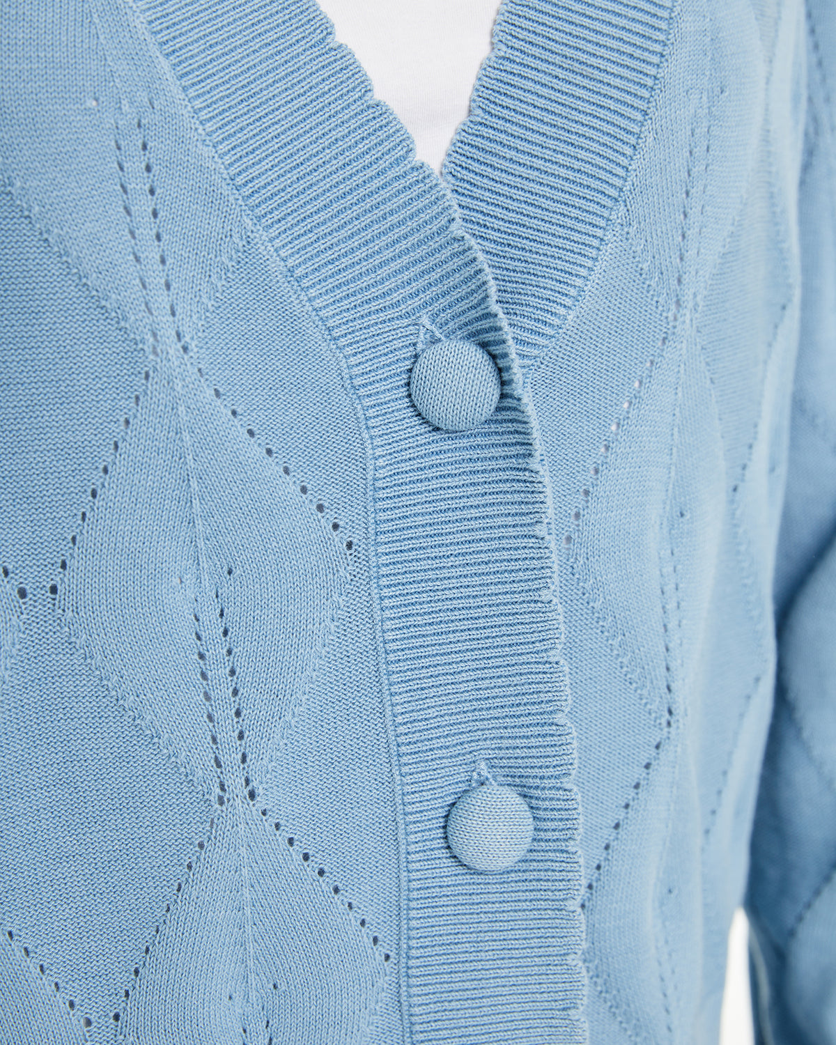 Cárdigan de mujer con un jacquard de rombos, tinte efecto desgastado de cuello pico y manga larga.