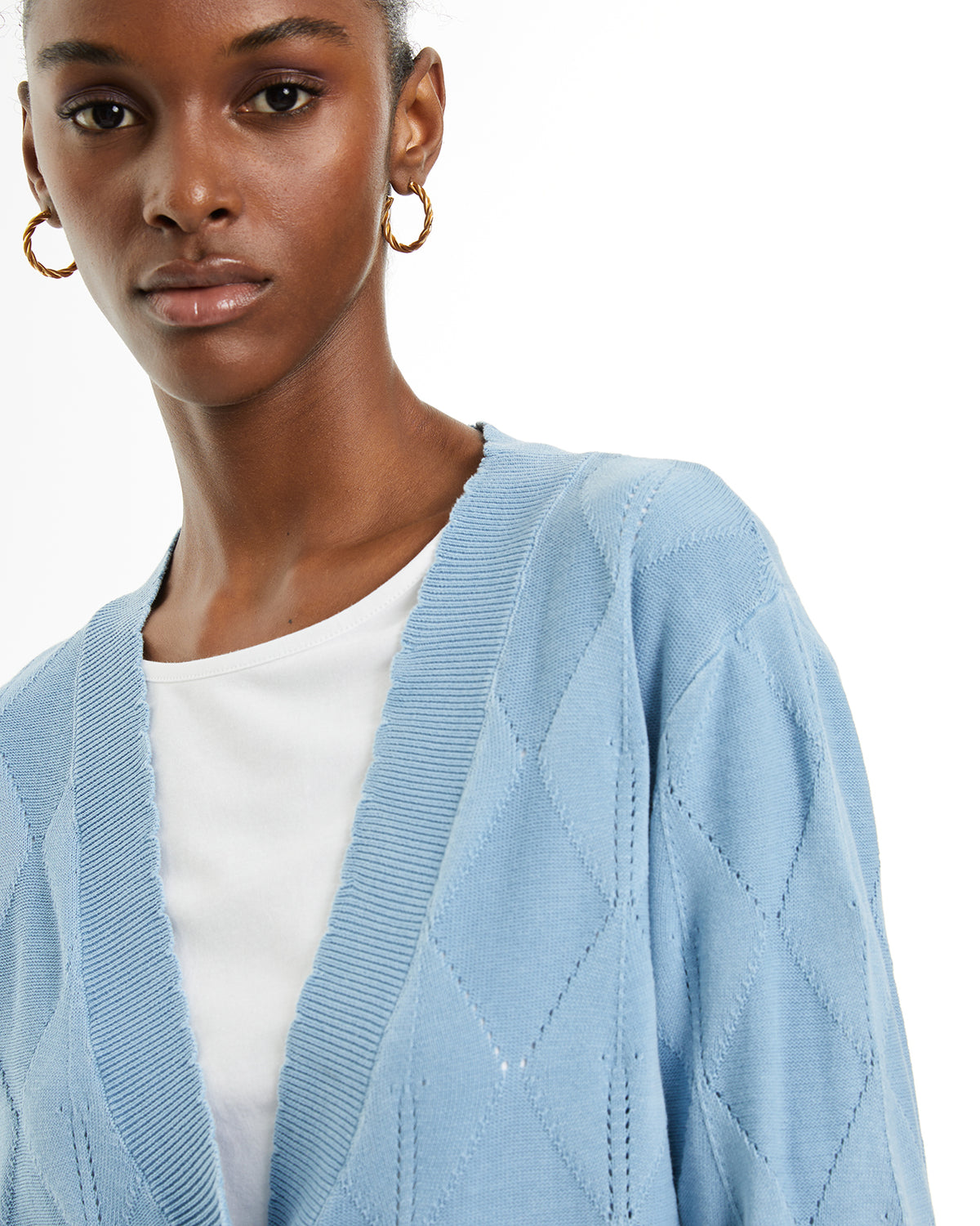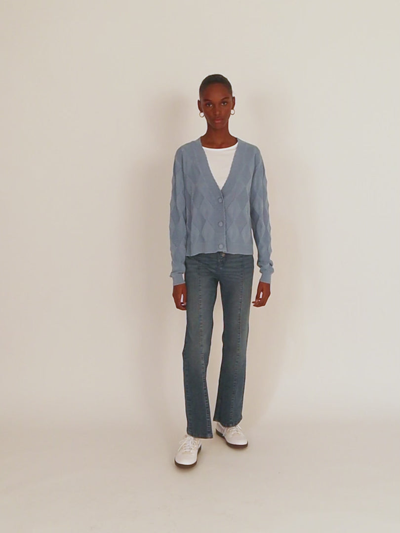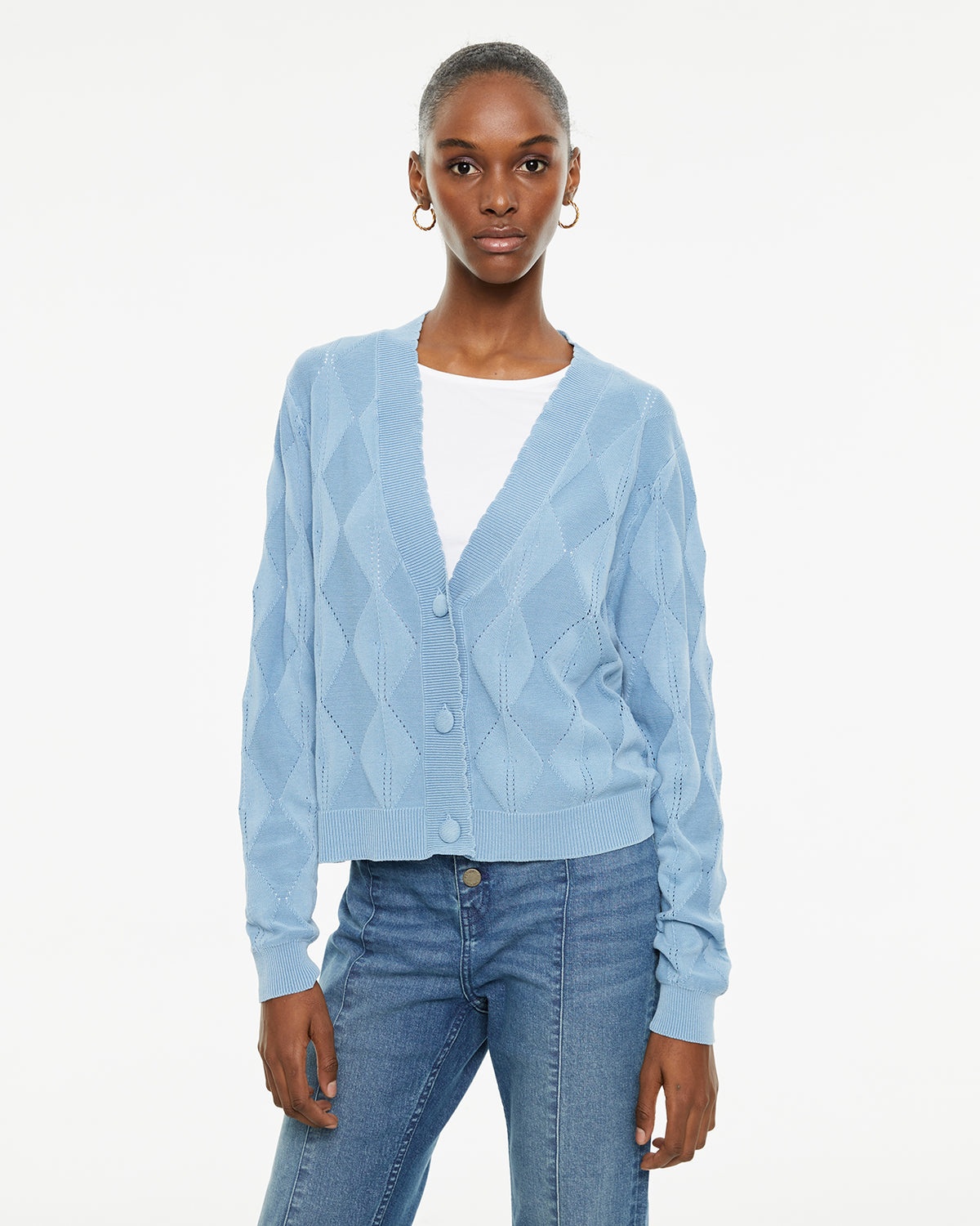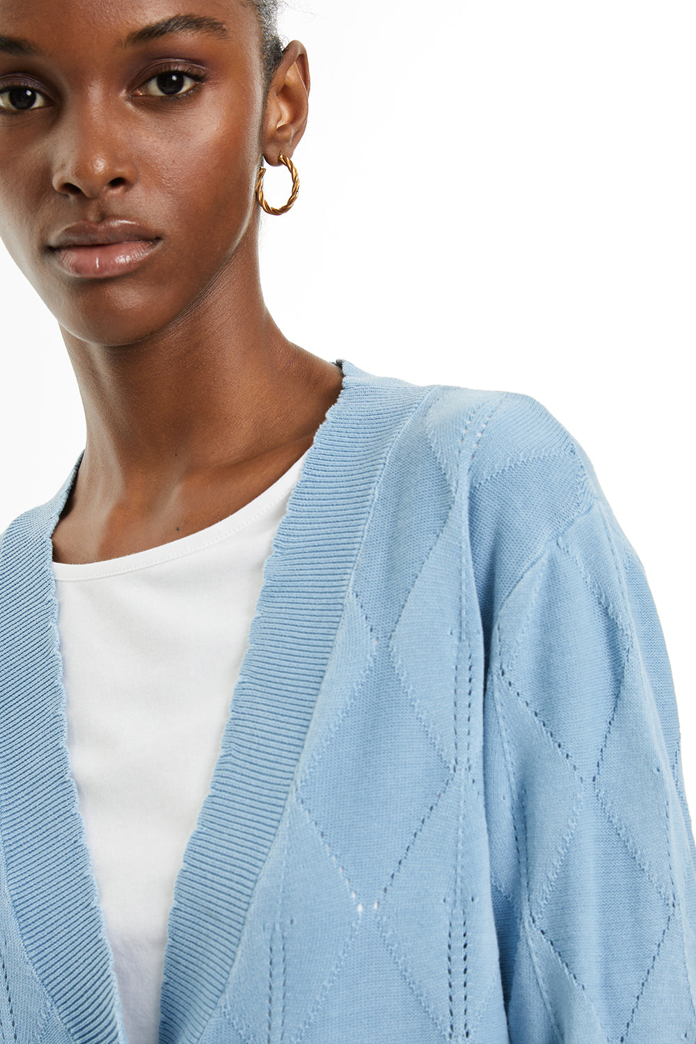 Cárdigan de mujer con un jacquard de rombos, tinte efecto desgastado de cuello pico y manga larga.