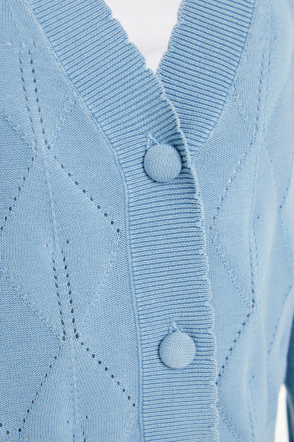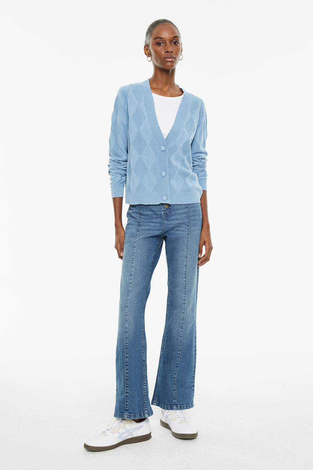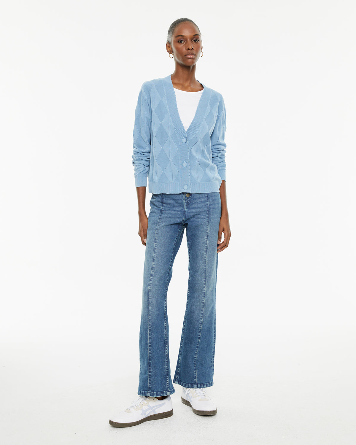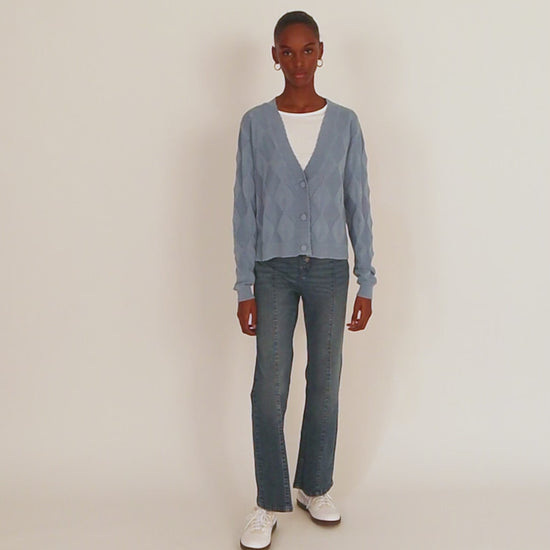 Cárdigan de mujer con un jacquard de rombos, tinte efecto desgastado de cuello pico y manga larga.