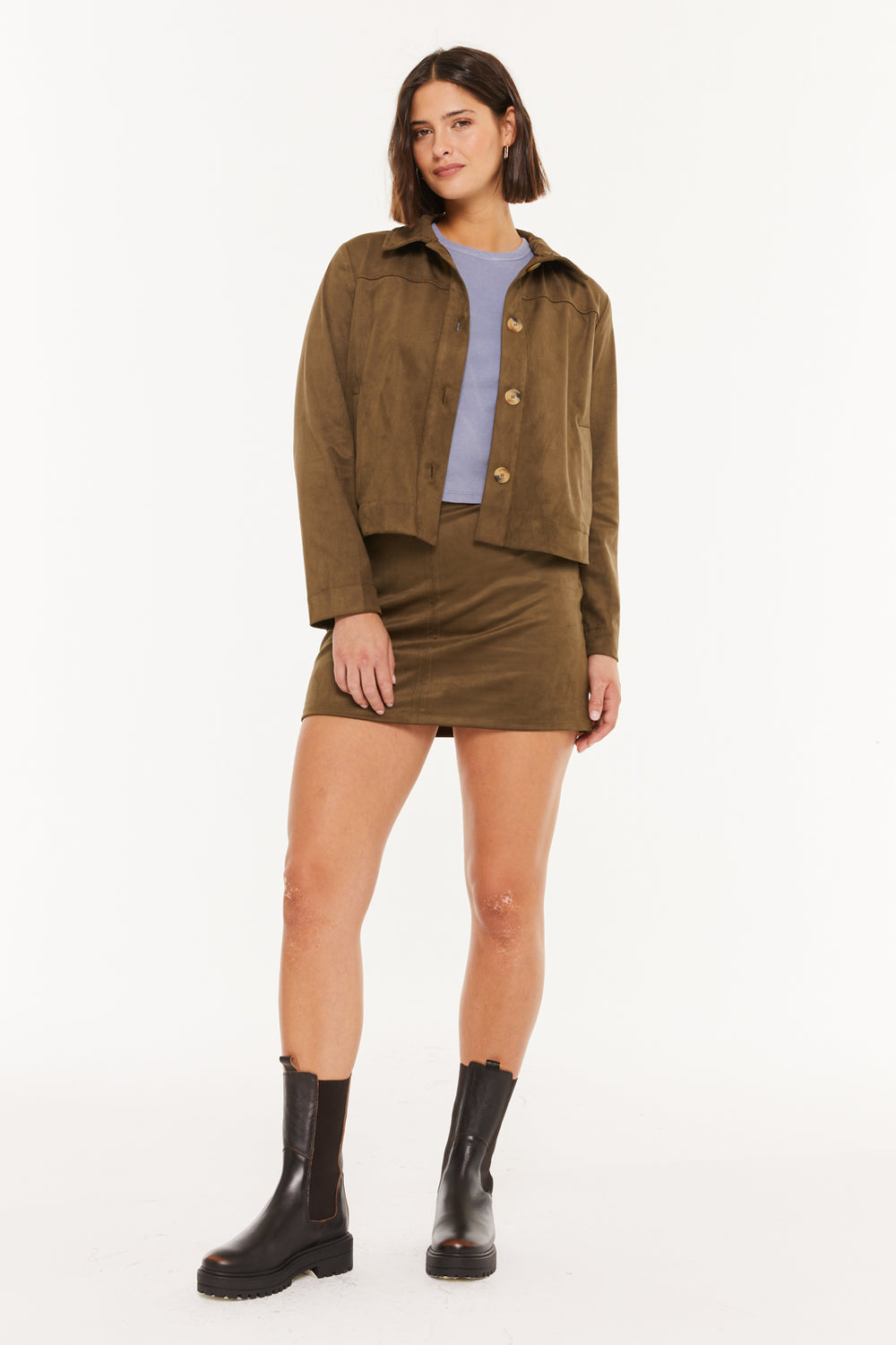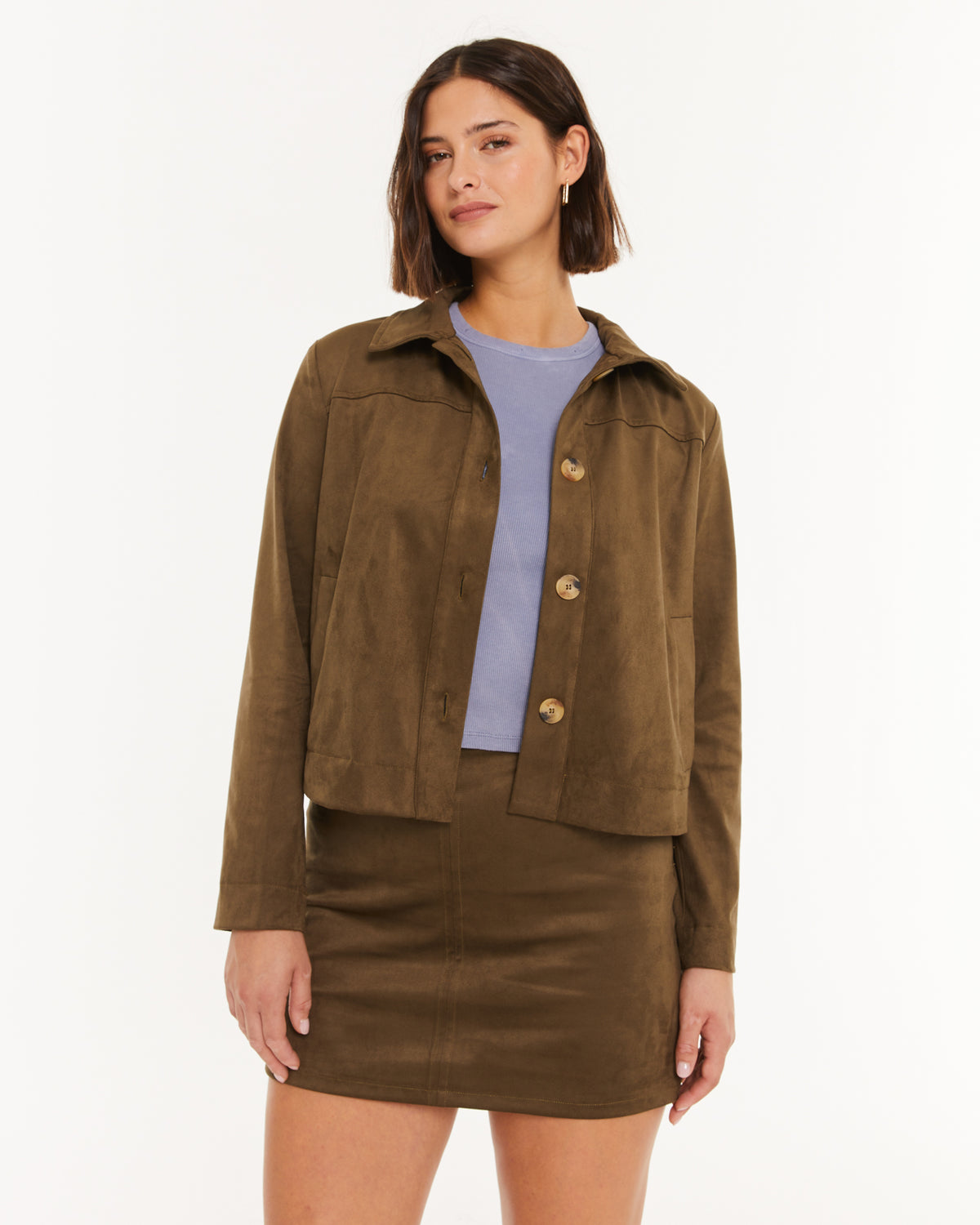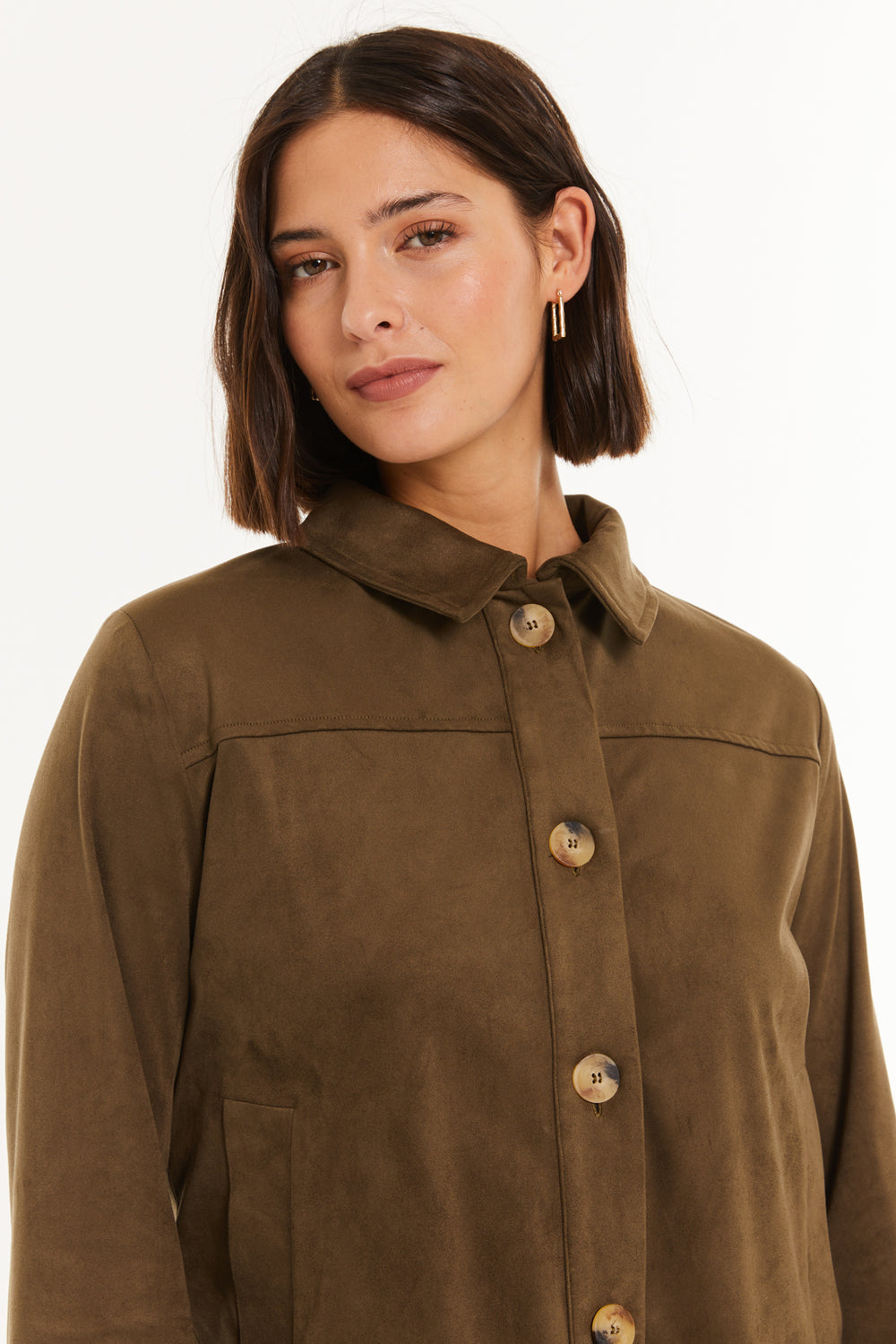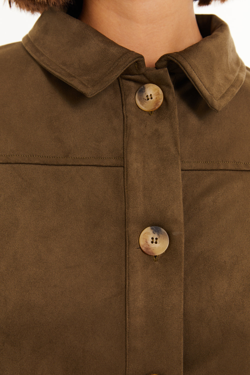 Chaqueta de mujer de antelina, con cuello camisero y cierre con botones.