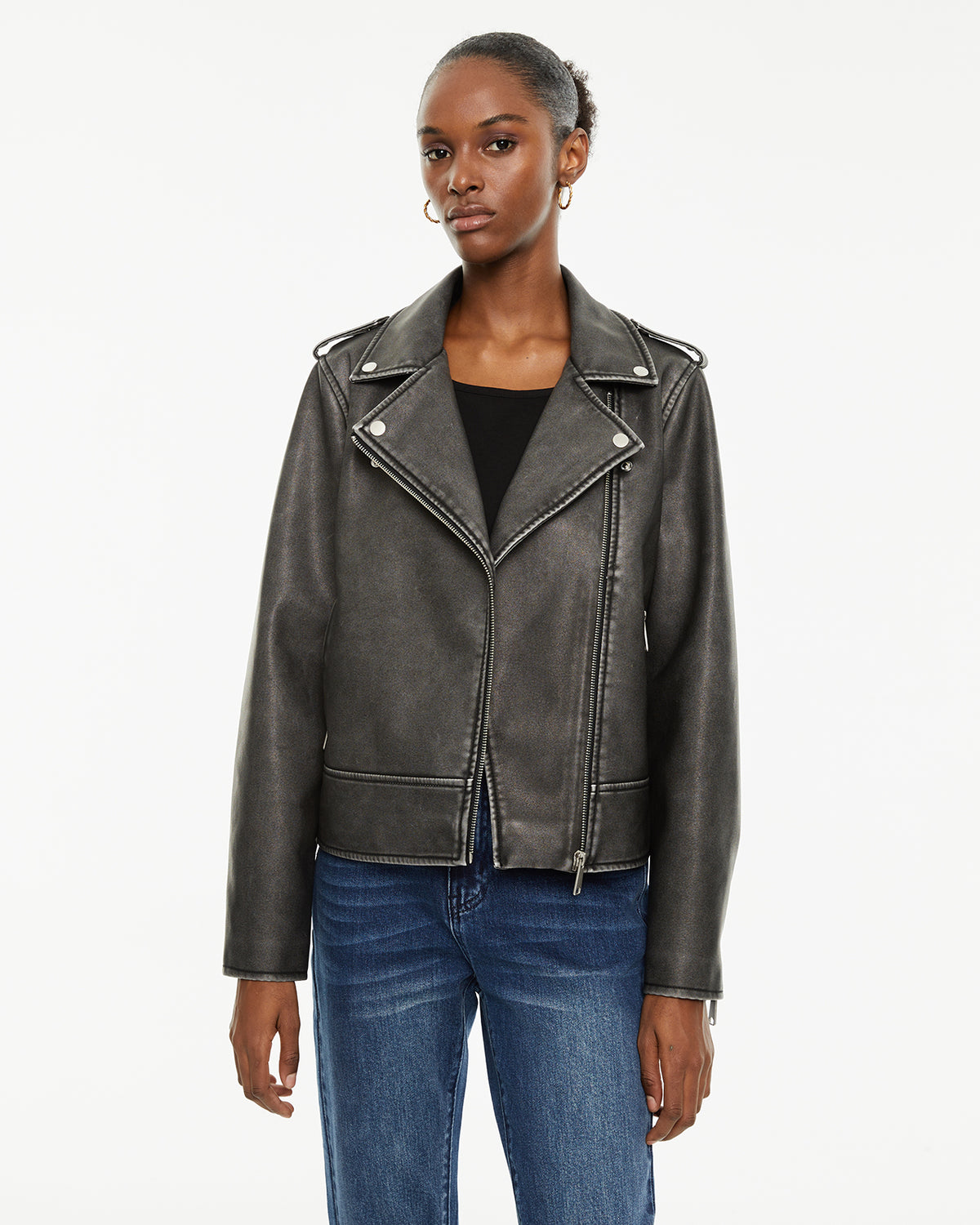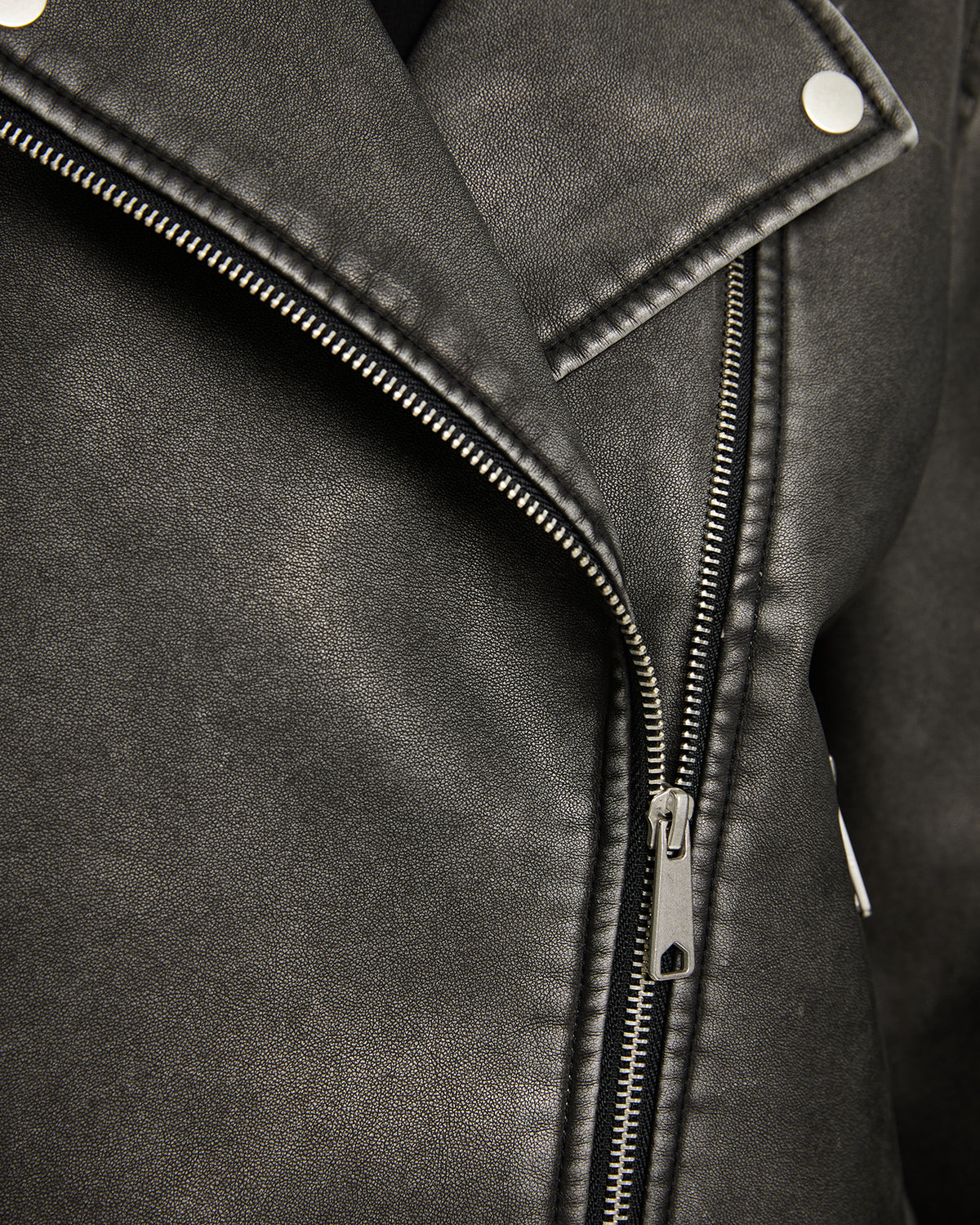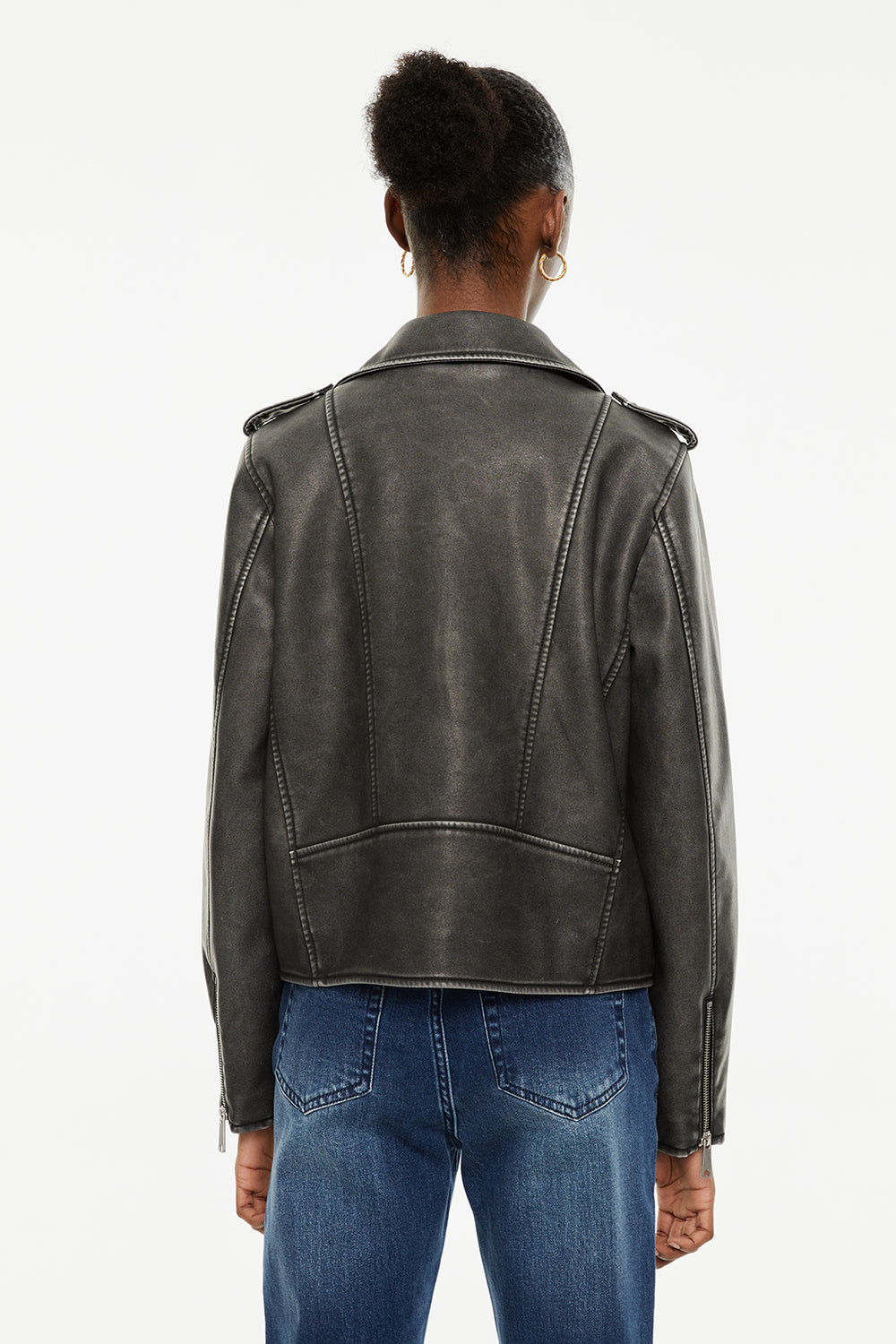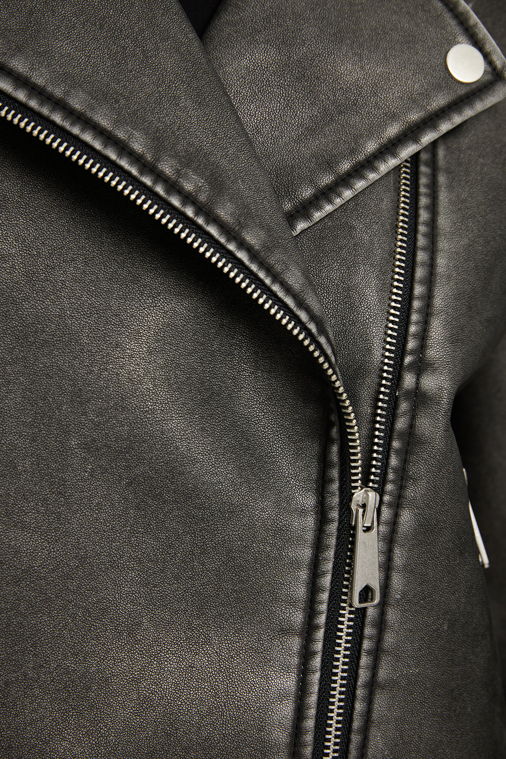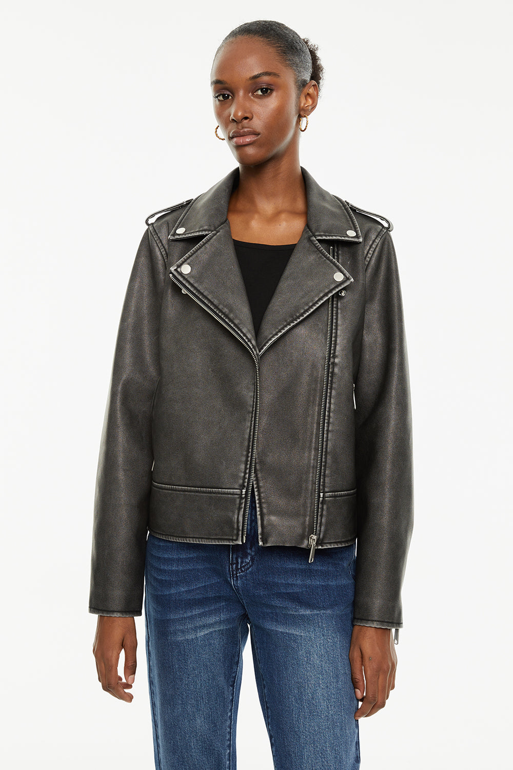 Cazadora de mujer efecto piel con cuello solapa, cierre delantero con cremallera, bolsillos delanteros con cremallera y manga larga con puño y cremallera.