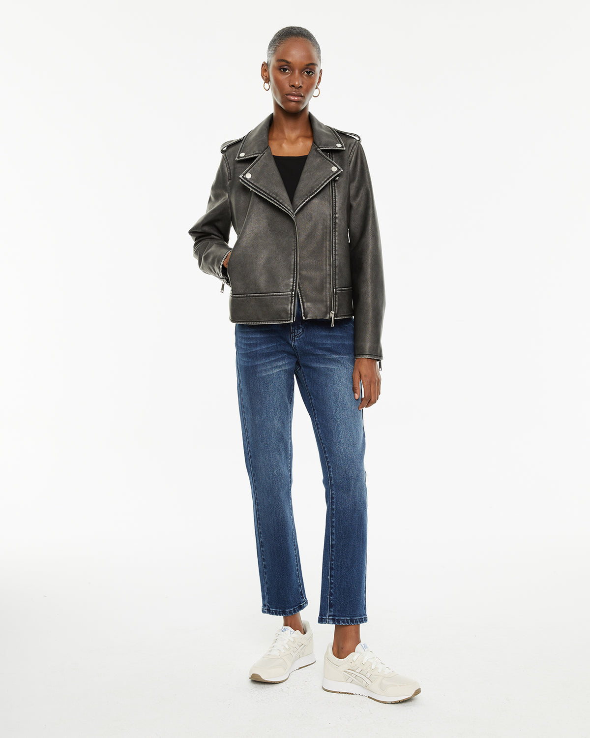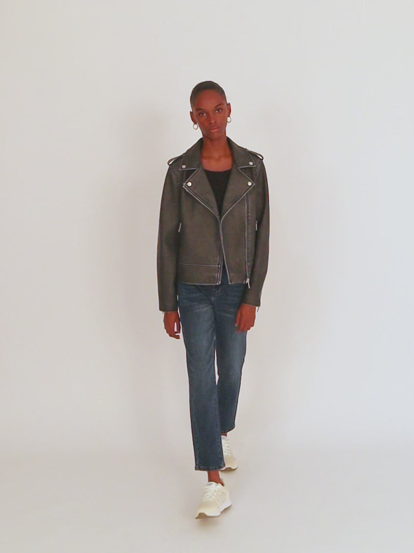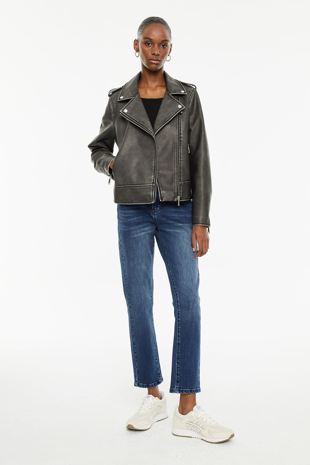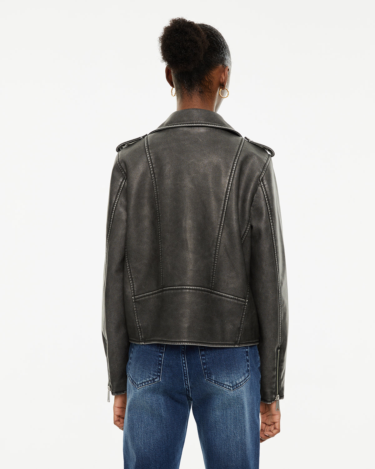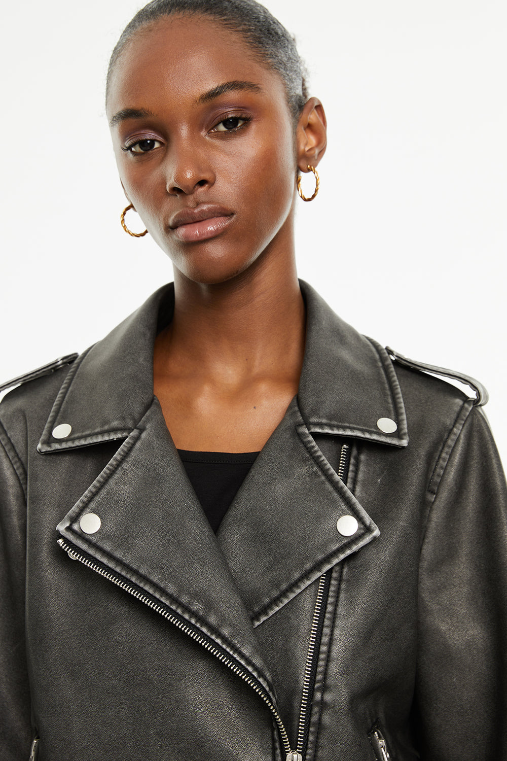 Cazadora de mujer efecto piel con cuello solapa, cierre delantero con cremallera, bolsillos delanteros con cremallera y manga larga con puño y cremallera.