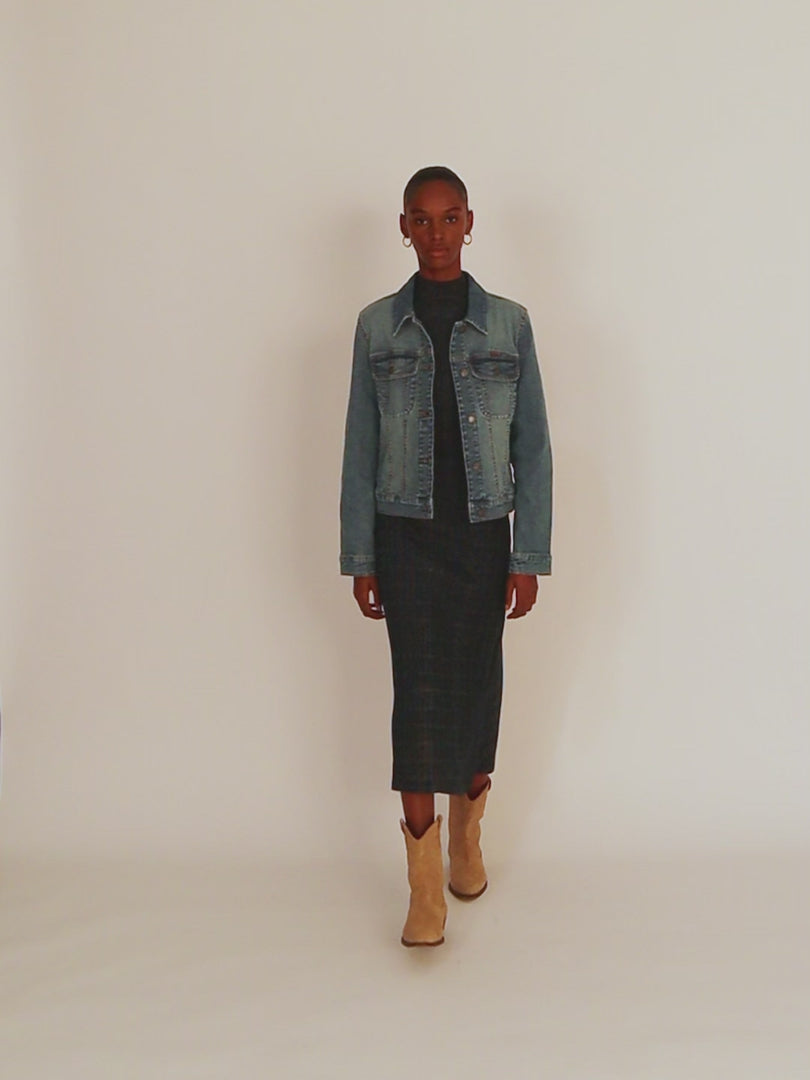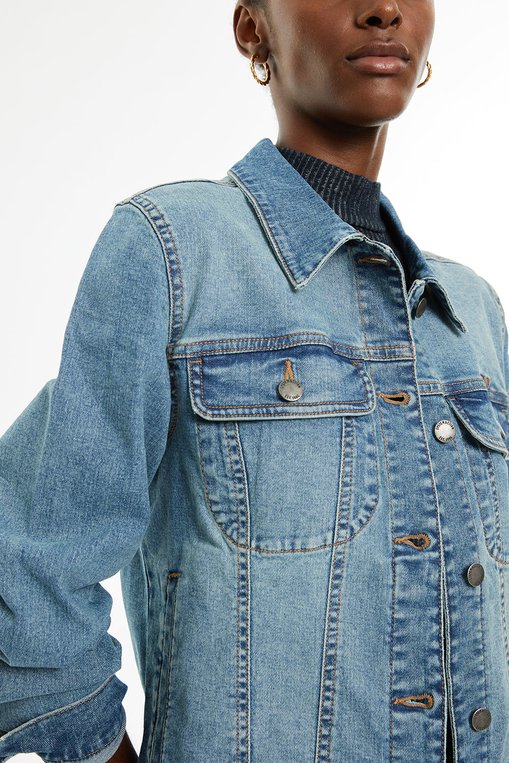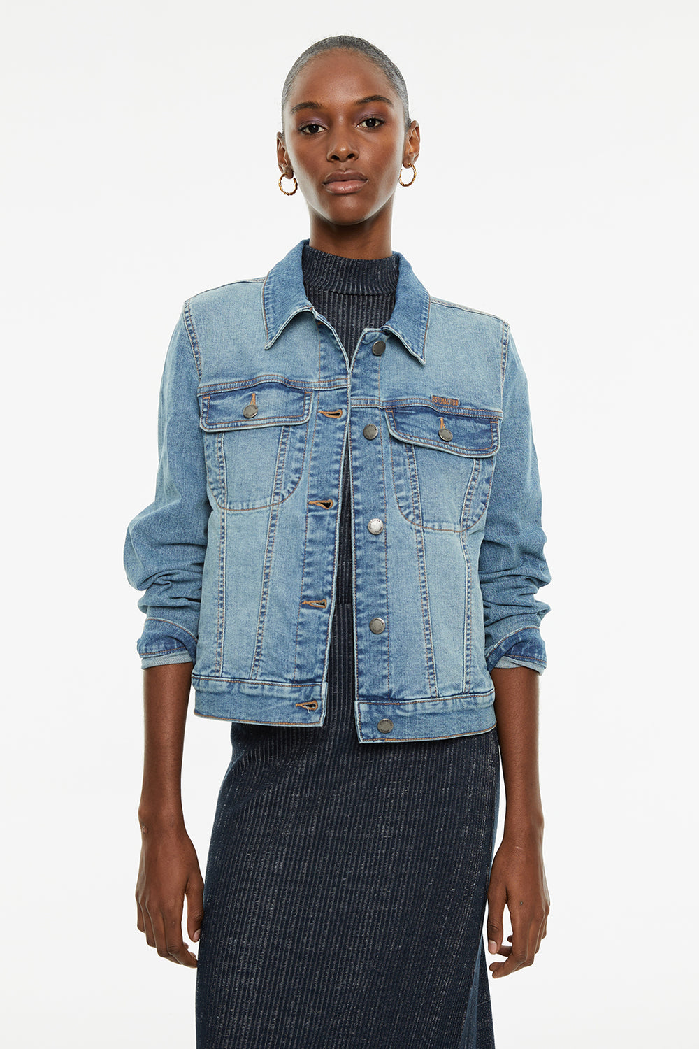 Cazadora vaquera de mujer de manga larga y cuello camisero con botones plata.