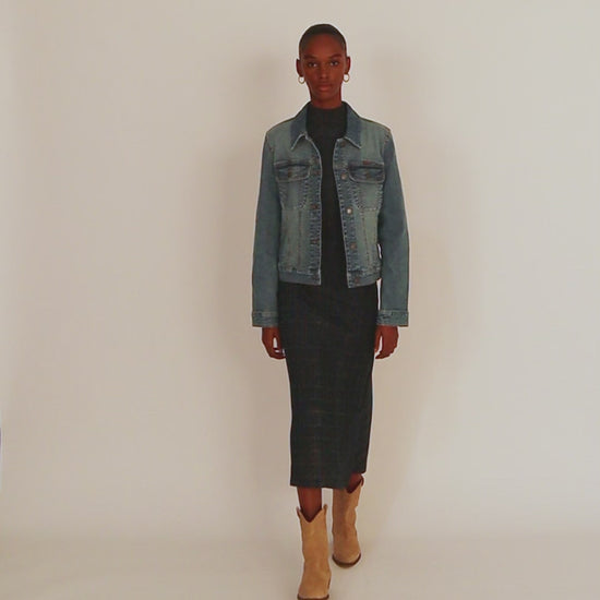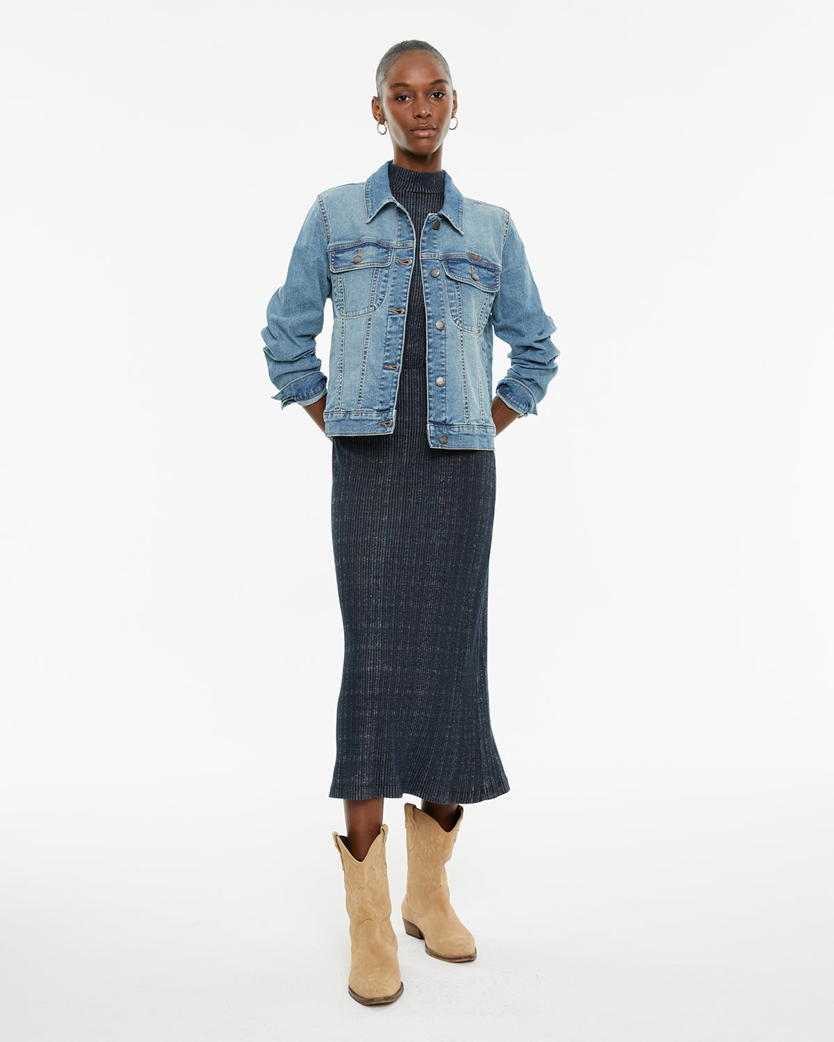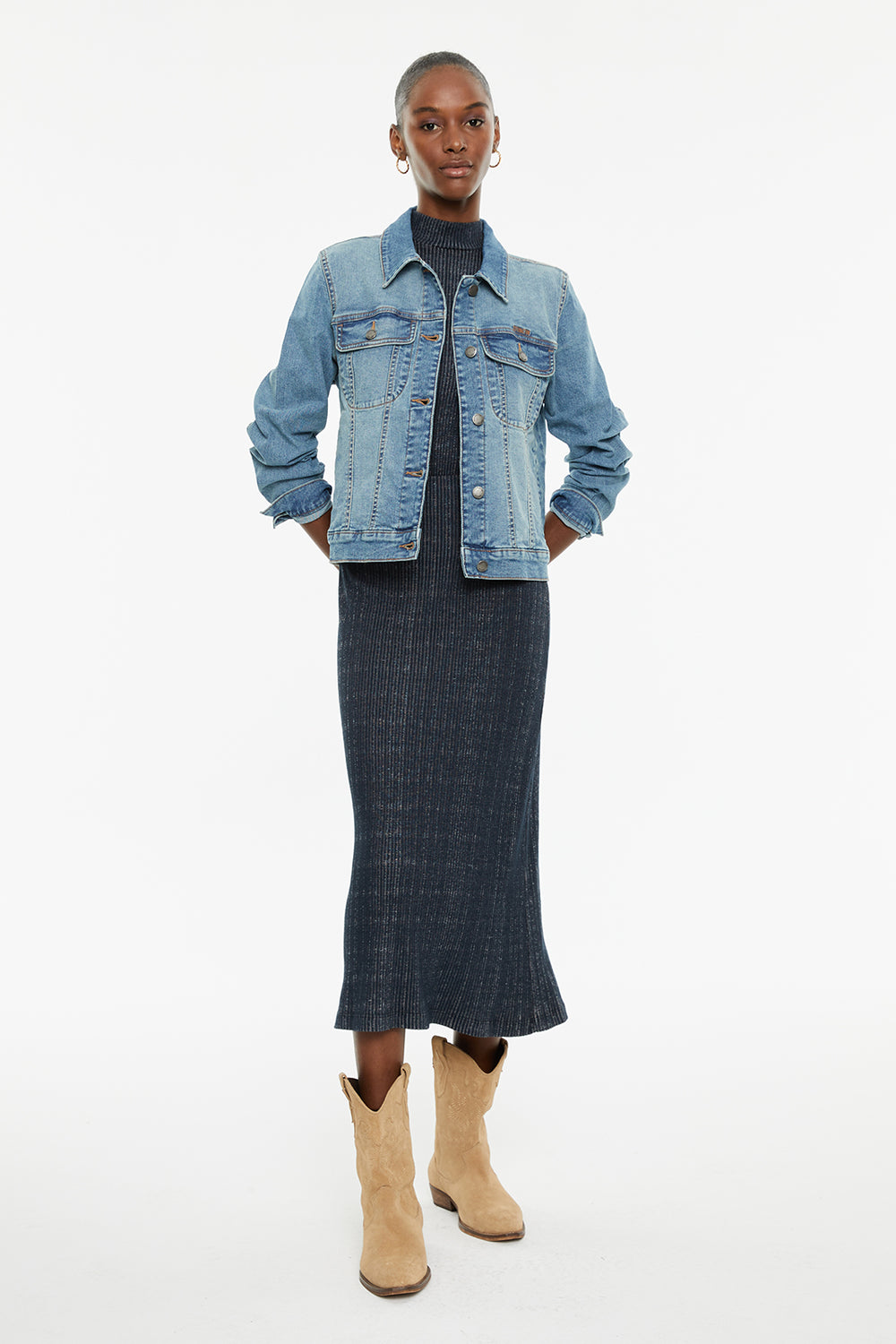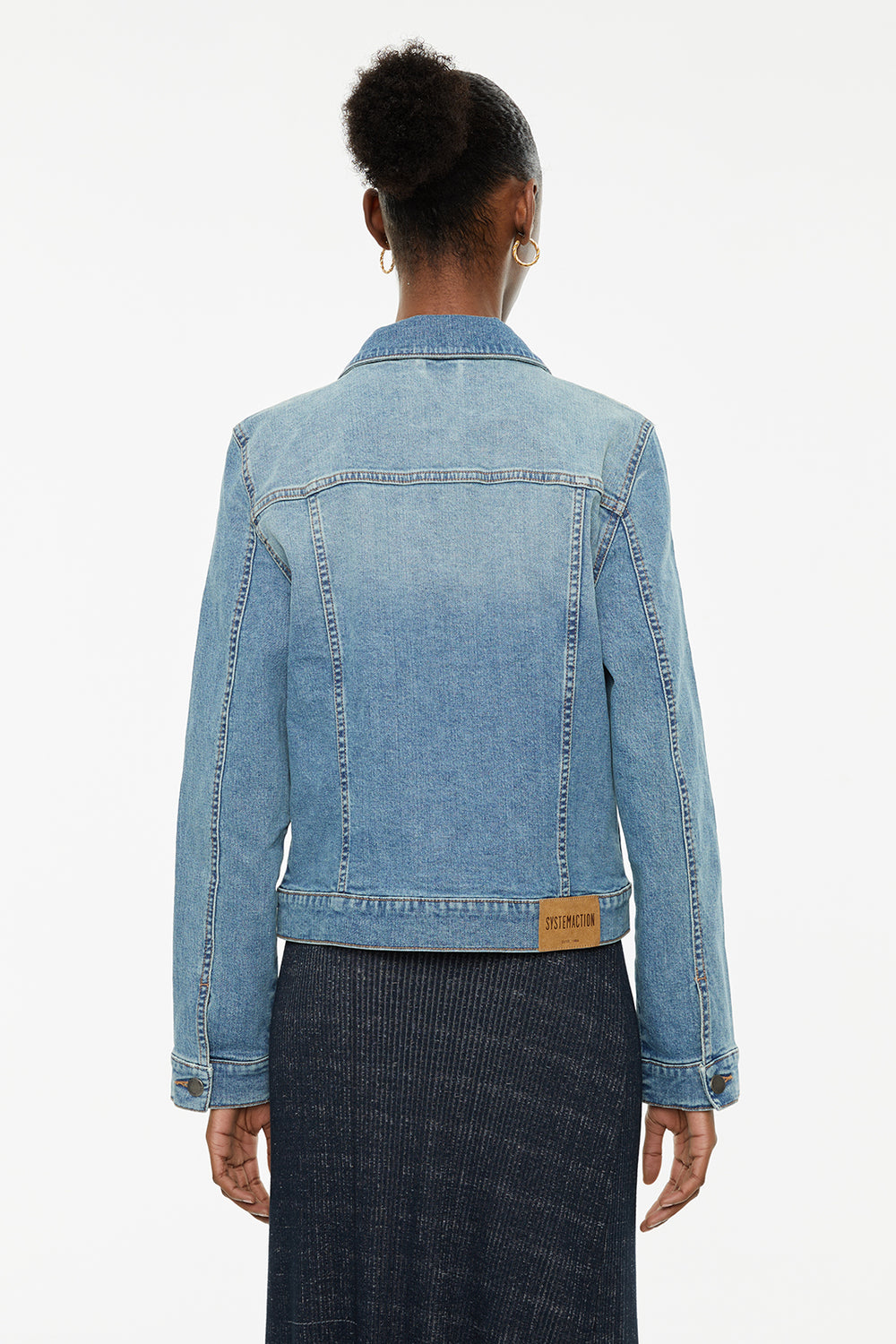 Cazadora vaquera de mujer de manga larga y cuello camisero con botones plata.