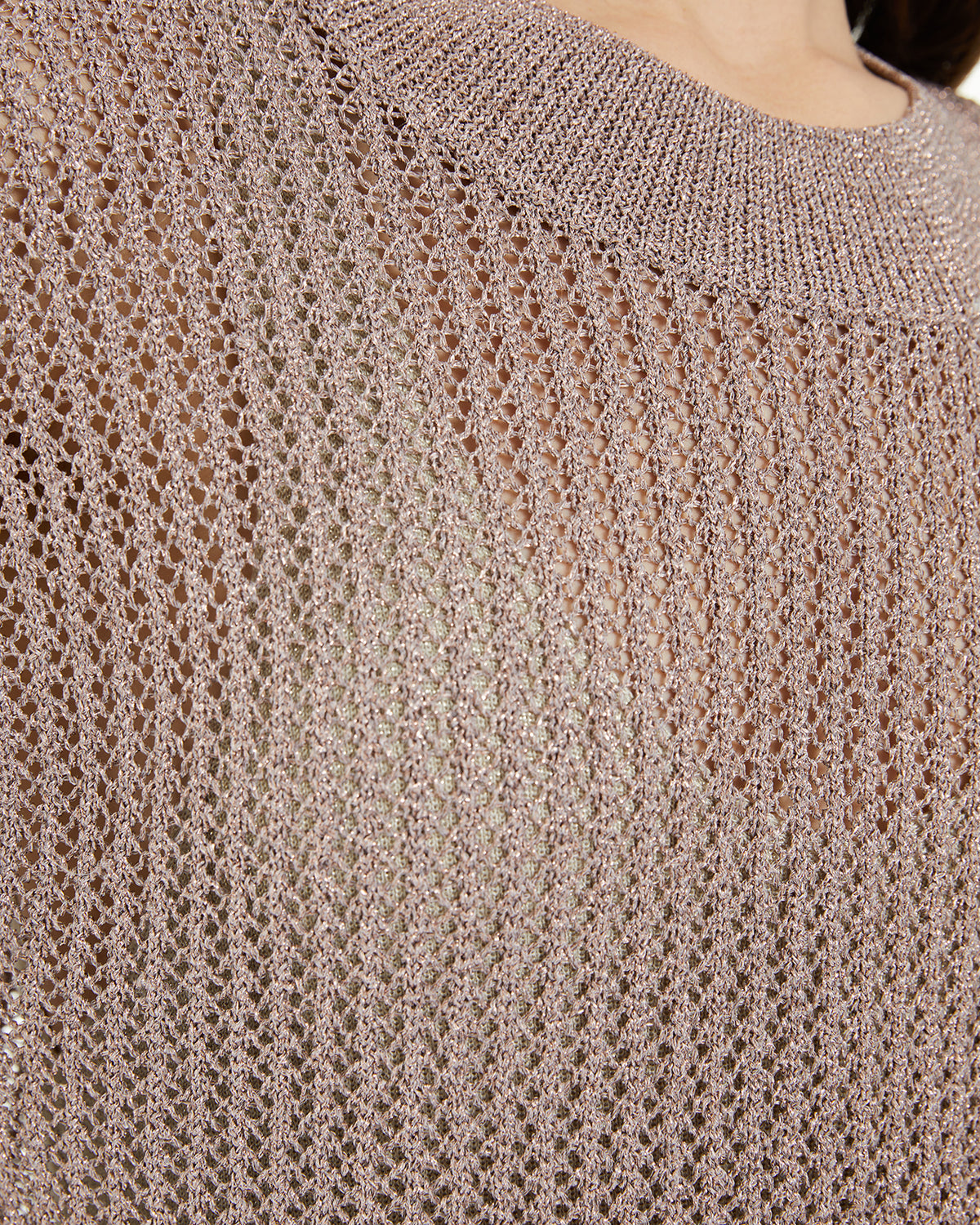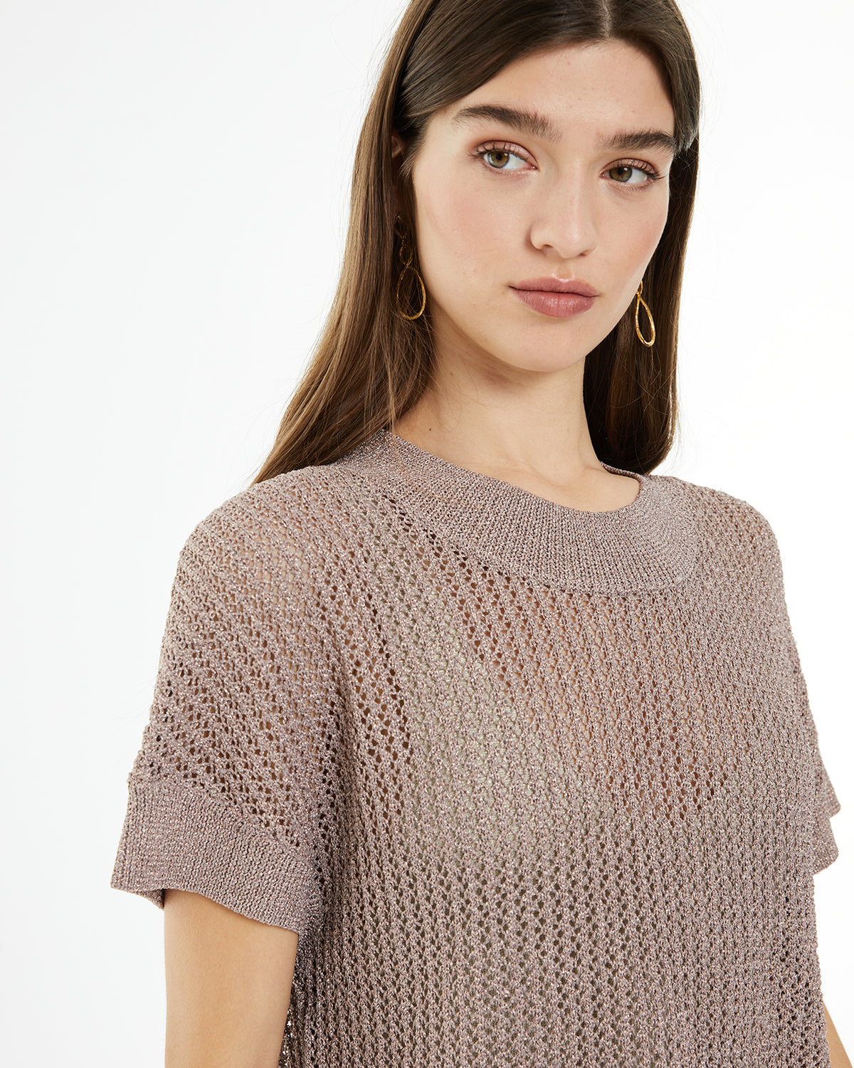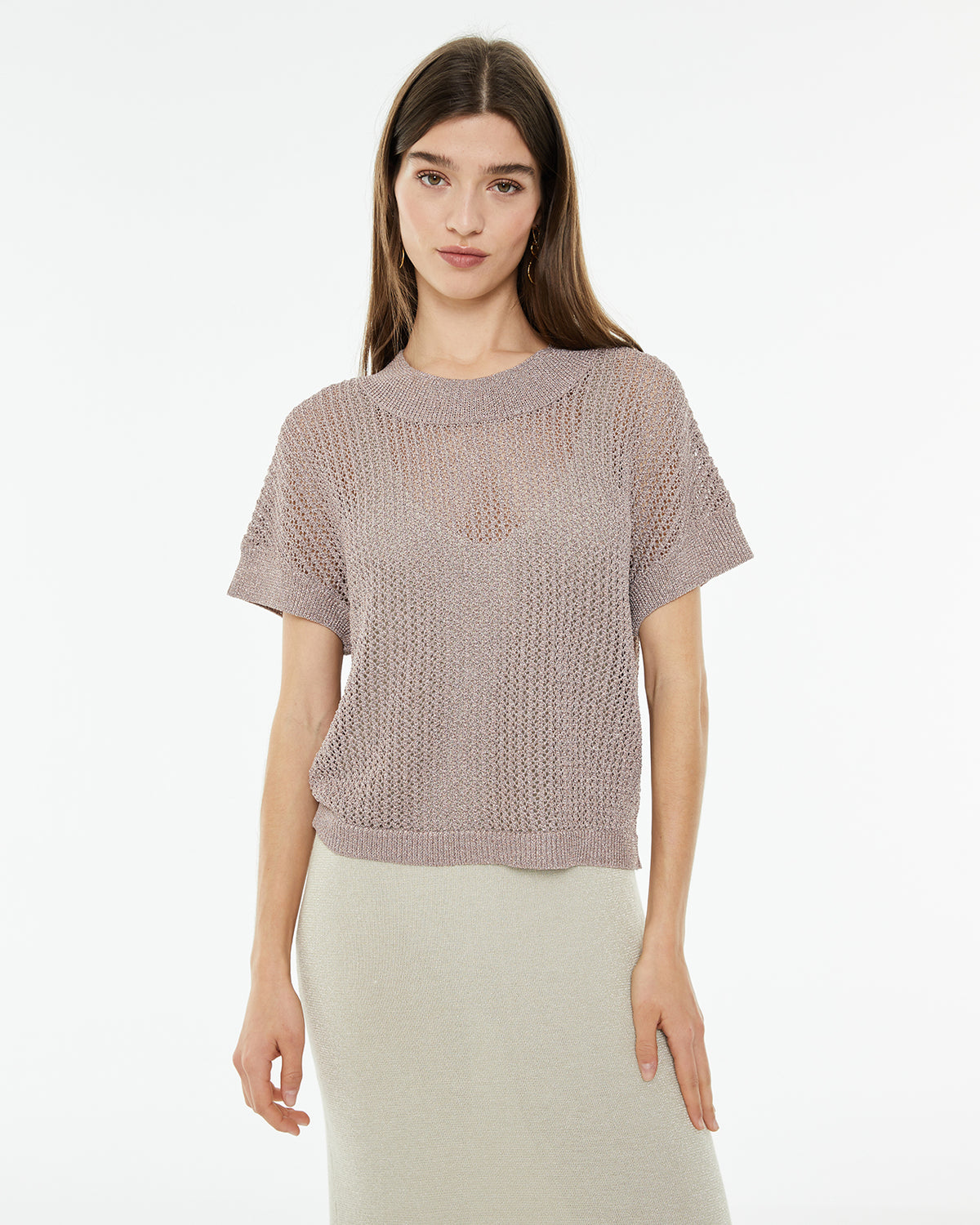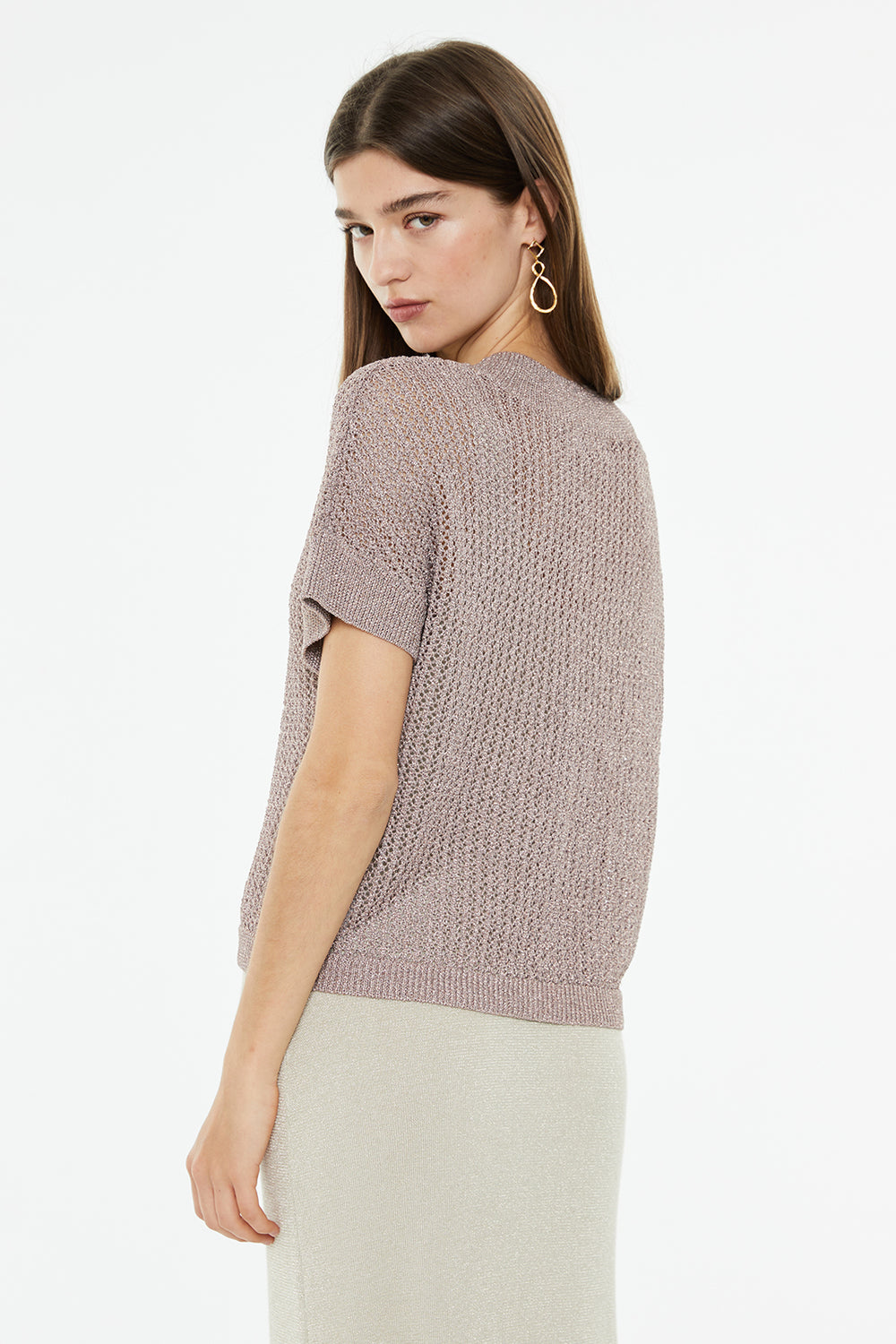Jersey calado de mujer con punto de lúrex, manga caída, escote redondo y acabados en rib.