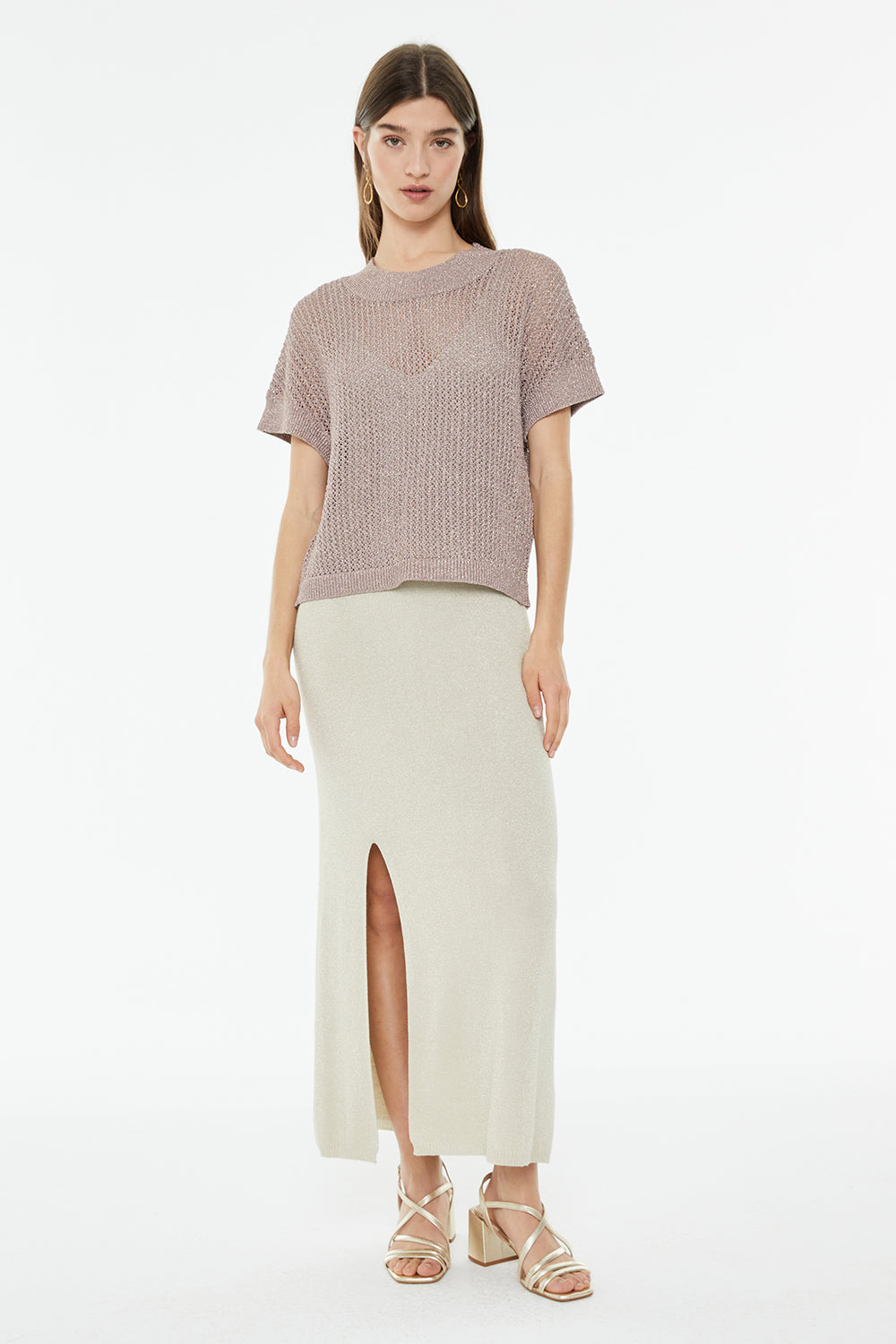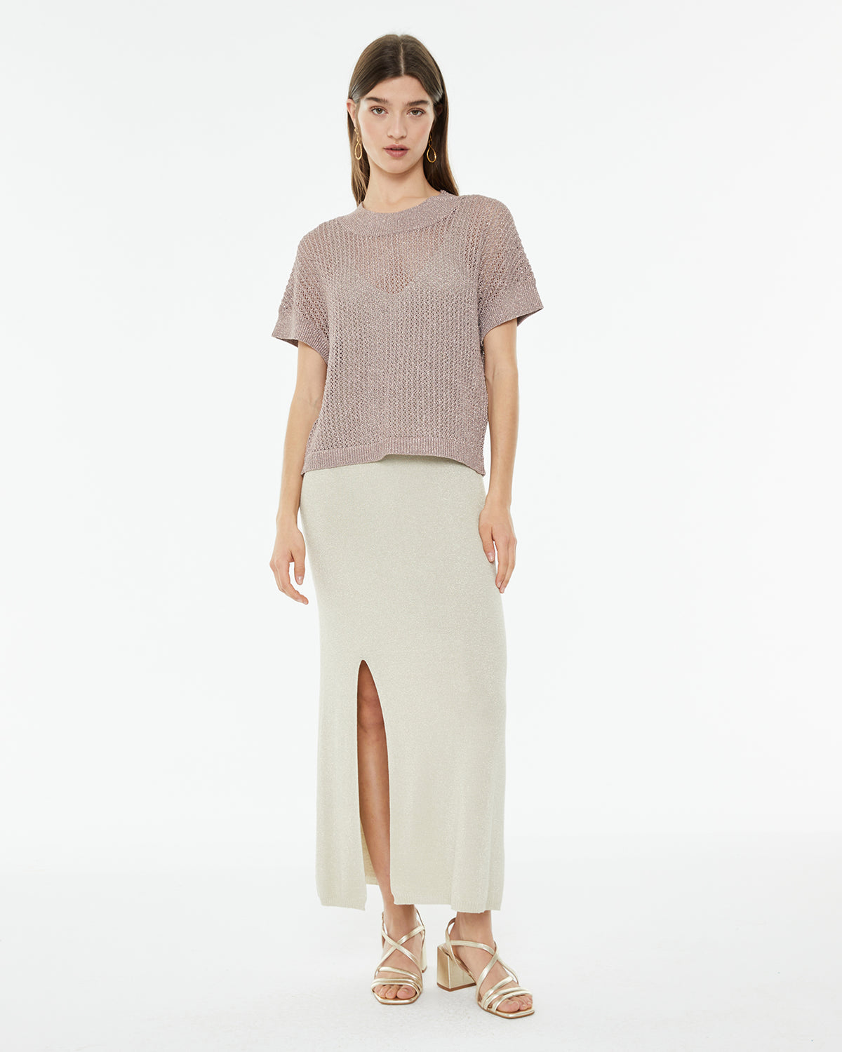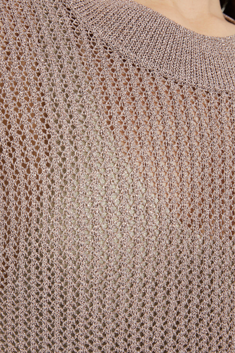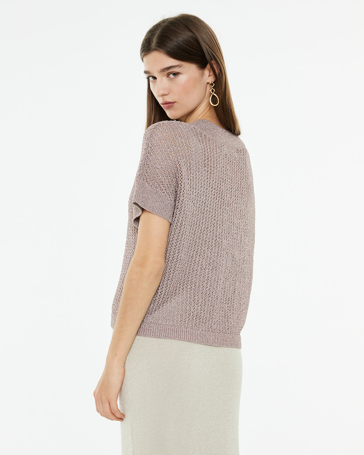 Jersey calado de mujer con punto de lúrex, manga caída, escote redondo y acabados en rib.