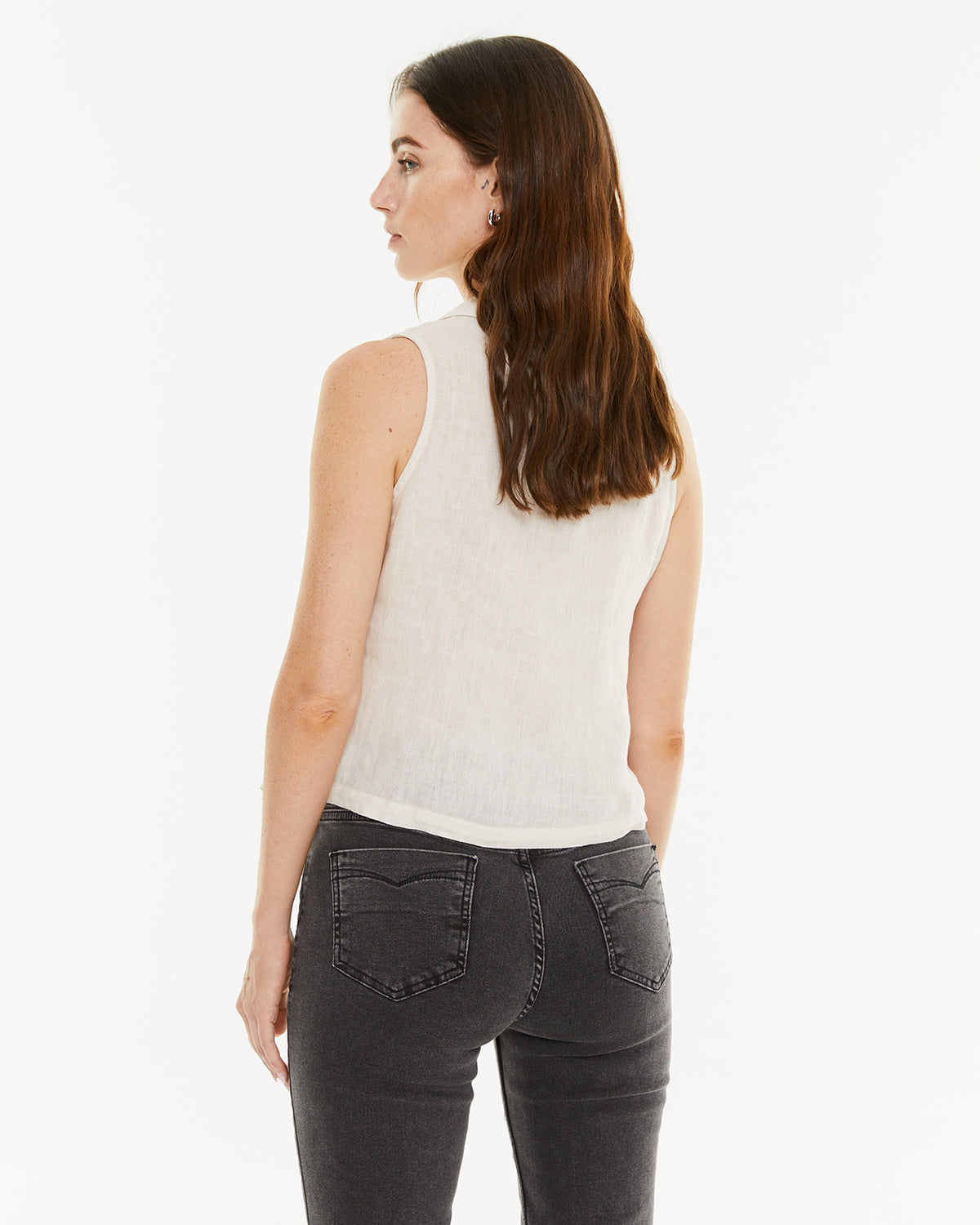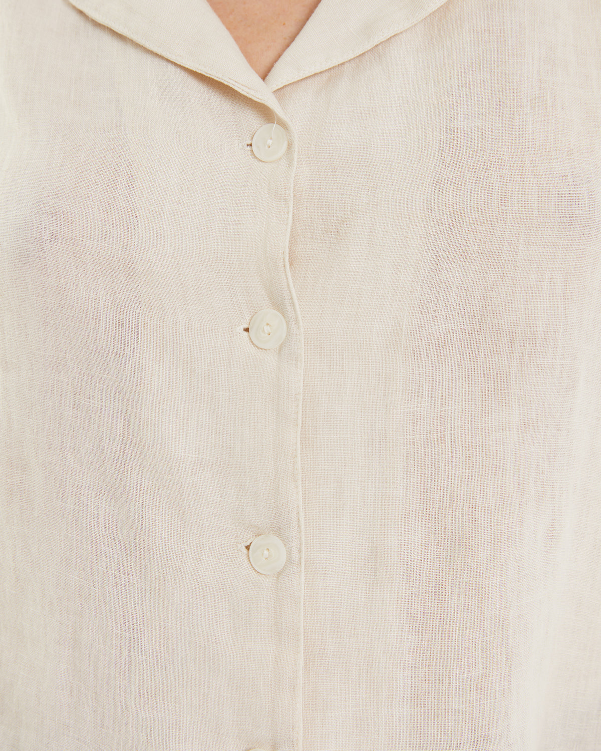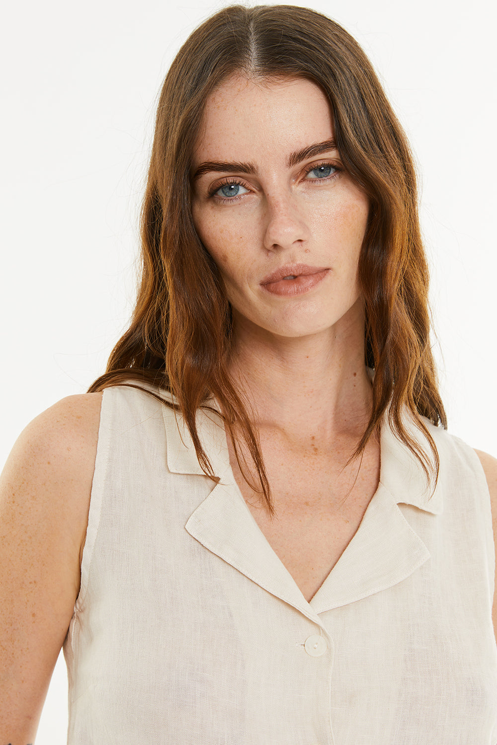 Chaleco de mujer de lino con cuello solapa y cierre frontal con dos botones. Fit recto.