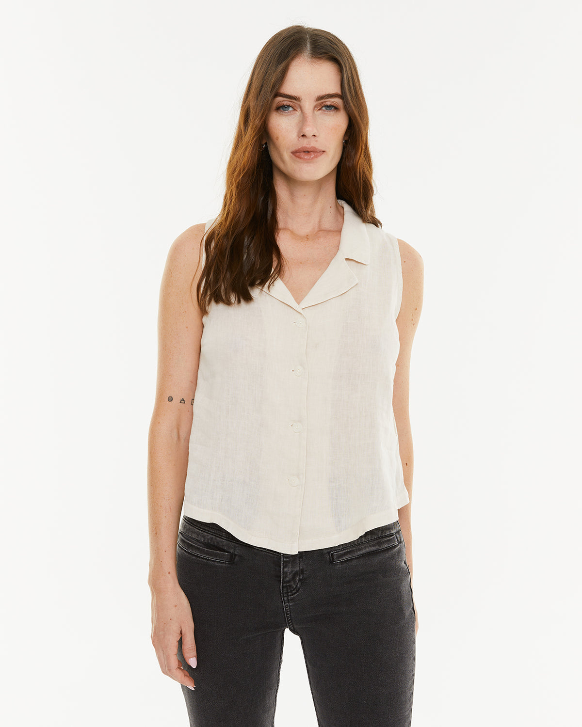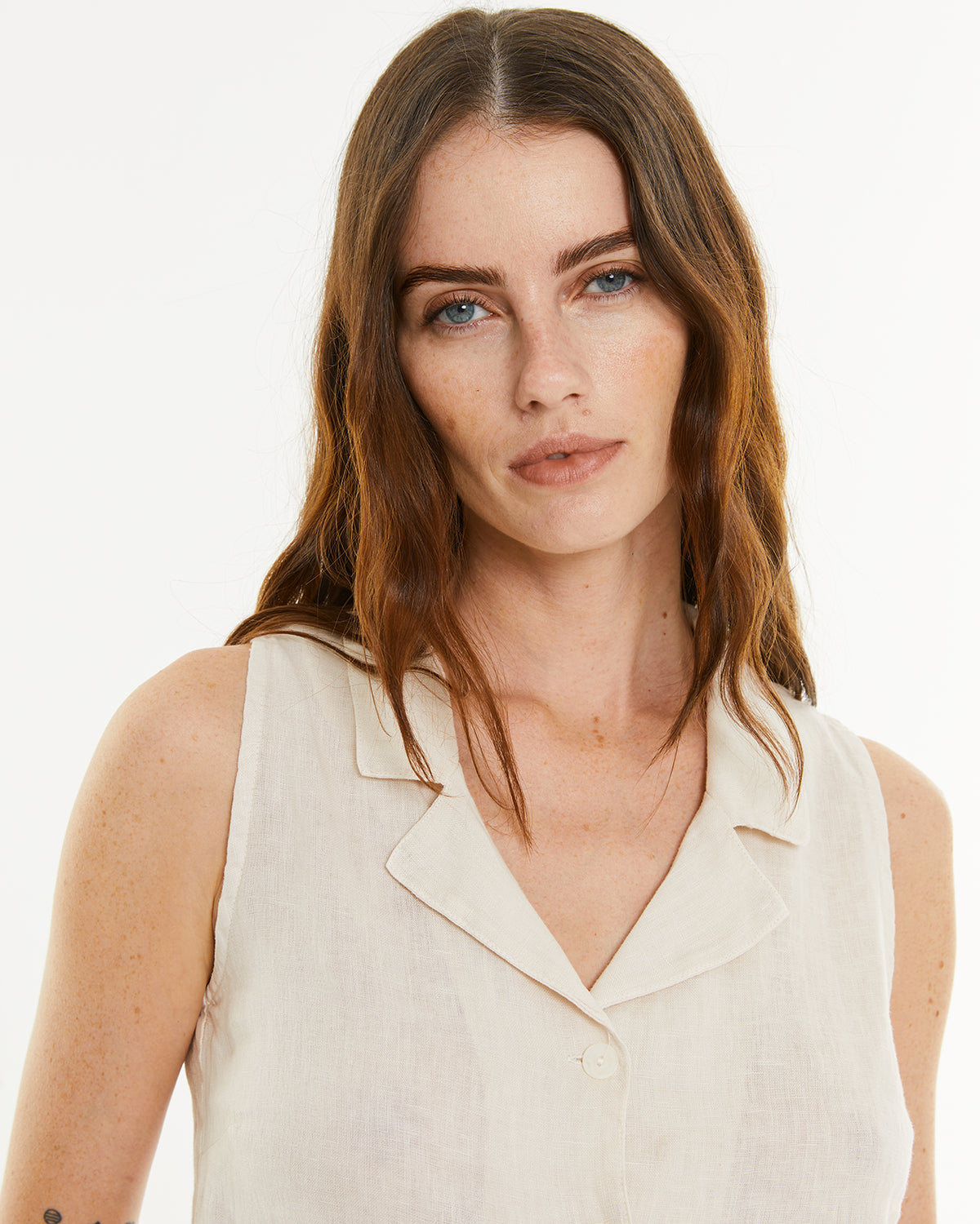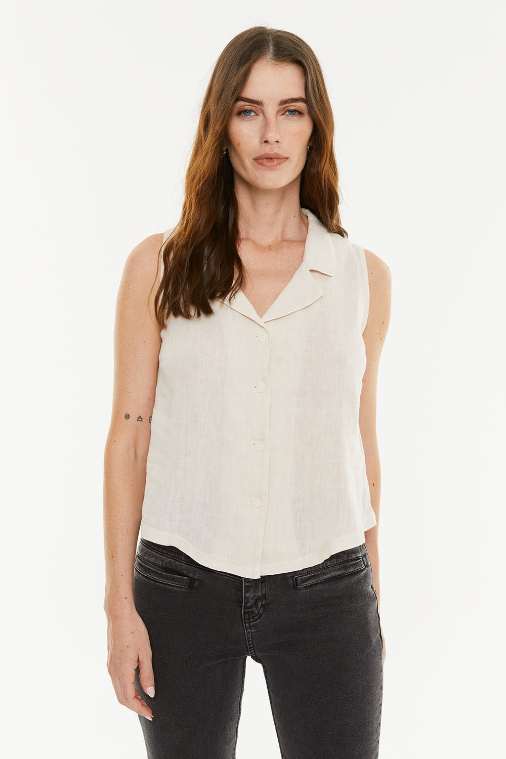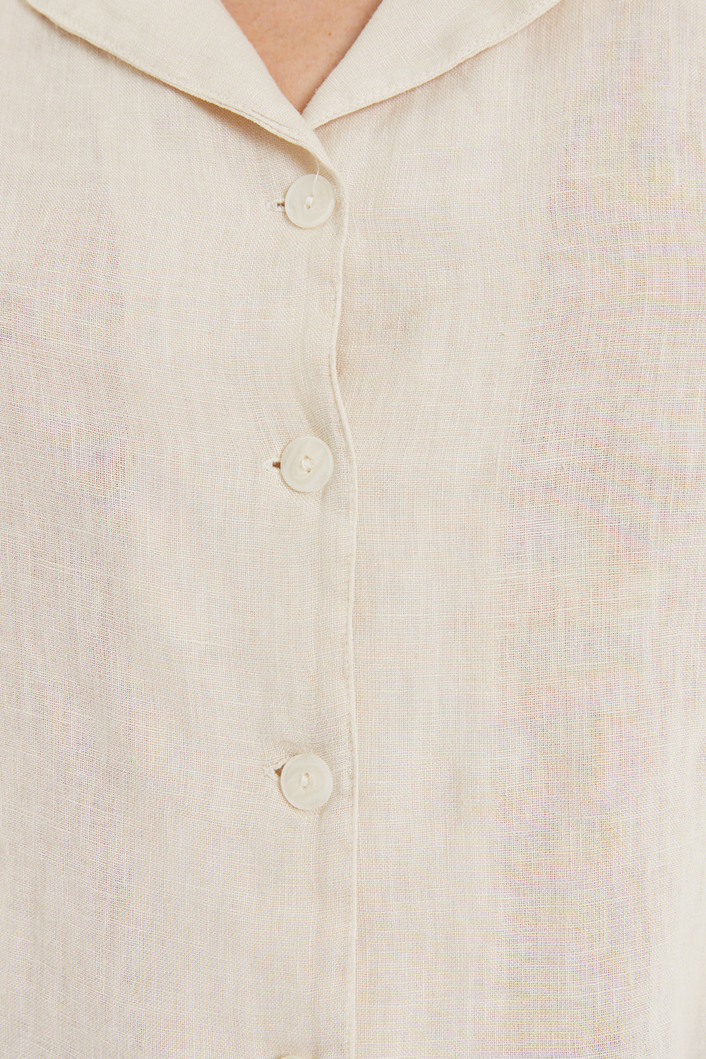 Chaleco de mujer de lino con cuello solapa y cierre frontal con dos botones. Fit recto.