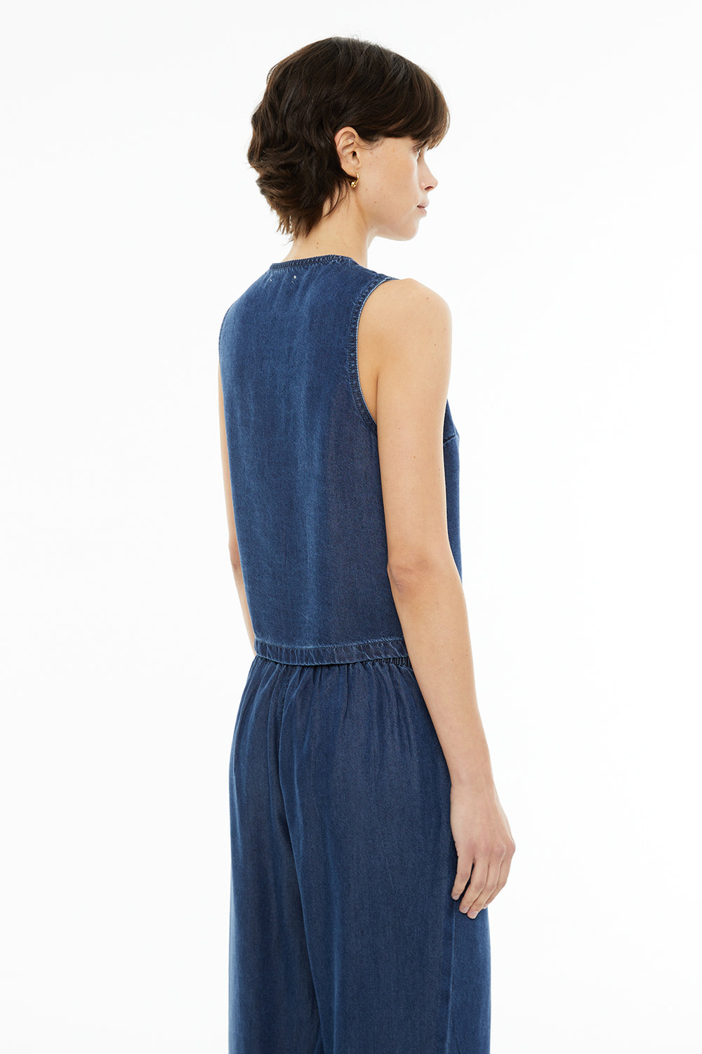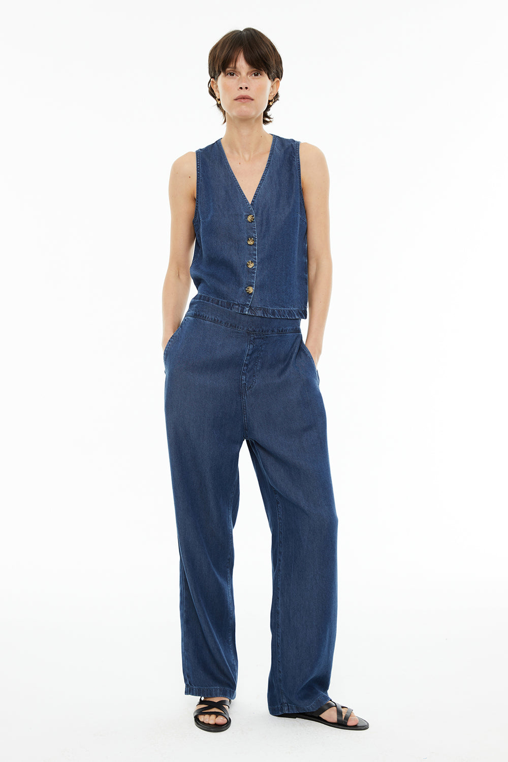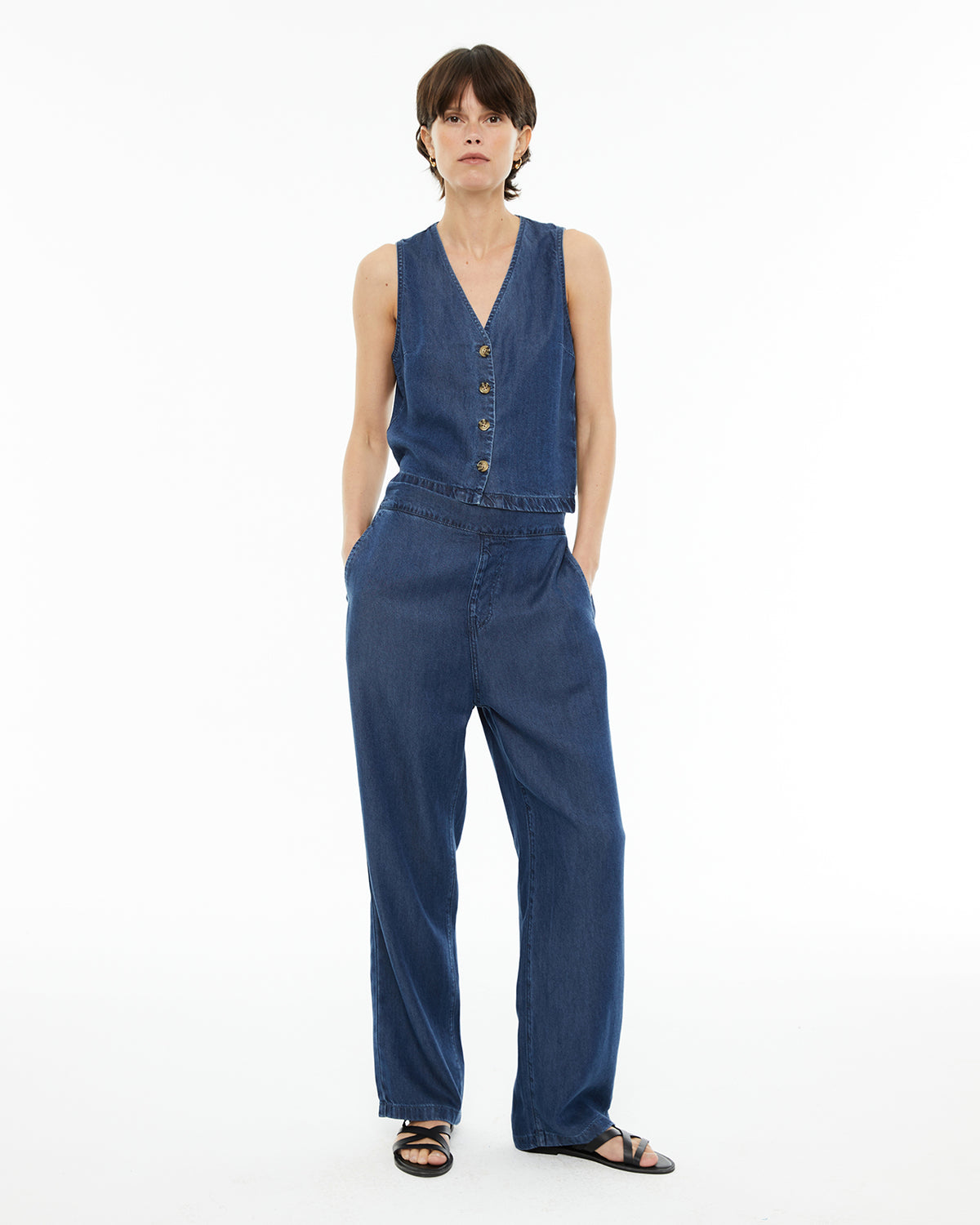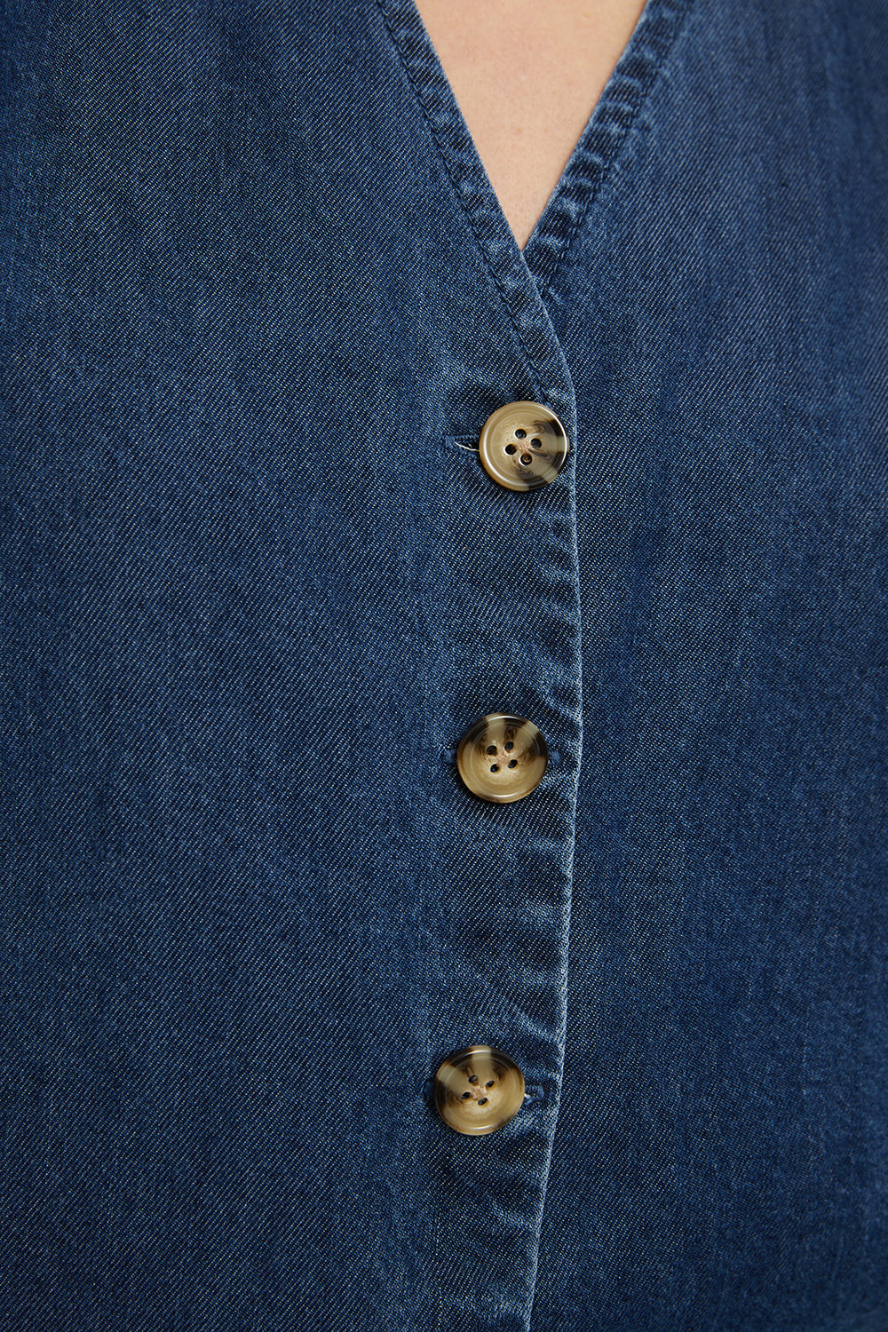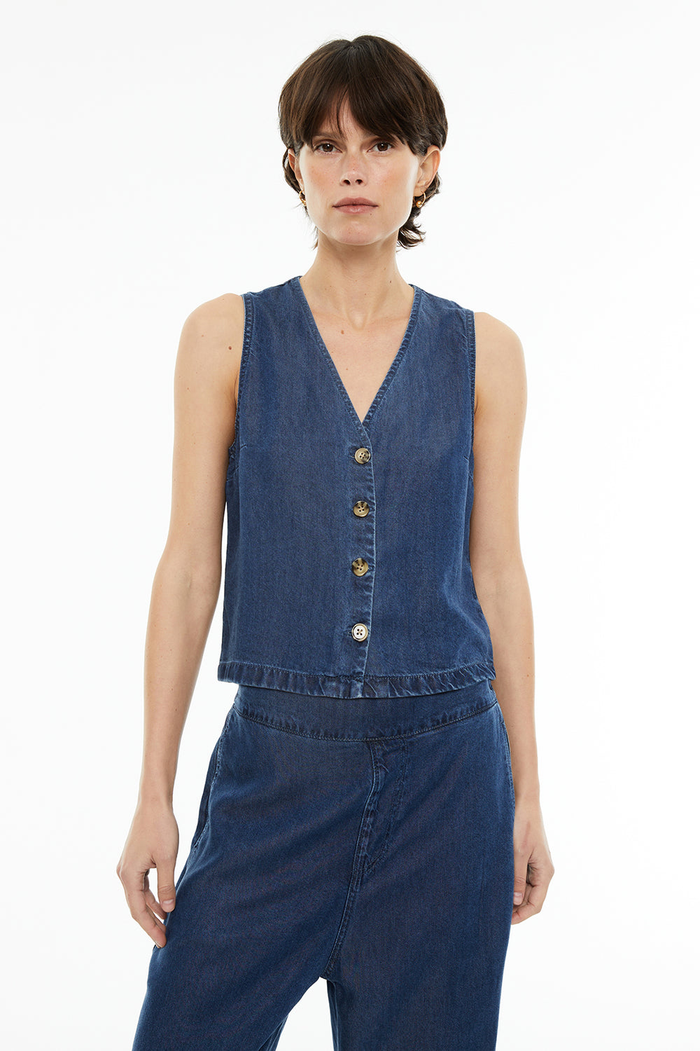 Chaleco de mujer fluido efecto denim con escote pico y cierre frontal con botones. Prenda sostenible.