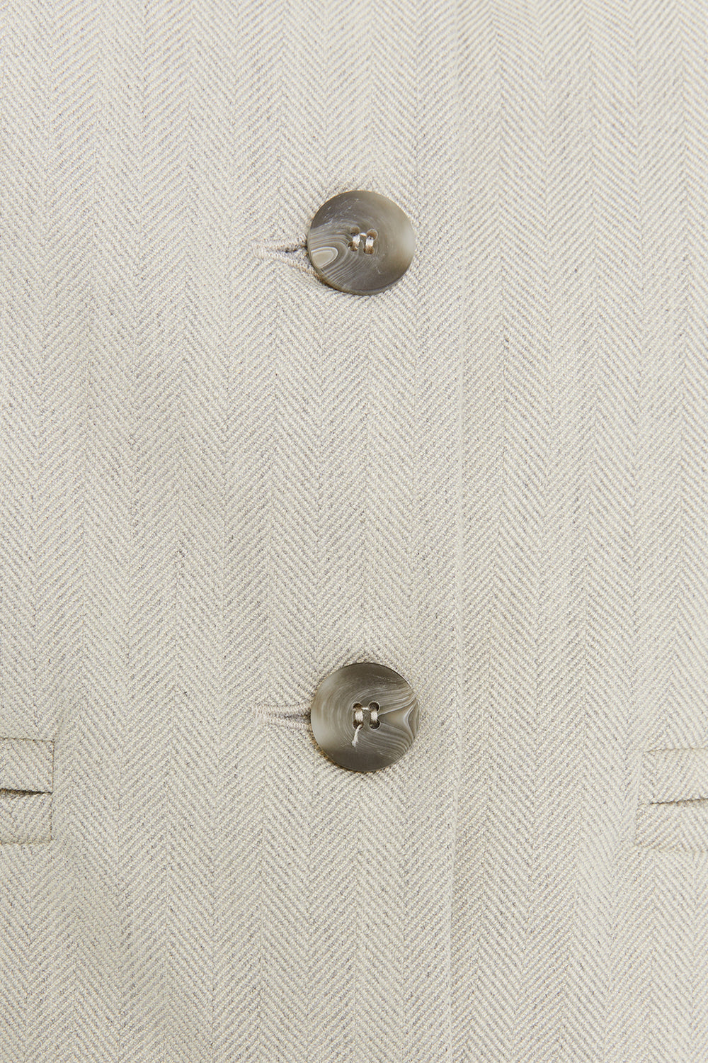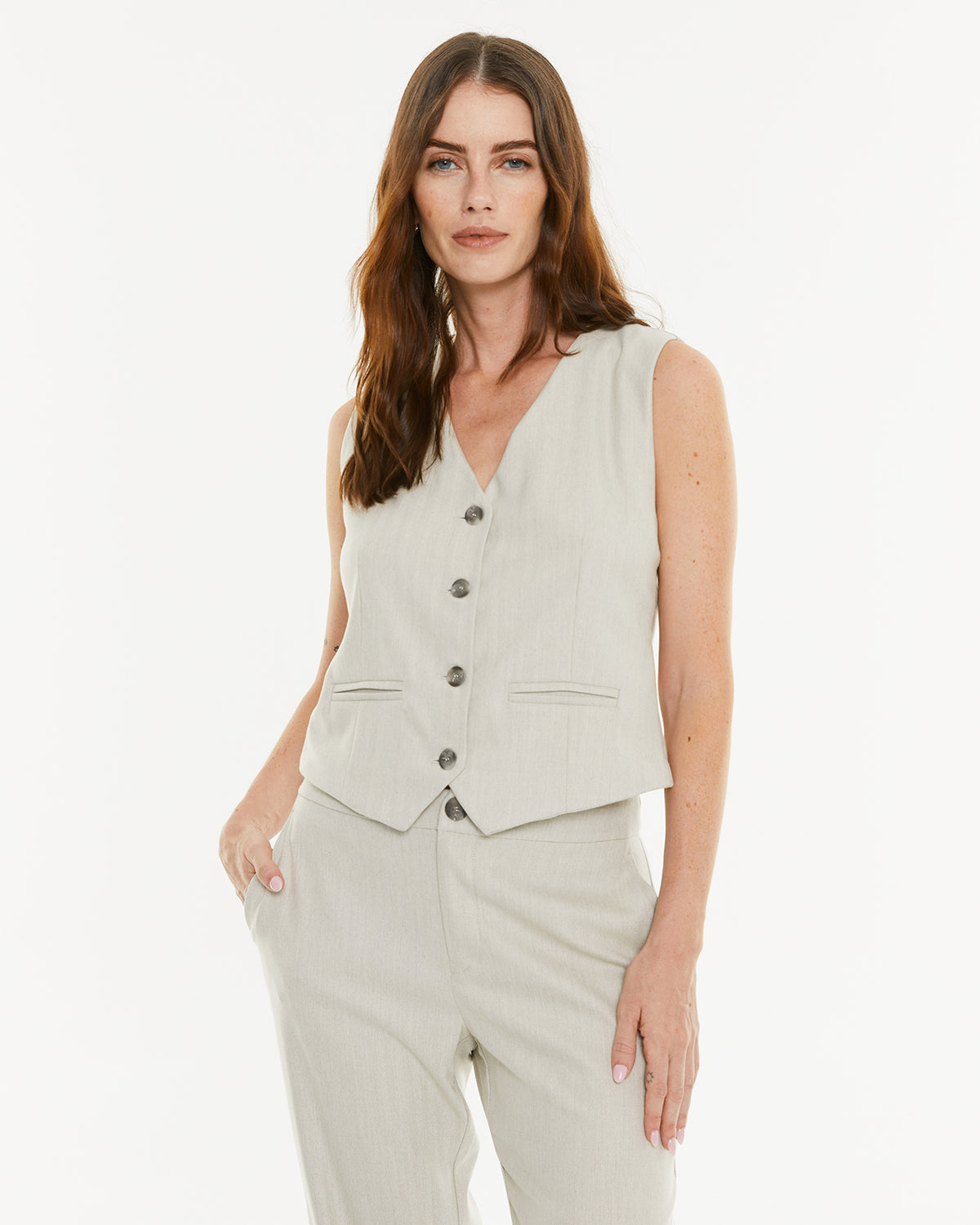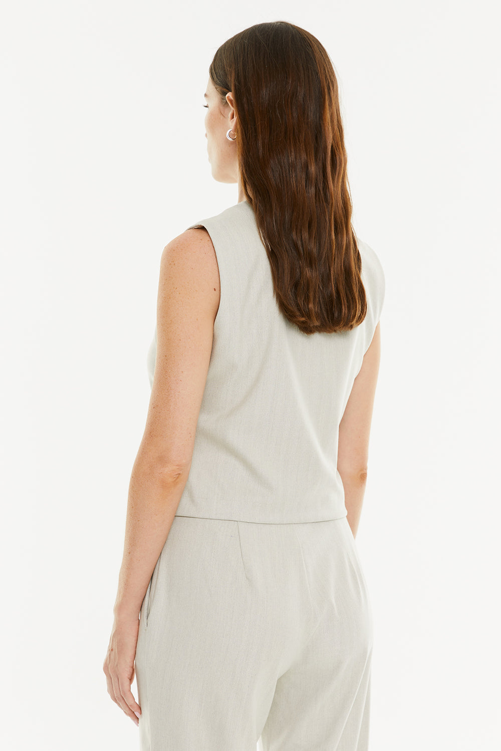 Chaleco entallado de mujer, con tejido de espiga, escote en pico, bolsillos de vivo y cierre frontal con botones. Prenda sostenible.