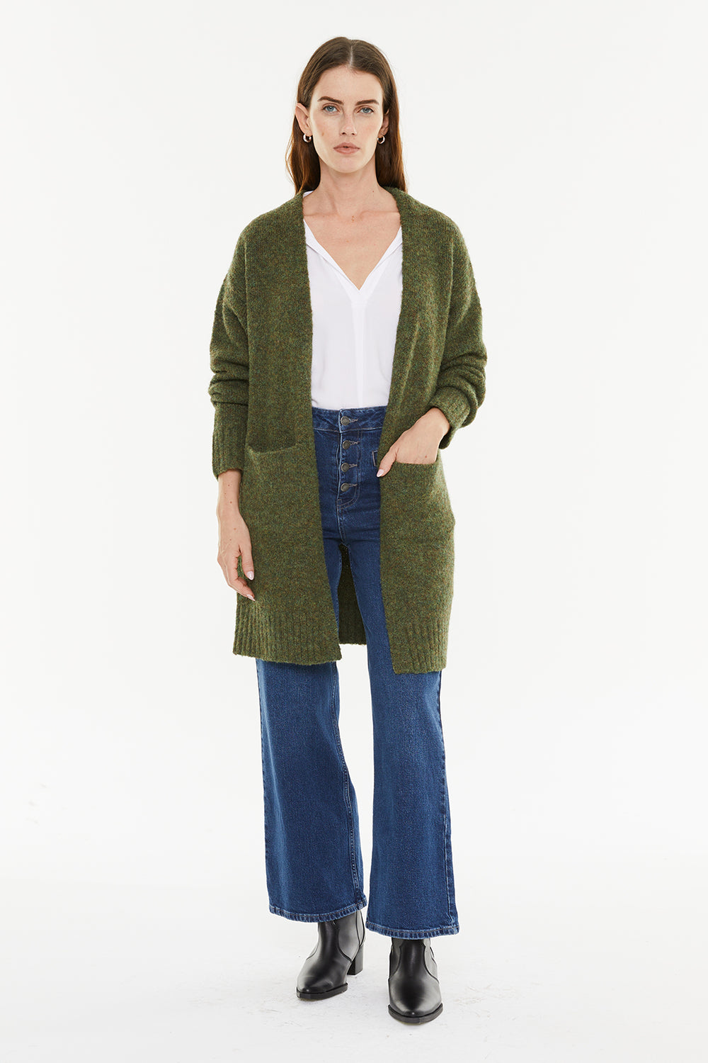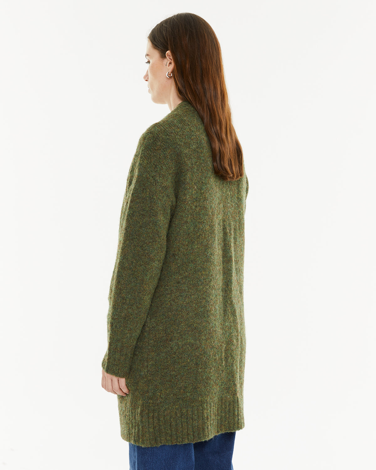 Chaqueta de punto de mujer, de talle largo, con bolsillos en el delantero. Prenda sostenible.