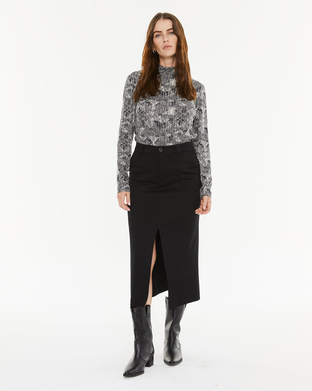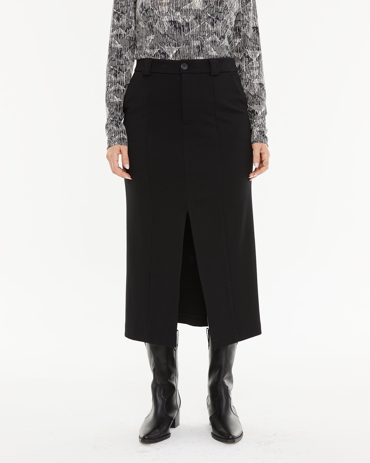 Falda lápiz midi de mujer con bolsillos laterales, abertura central en el delantero y cierre con botón.