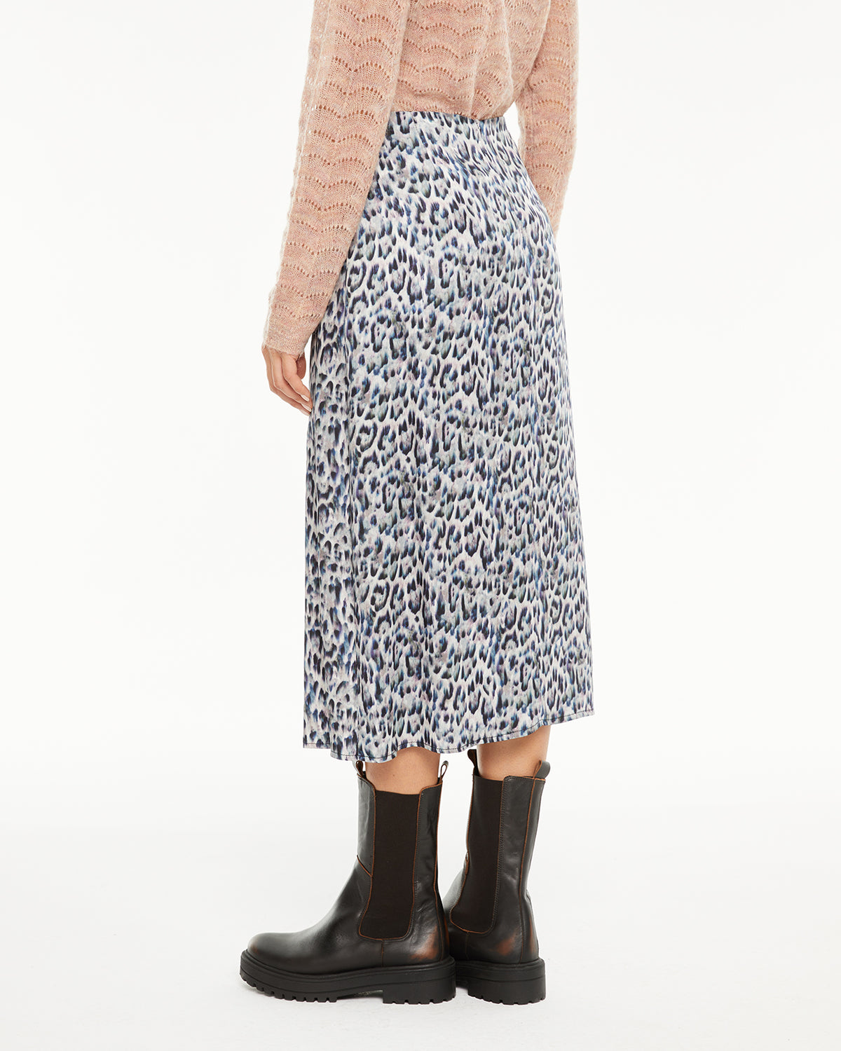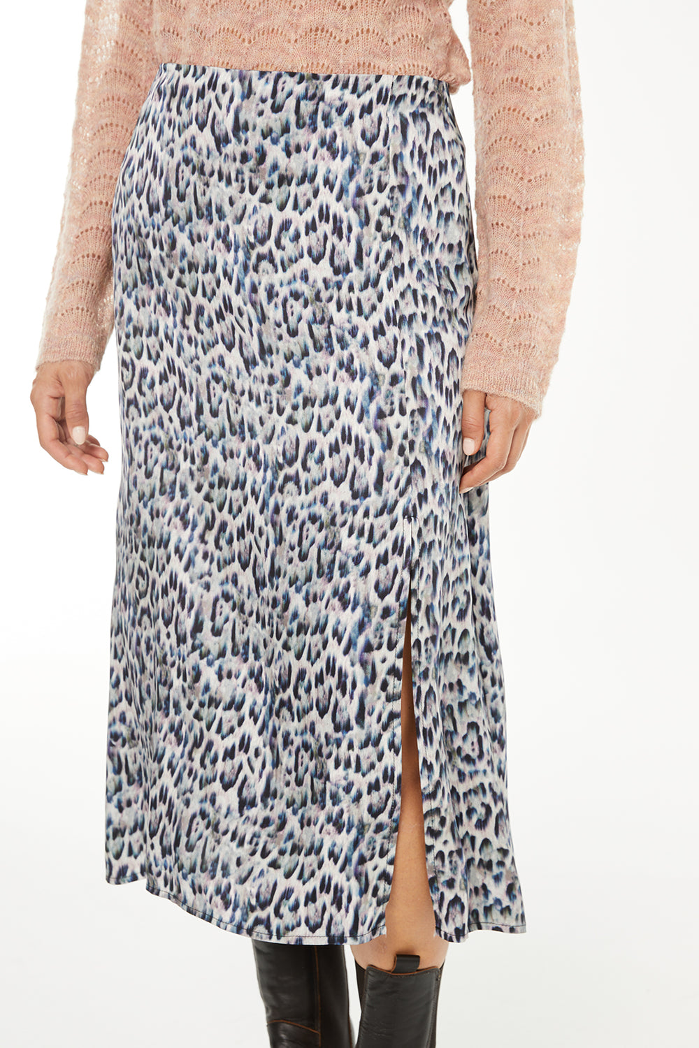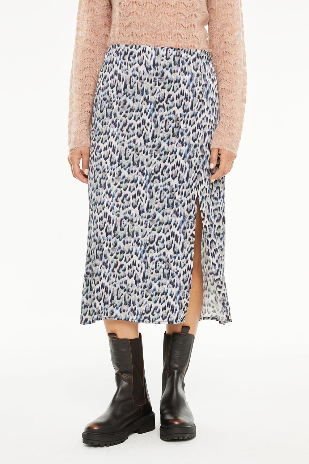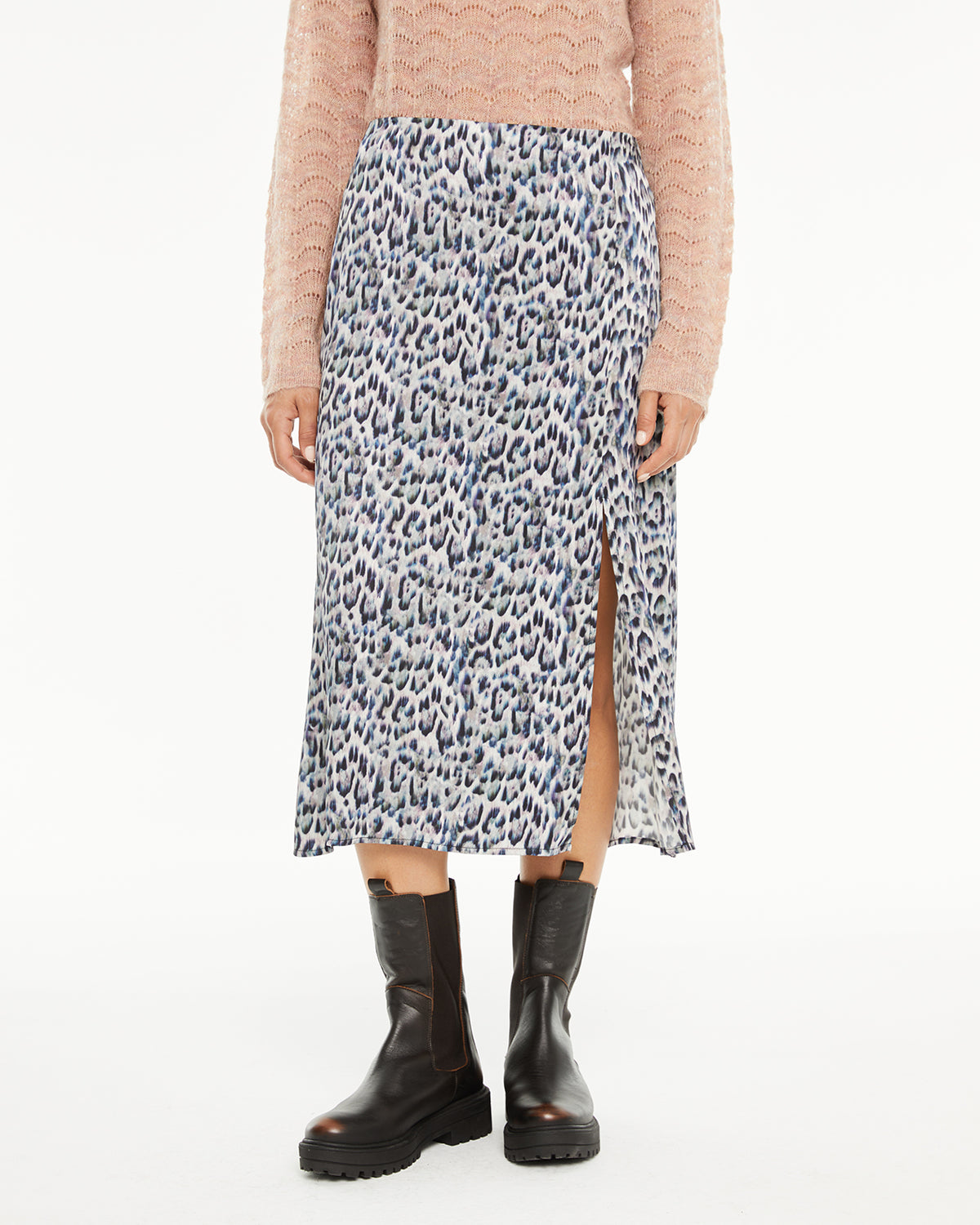Falda midi de mujer, con estampado animal print, detalle de frunce en el delantero y abertura. Prenda sostenible.