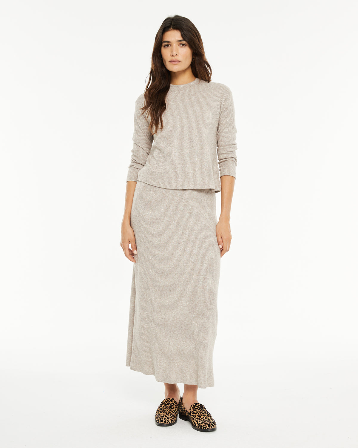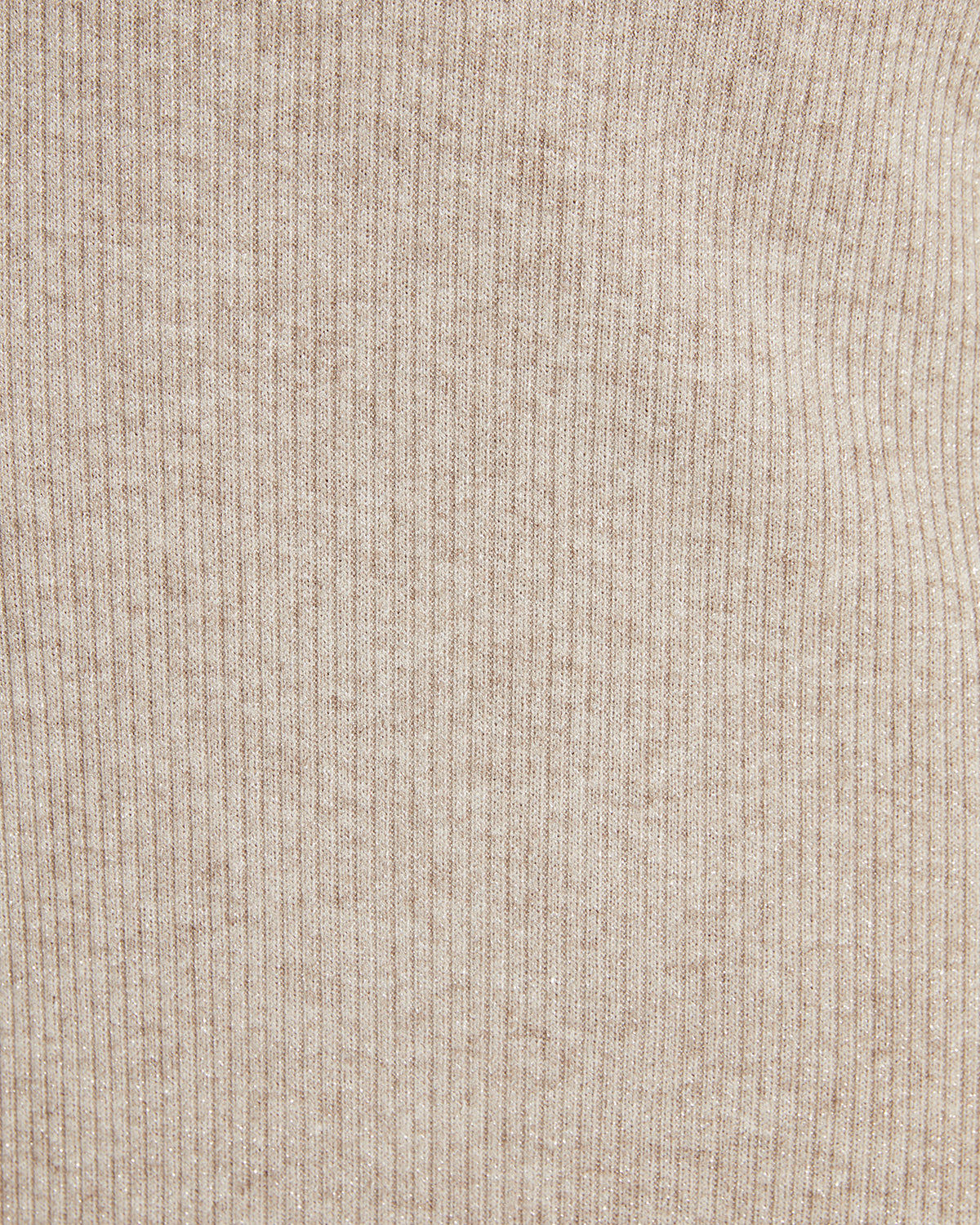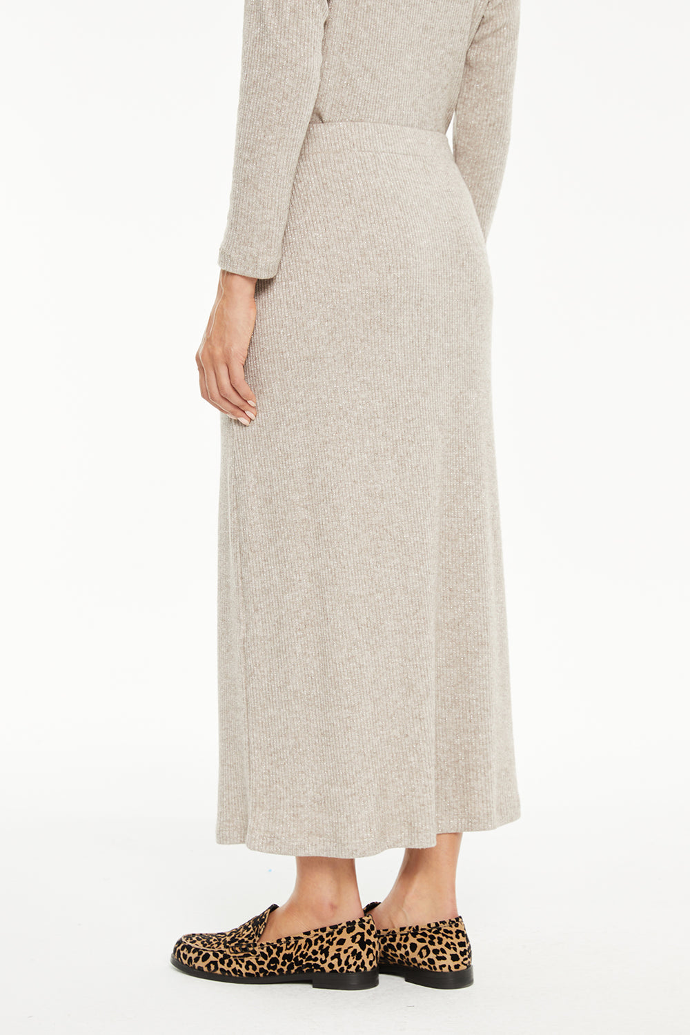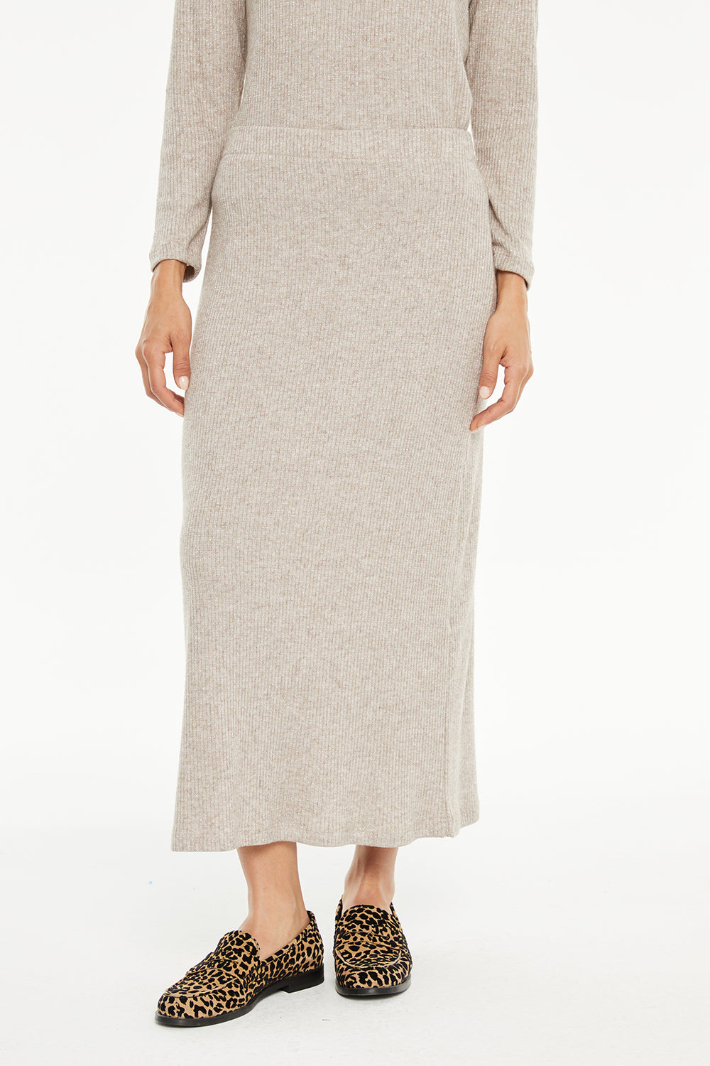Falda midi de mujer, con goma en la cintura y tejido de canalé con lúrex.