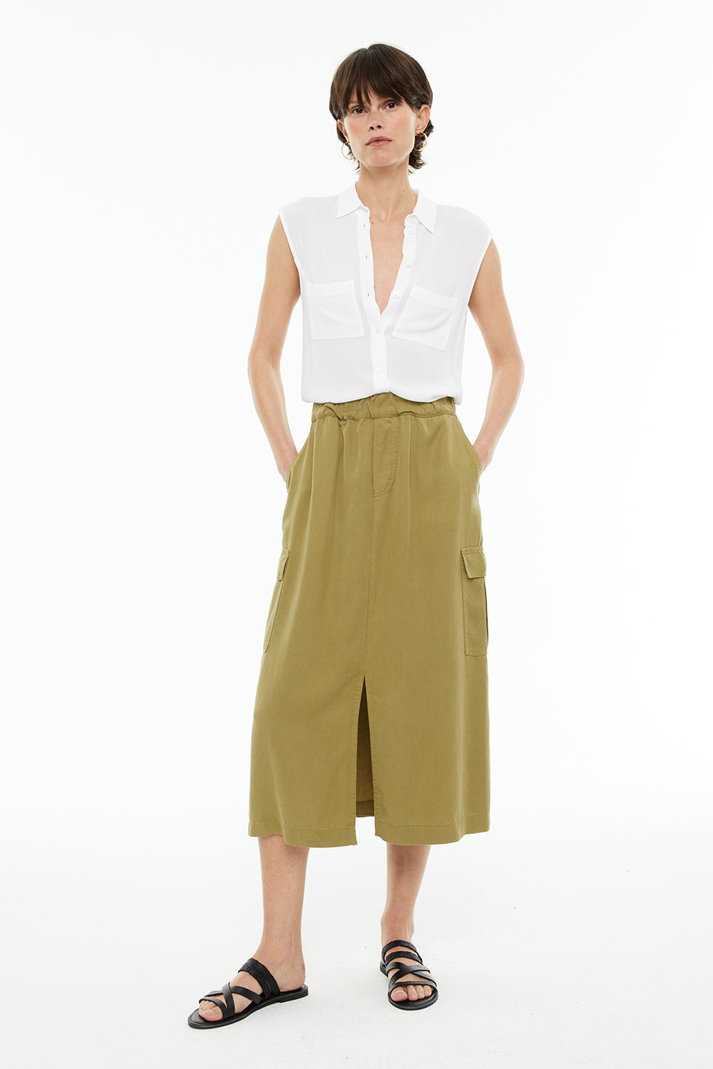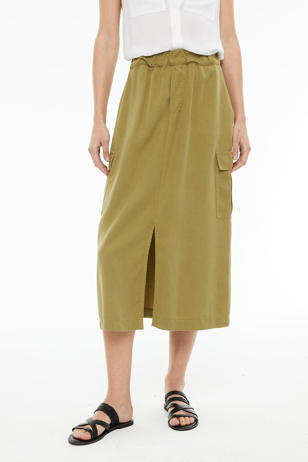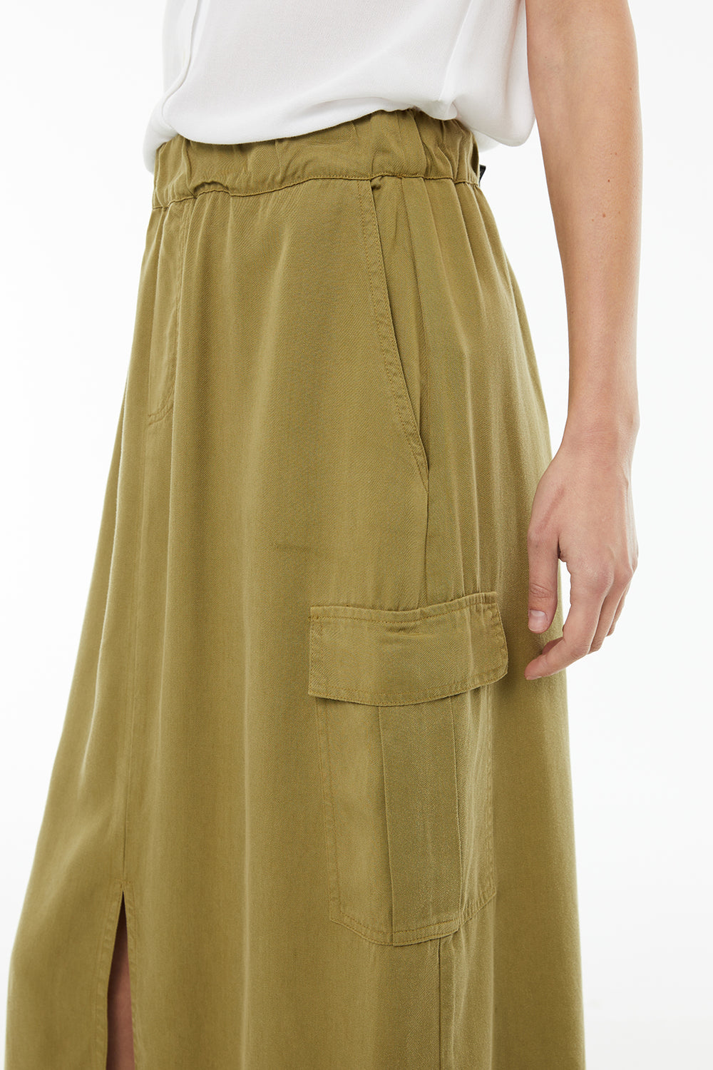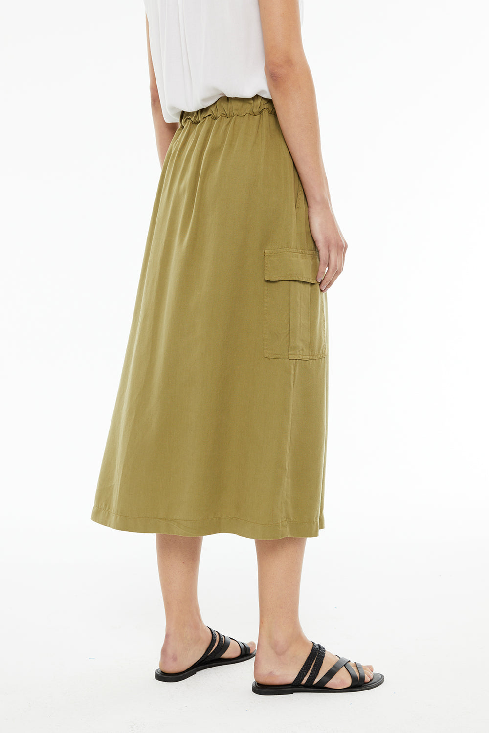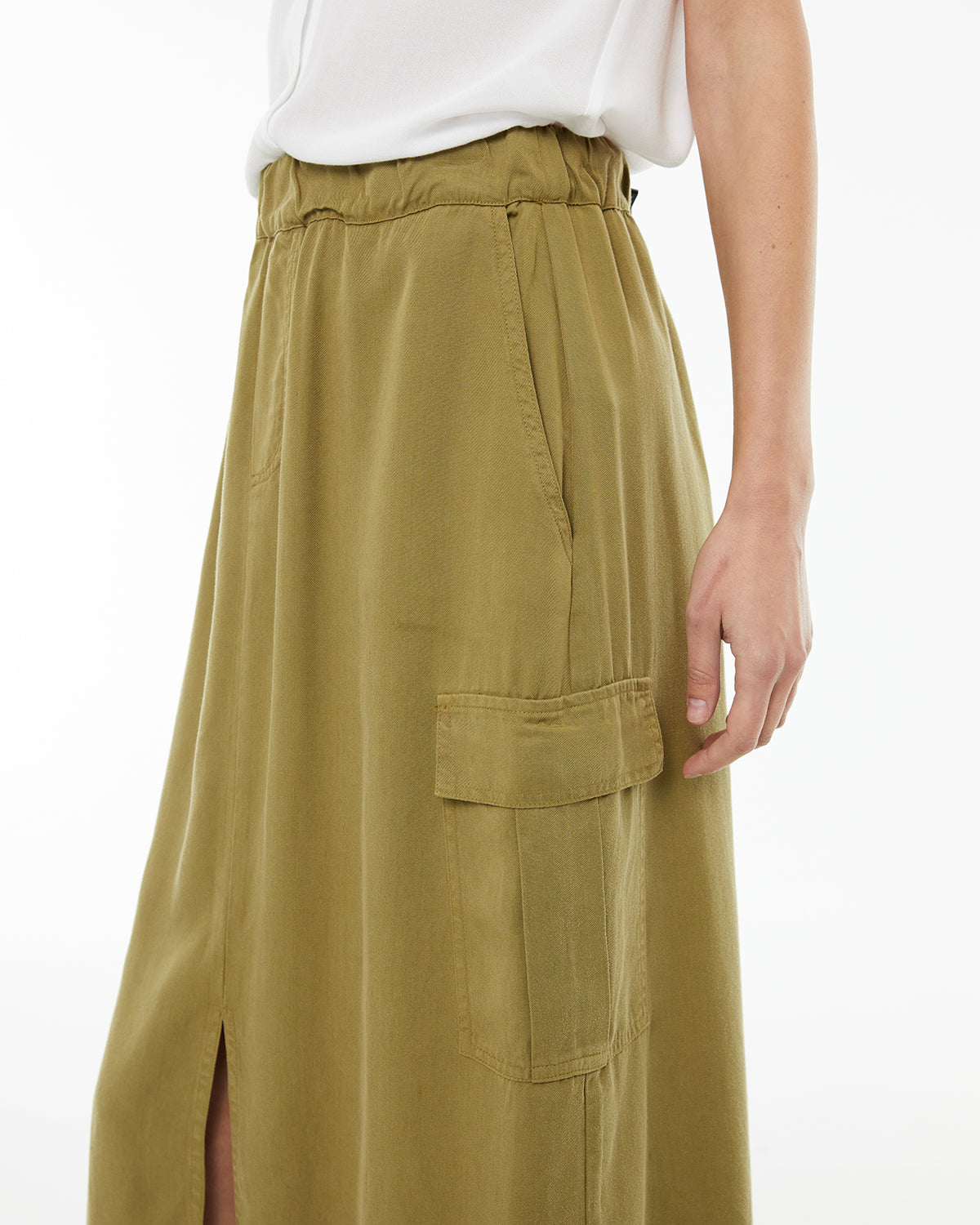 Falda de mujer midi, con bolsillos en los laterales tipo cargo, abertura en el delantero y cierre con goma. Prenda sostenible.