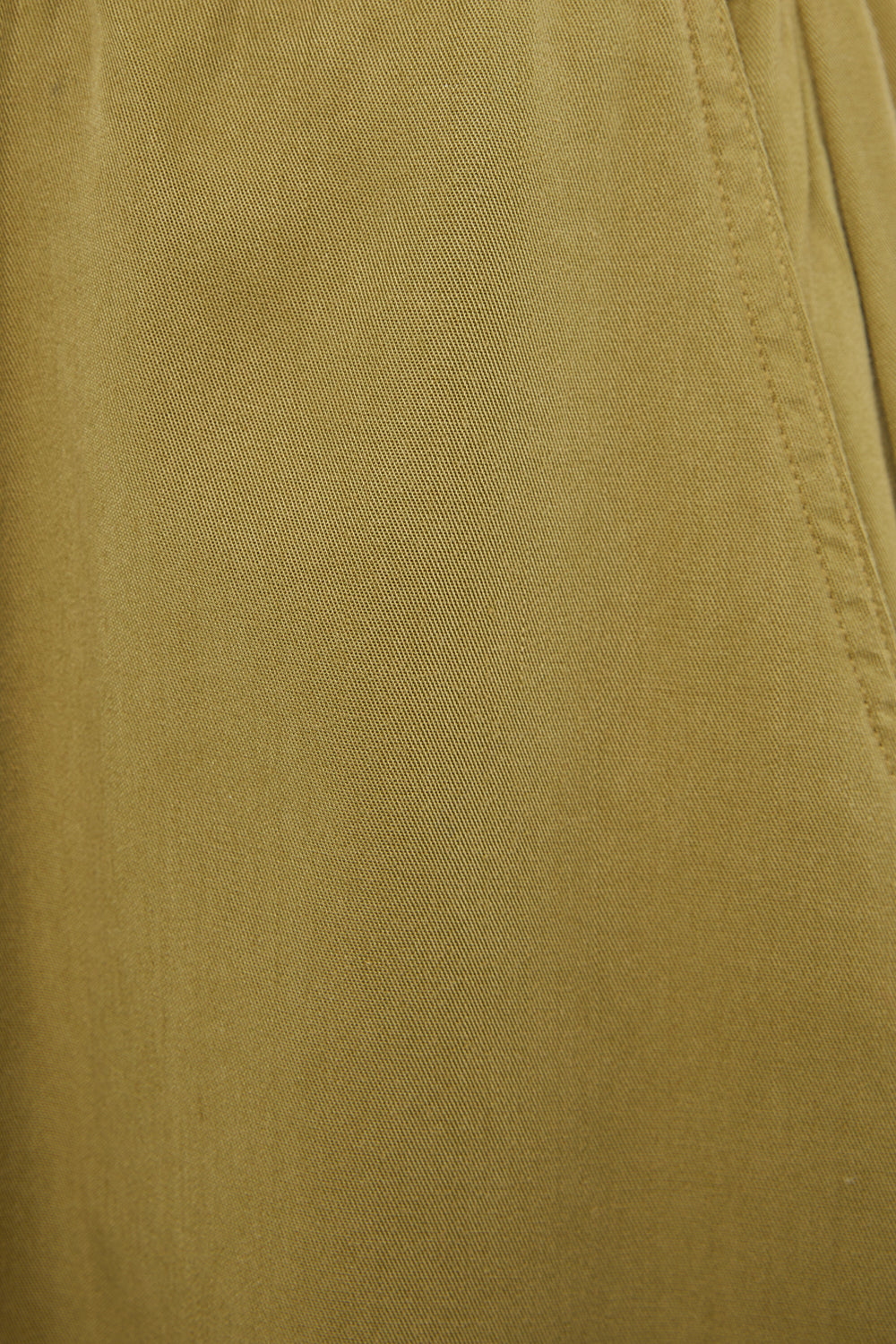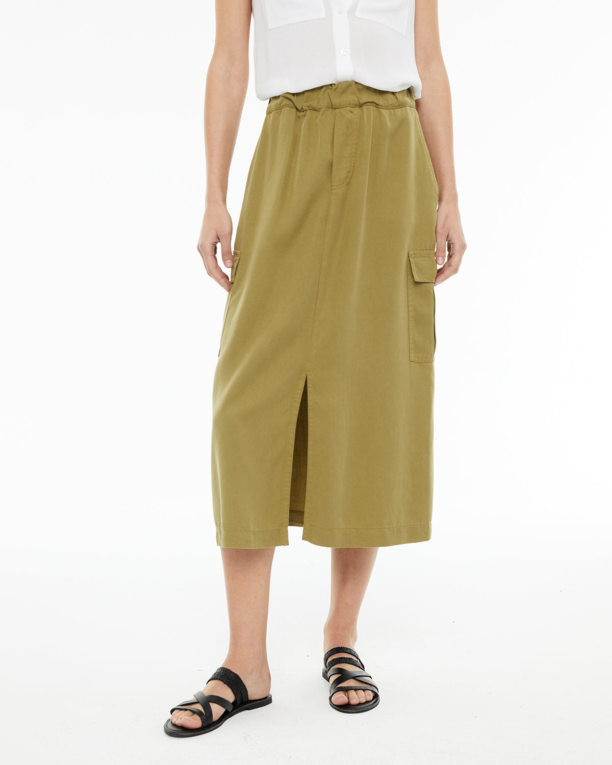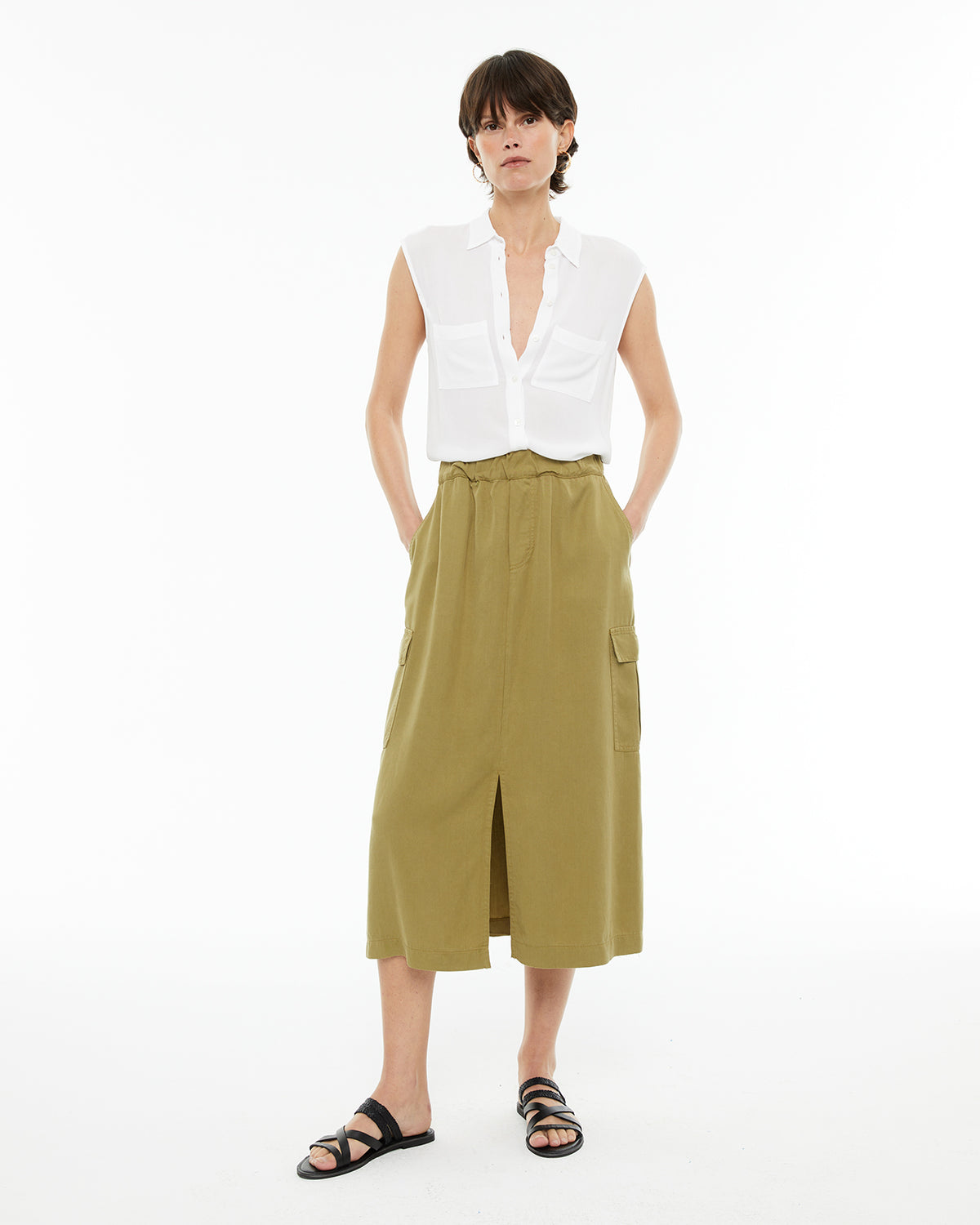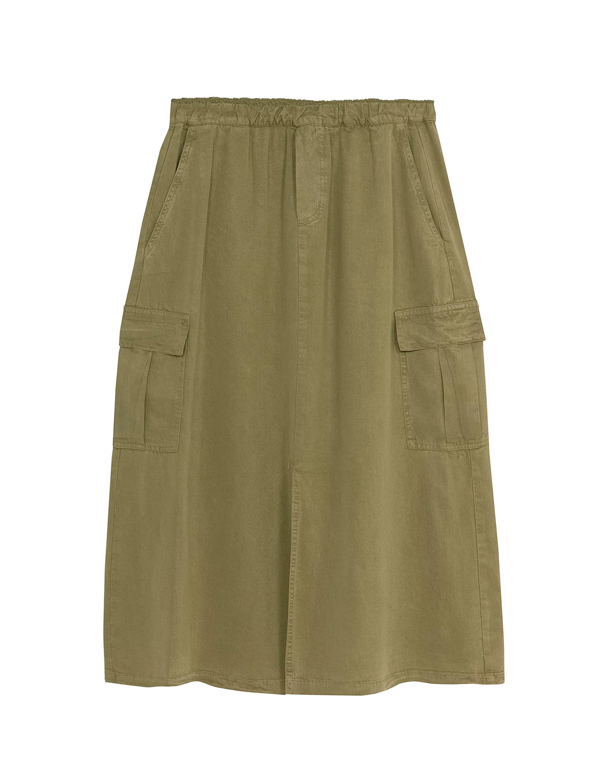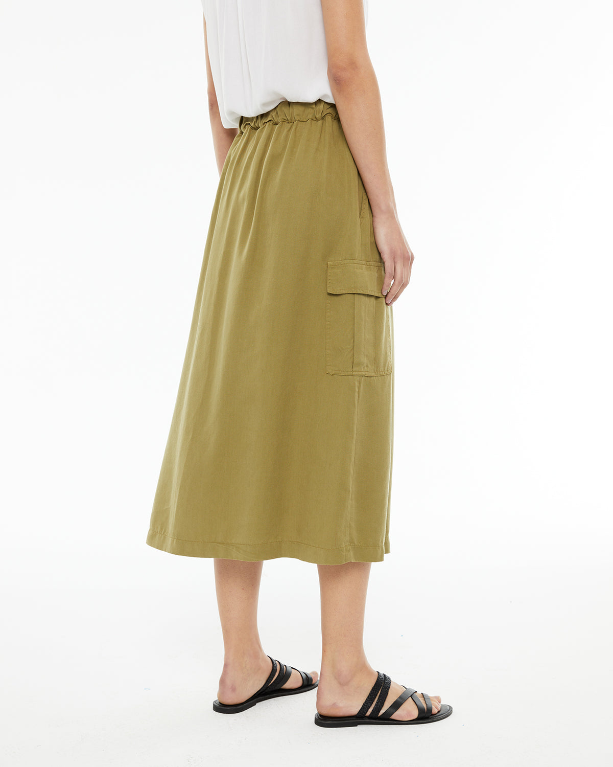 Falda de mujer midi, con bolsillos en los laterales tipo cargo, abertura en el delantero y cierre con goma. Prenda sostenible.