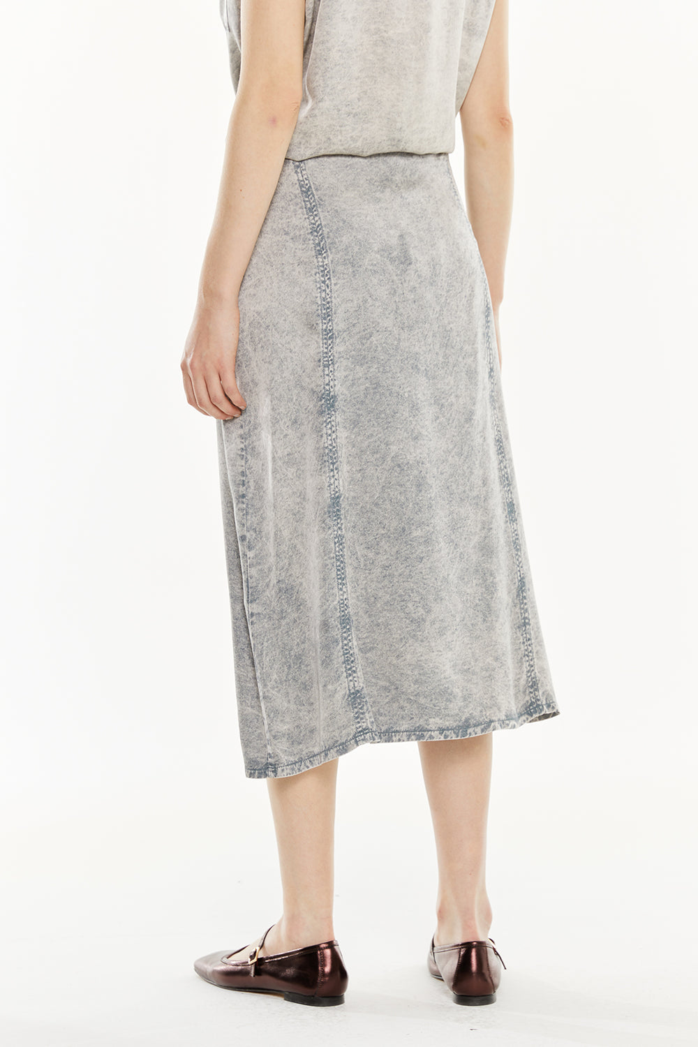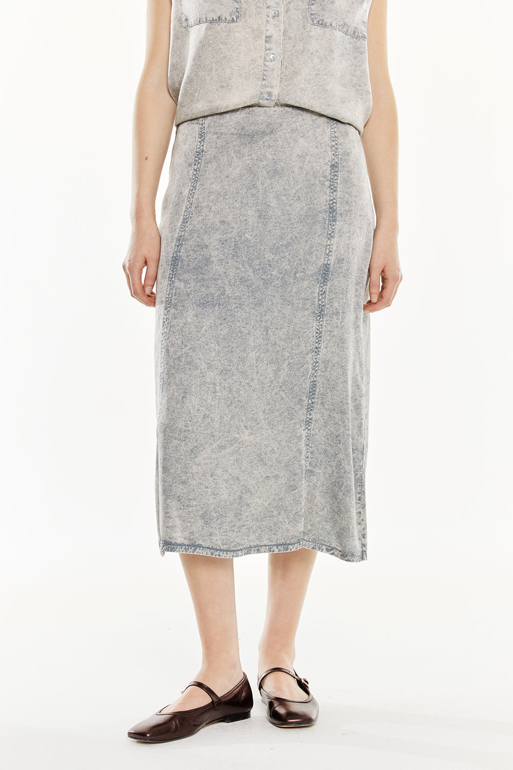 Falda de mujer con cremallera lateral, detalle de costuras en el delantero y tintura en corrosivos. Prenda sostenible.