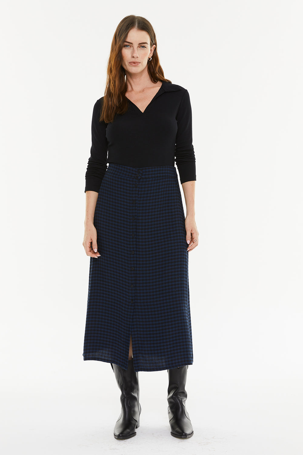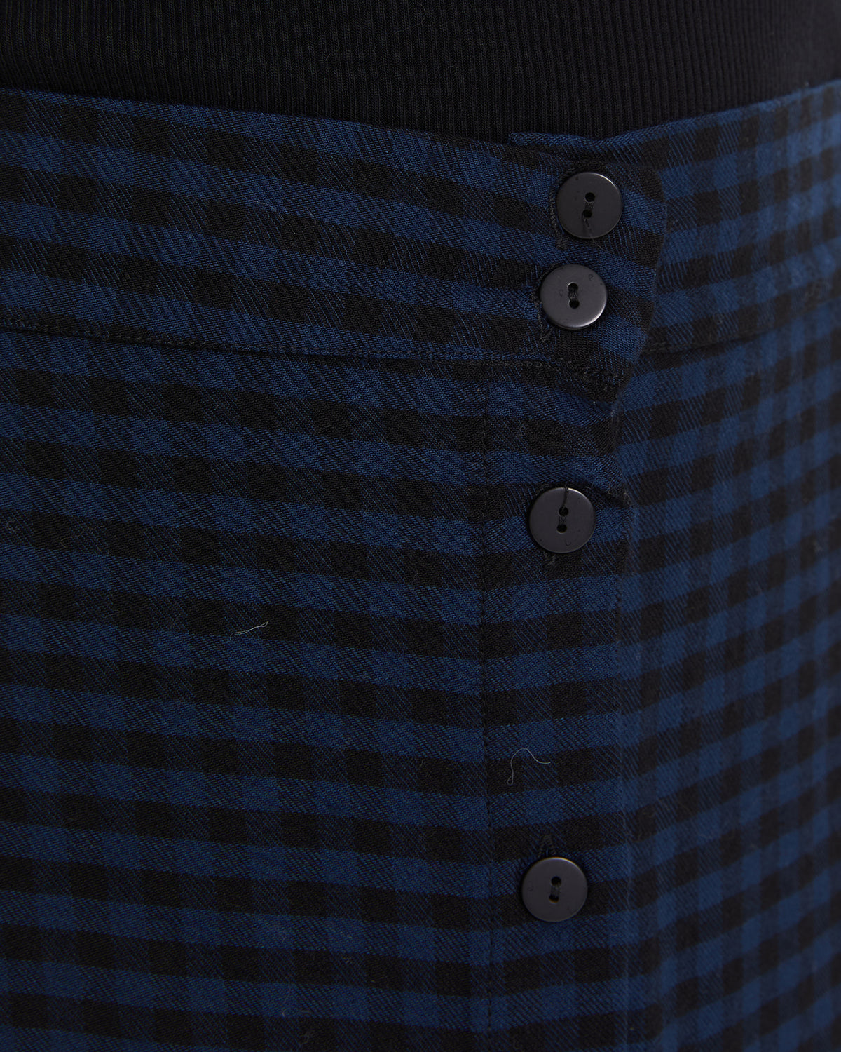 Falda midi de mujer con tejido de cuadros, goma en la espalda y detalle de botones en el delantero. Prenda sostenible.