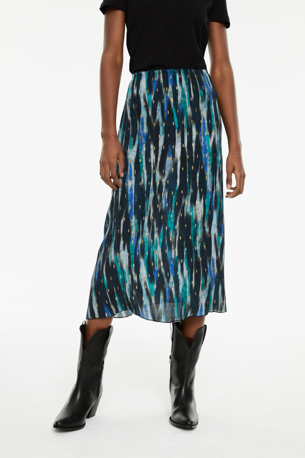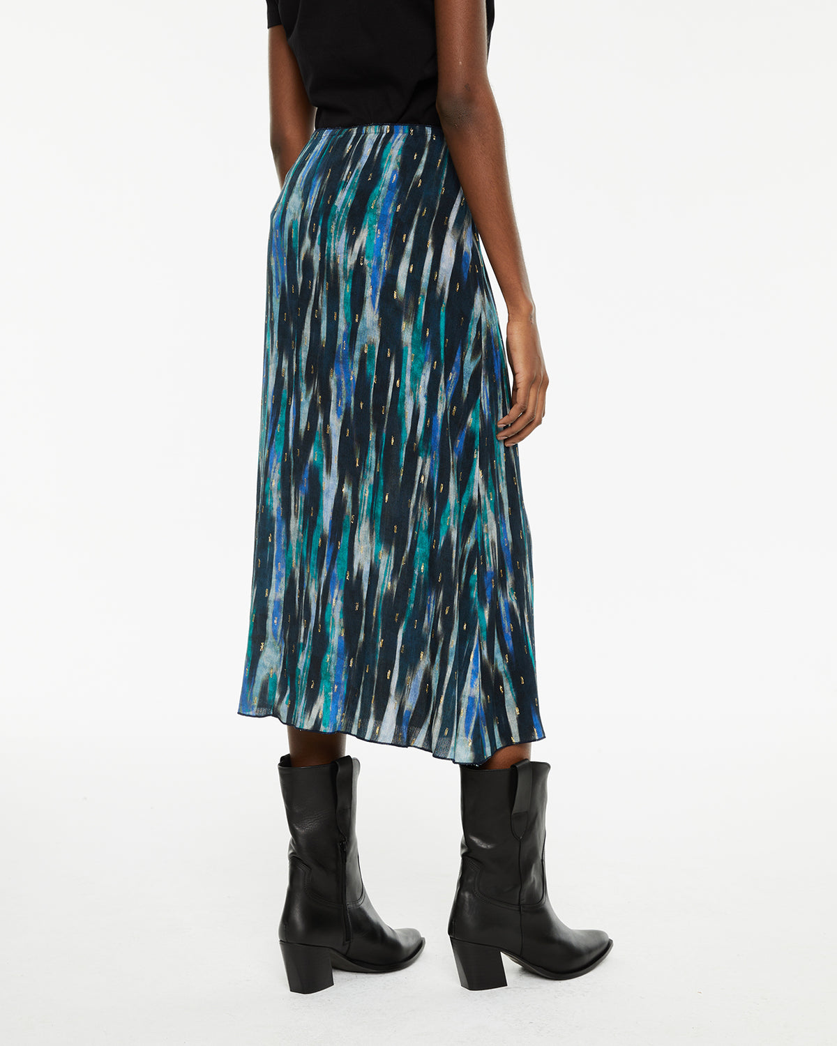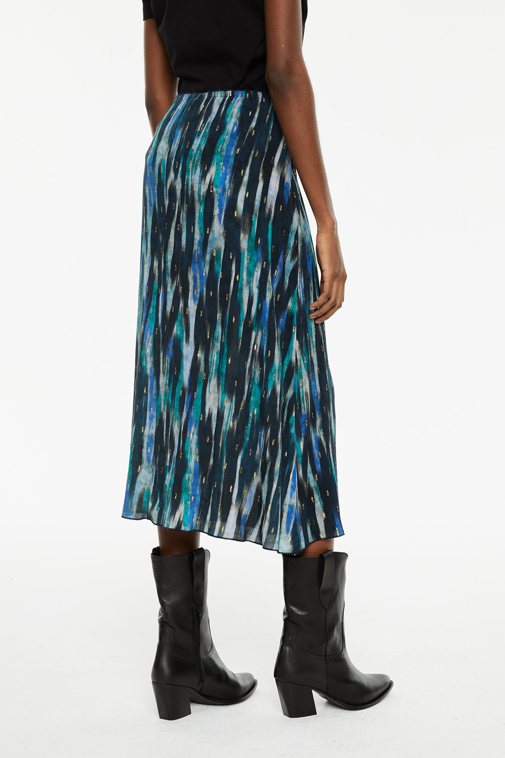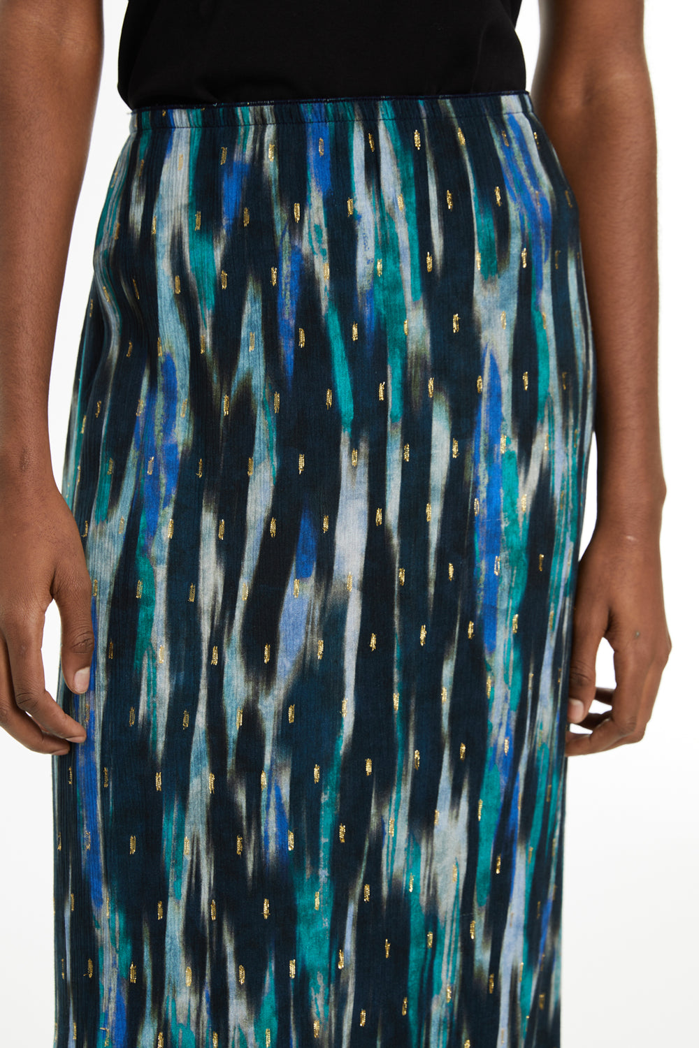 Falda de mujer midi con un estampado de aguas azules con un tejido de lágrimas de lurex. Cierre de cremallera lateral.