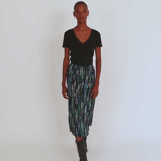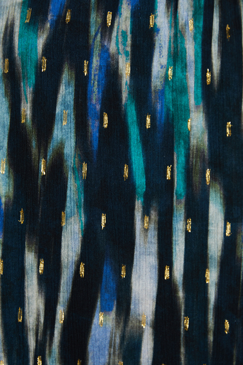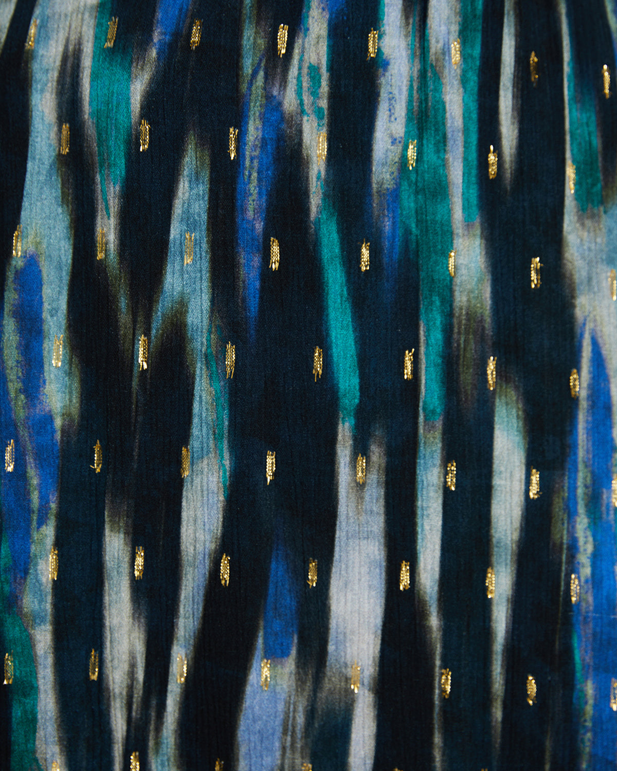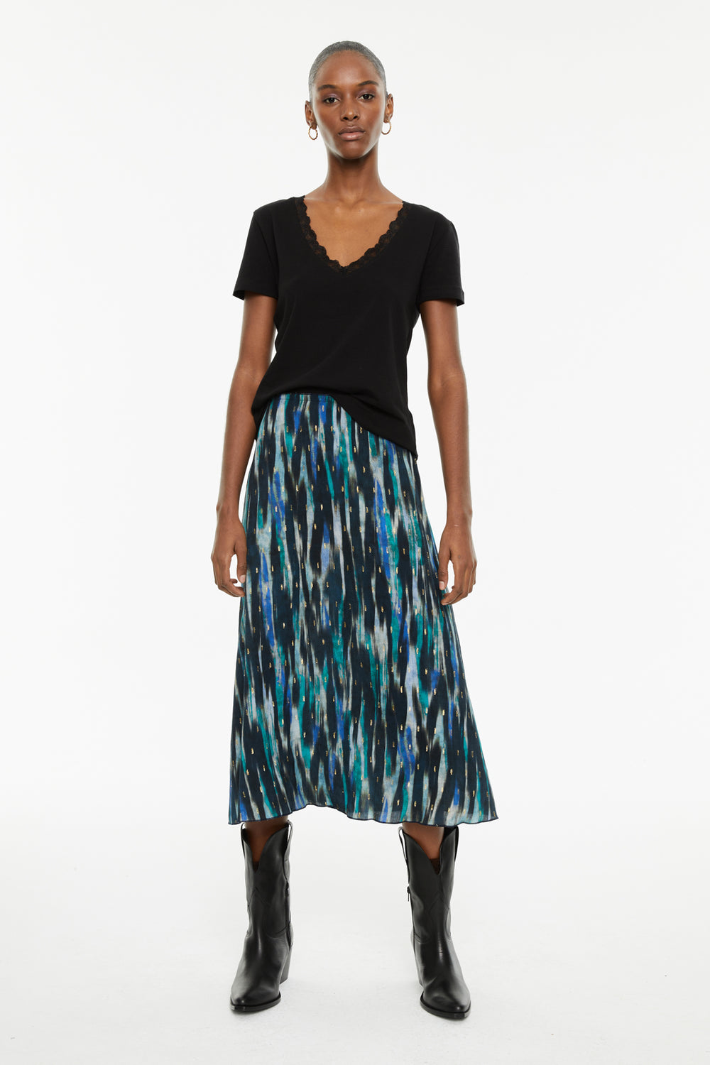 Falda de mujer midi con un estampado de aguas azules con un tejido de lágrimas de lurex. Cierre de cremallera lateral.
