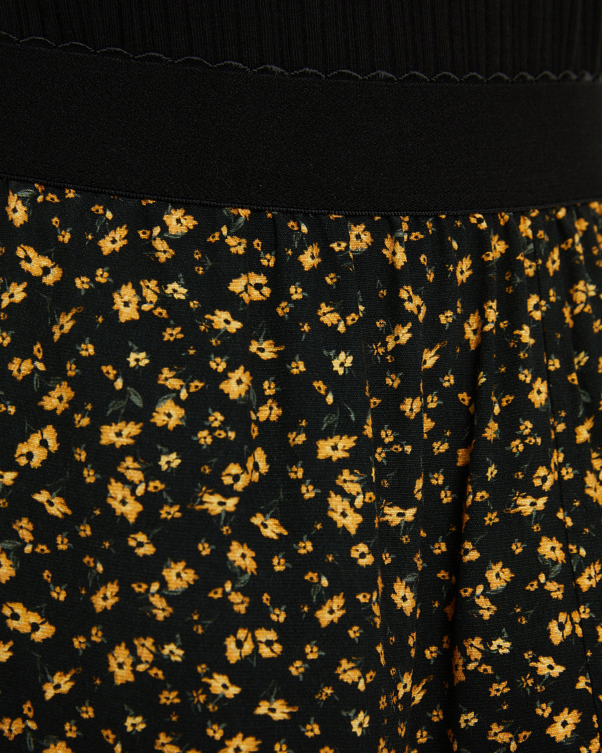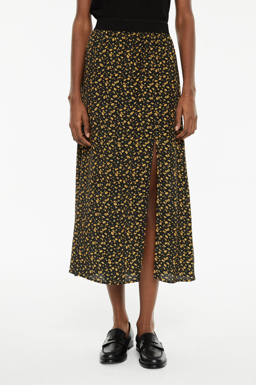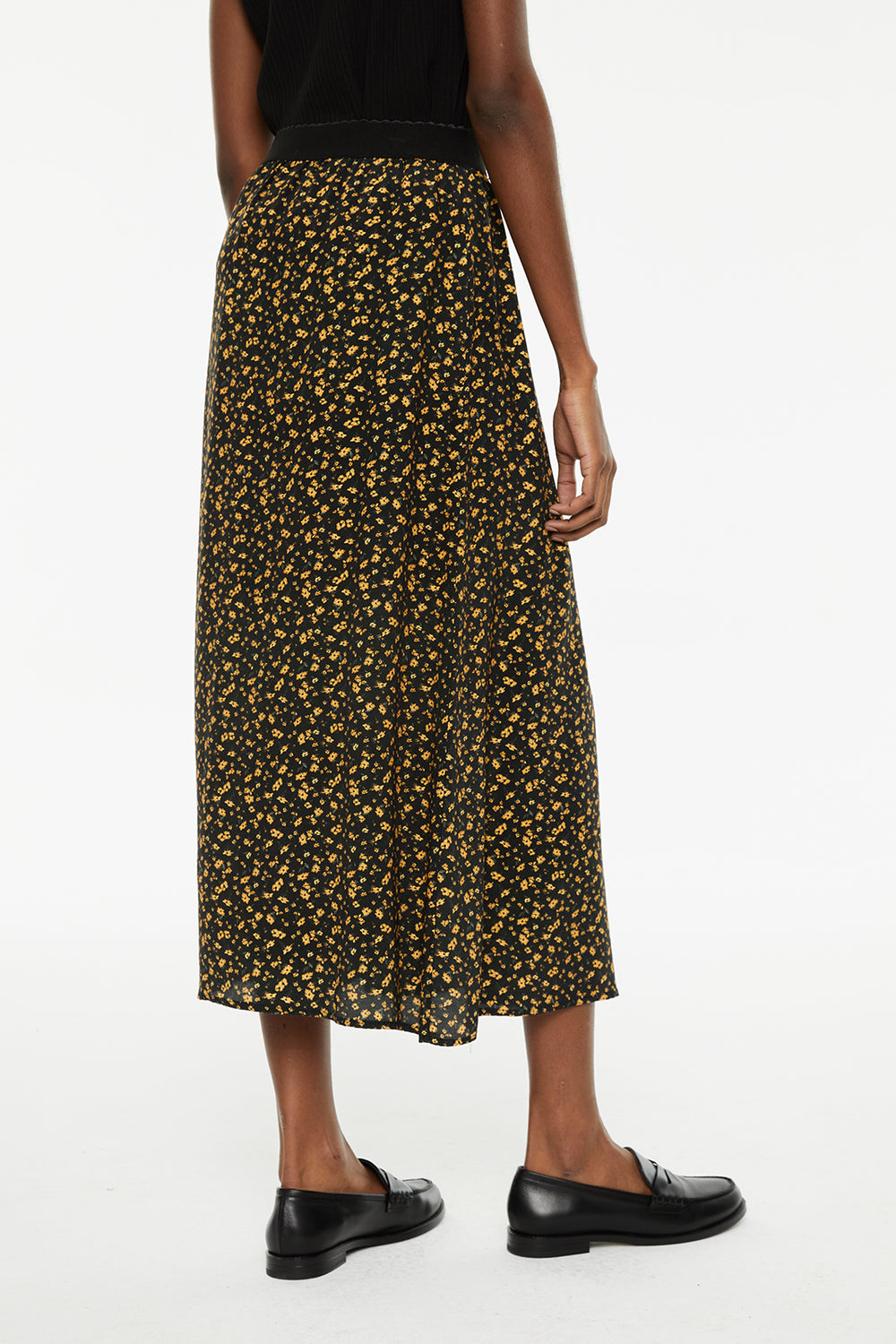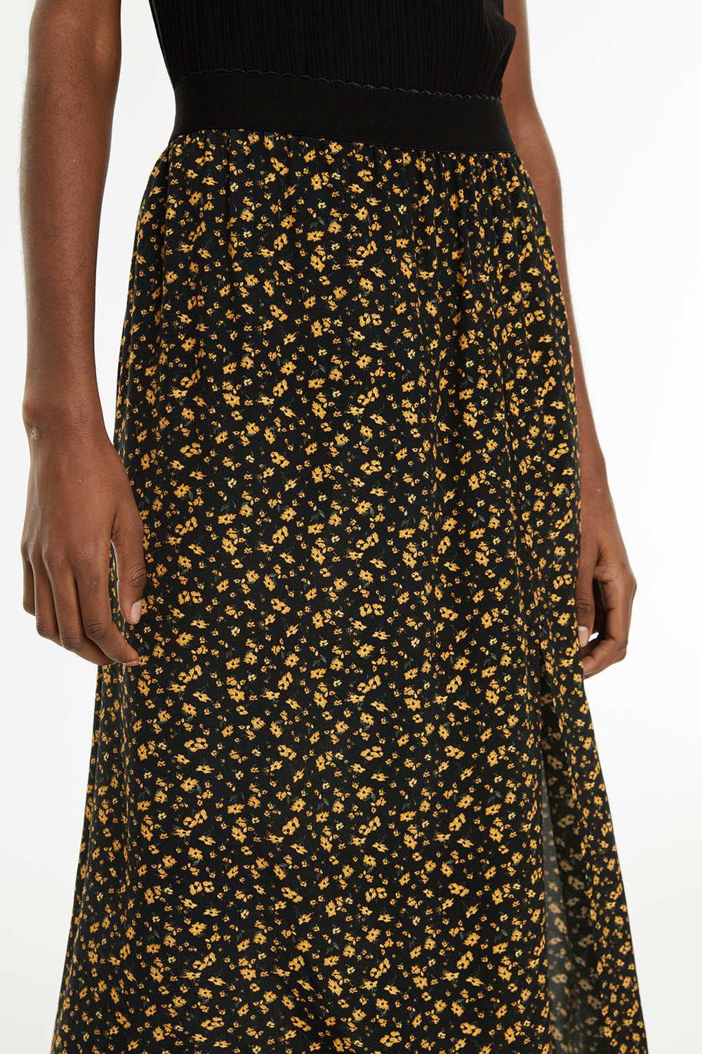 Falda de mujer midi, evasé, estampado floral com goma en la cintura .Prenda sostenible.