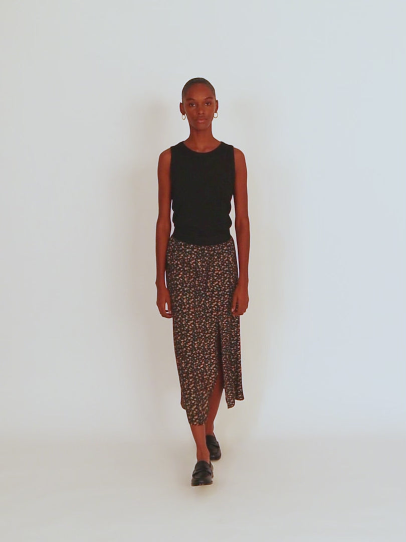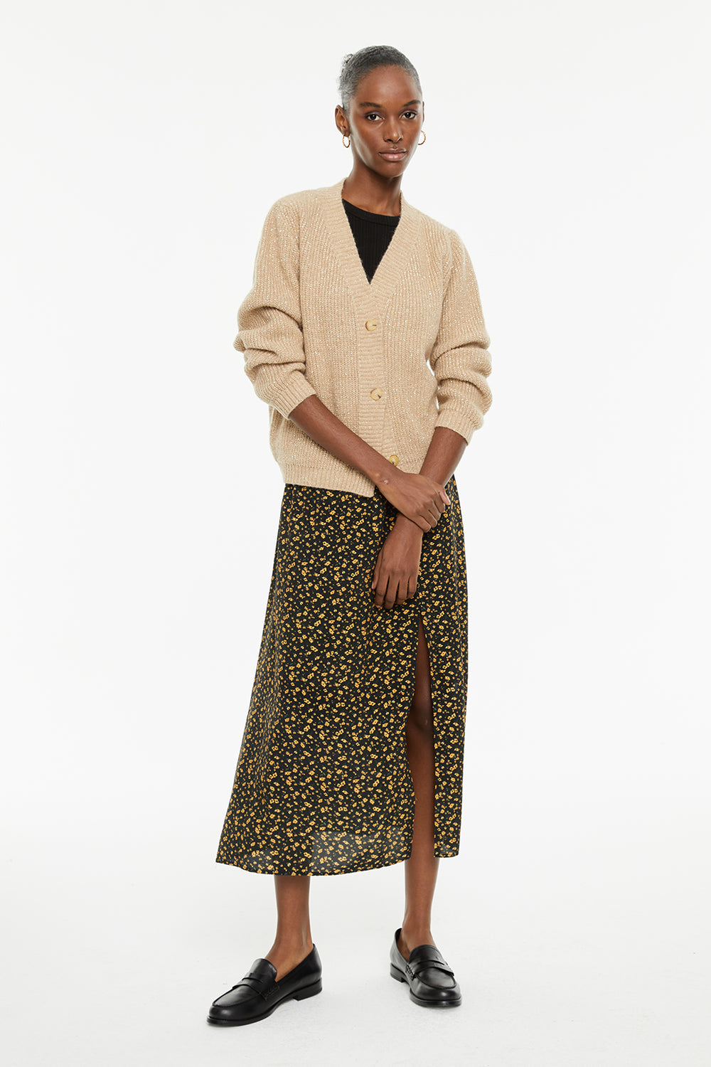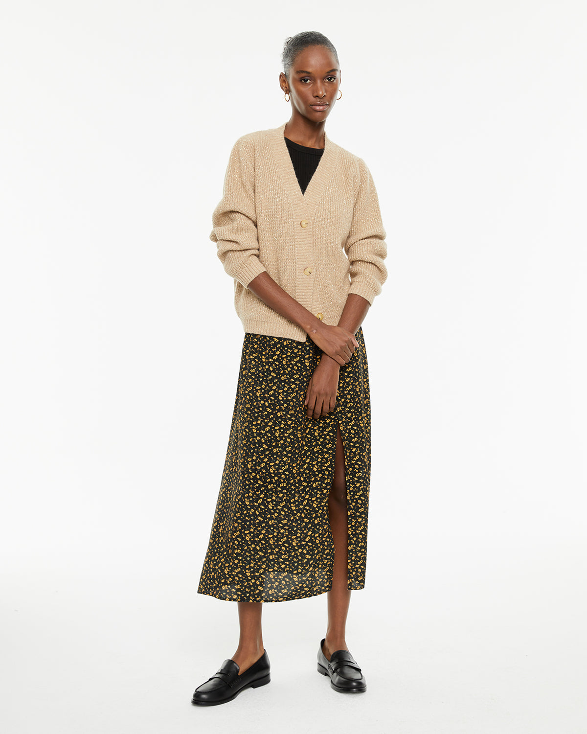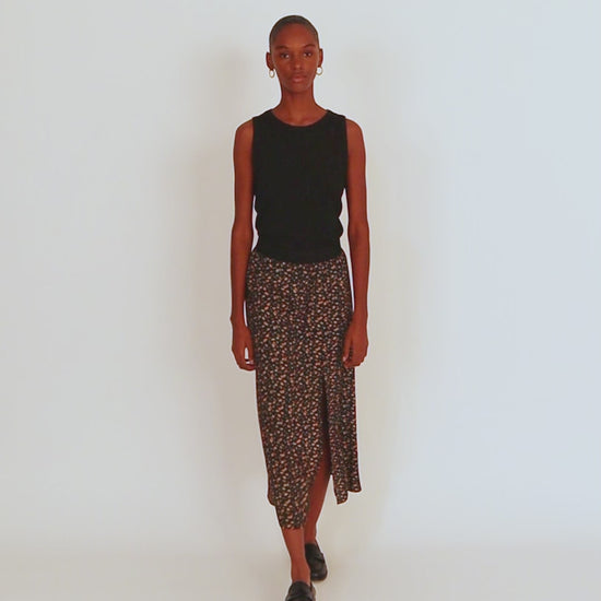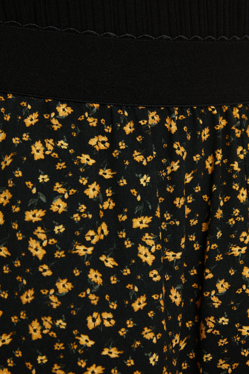 Falda de mujer midi, evasé, estampado floral com goma en la cintura .Prenda sostenible.