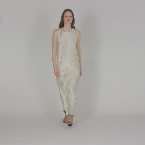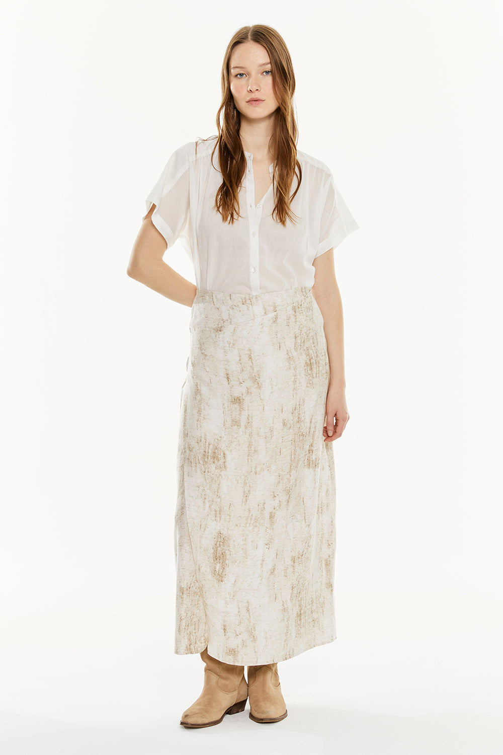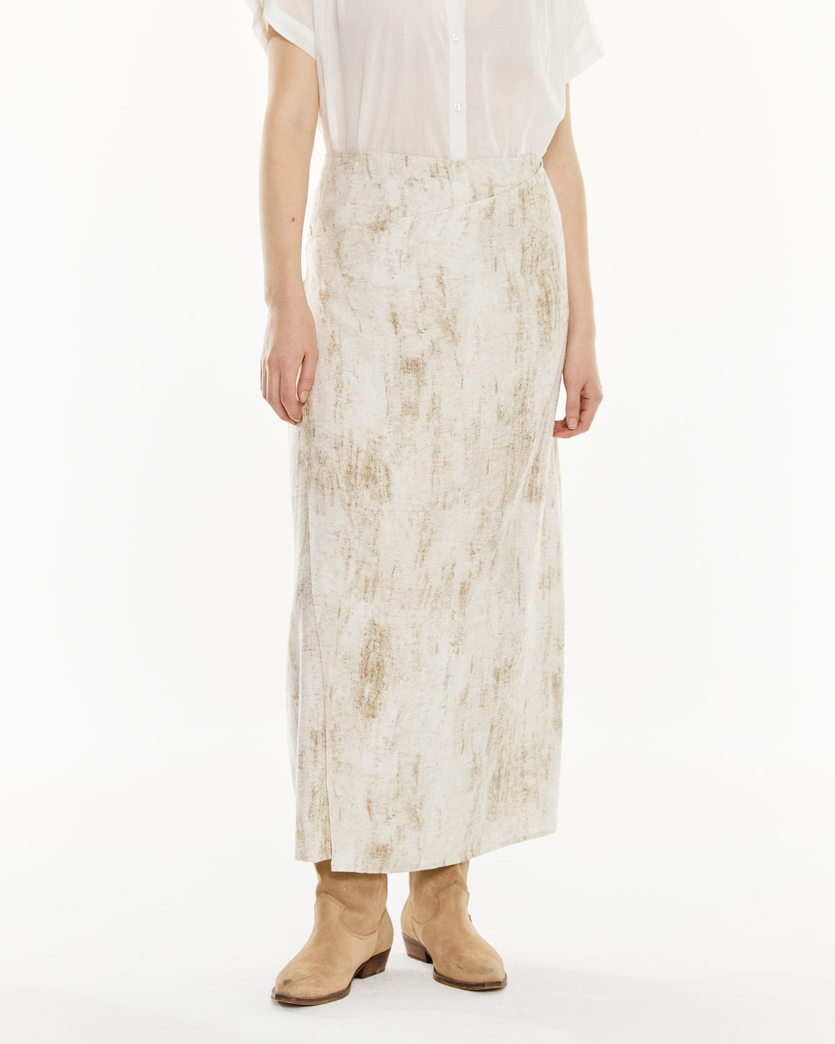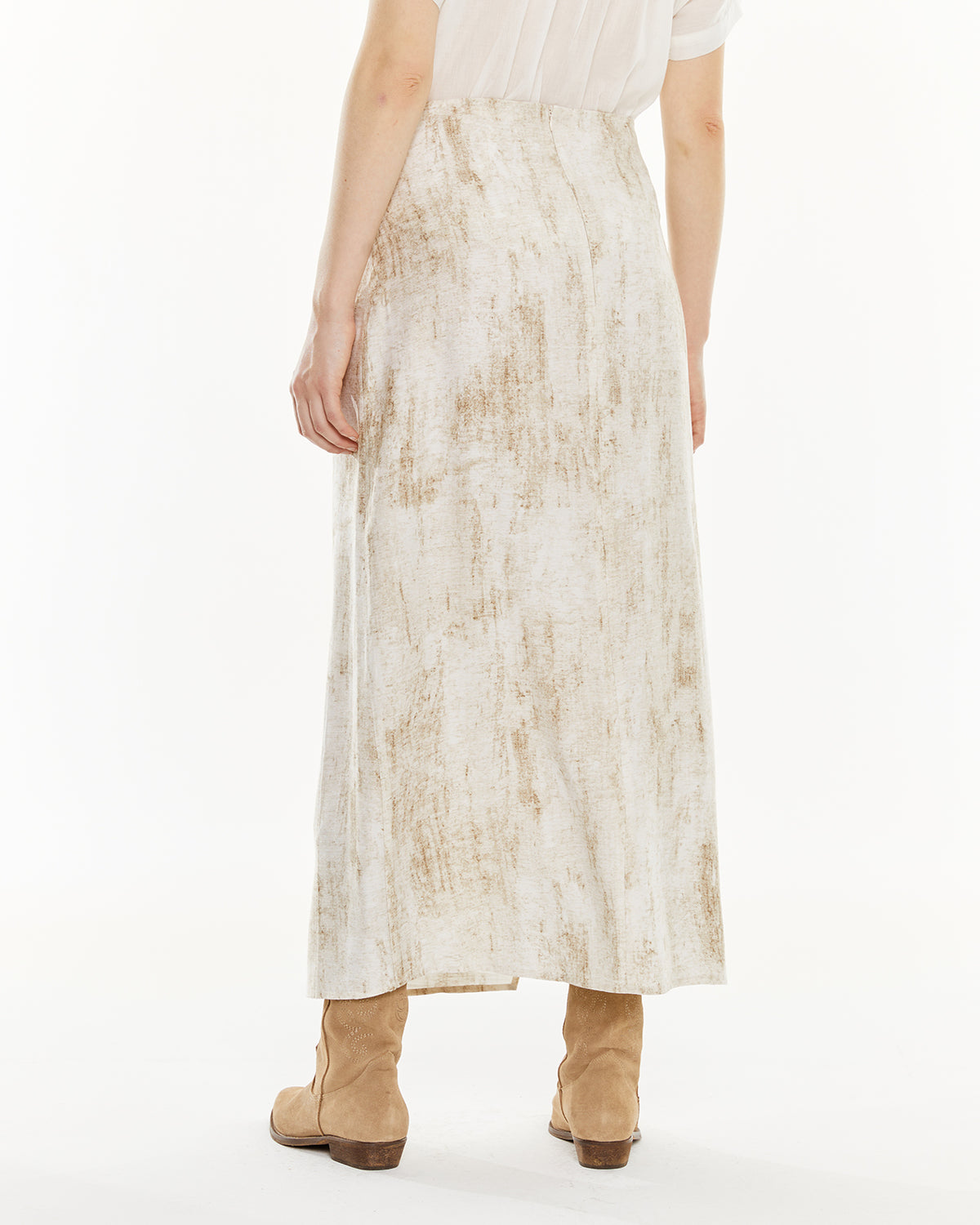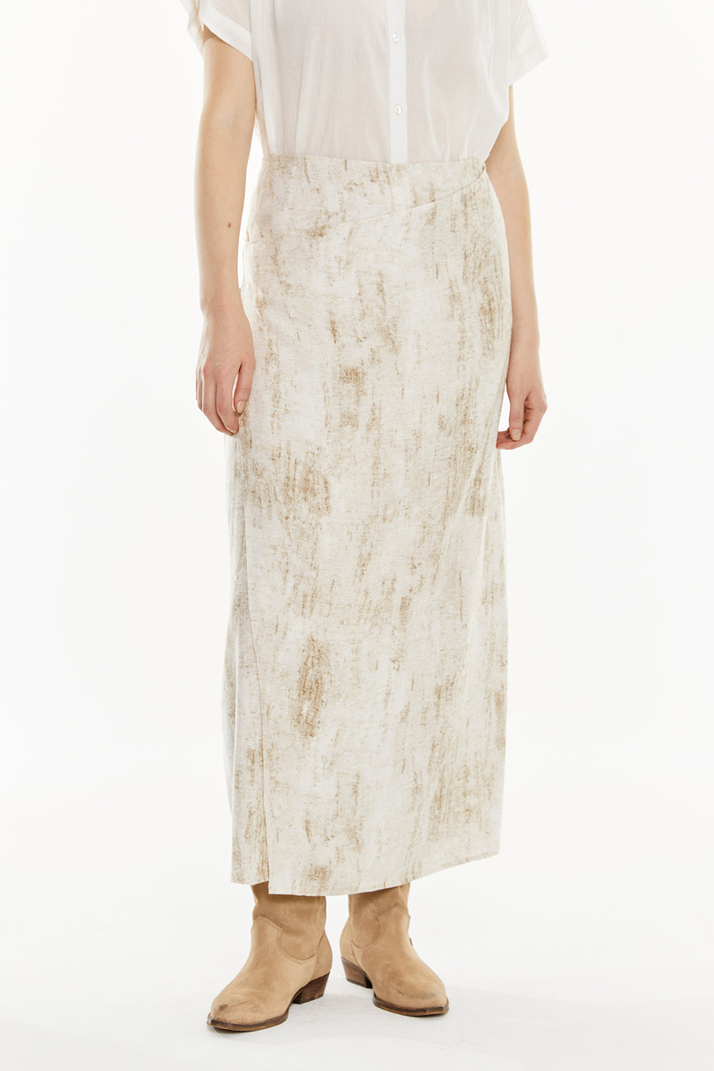 Falda midi tipo pareo de mujer con estampado tie-dye y cierre con cremallera lateral. Prenda sostenible.