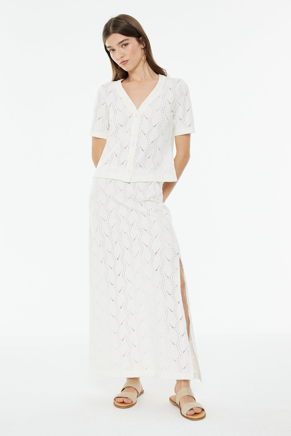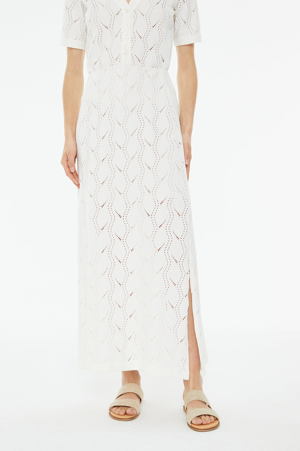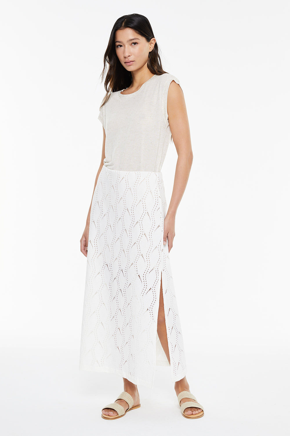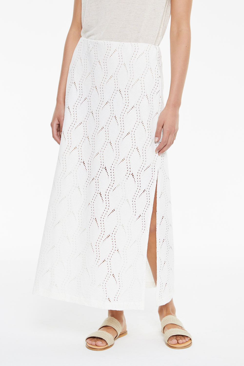 Falda de mujer midi calada, con goma en la cintura y detalle de abertura en costura lateral. Prenda sostenible.